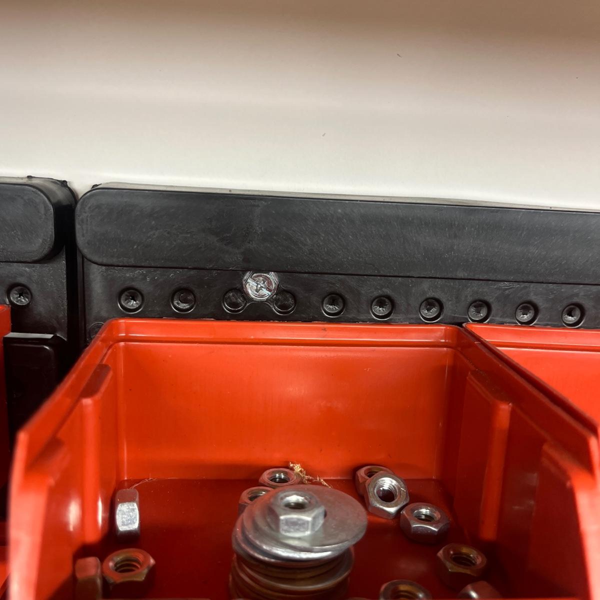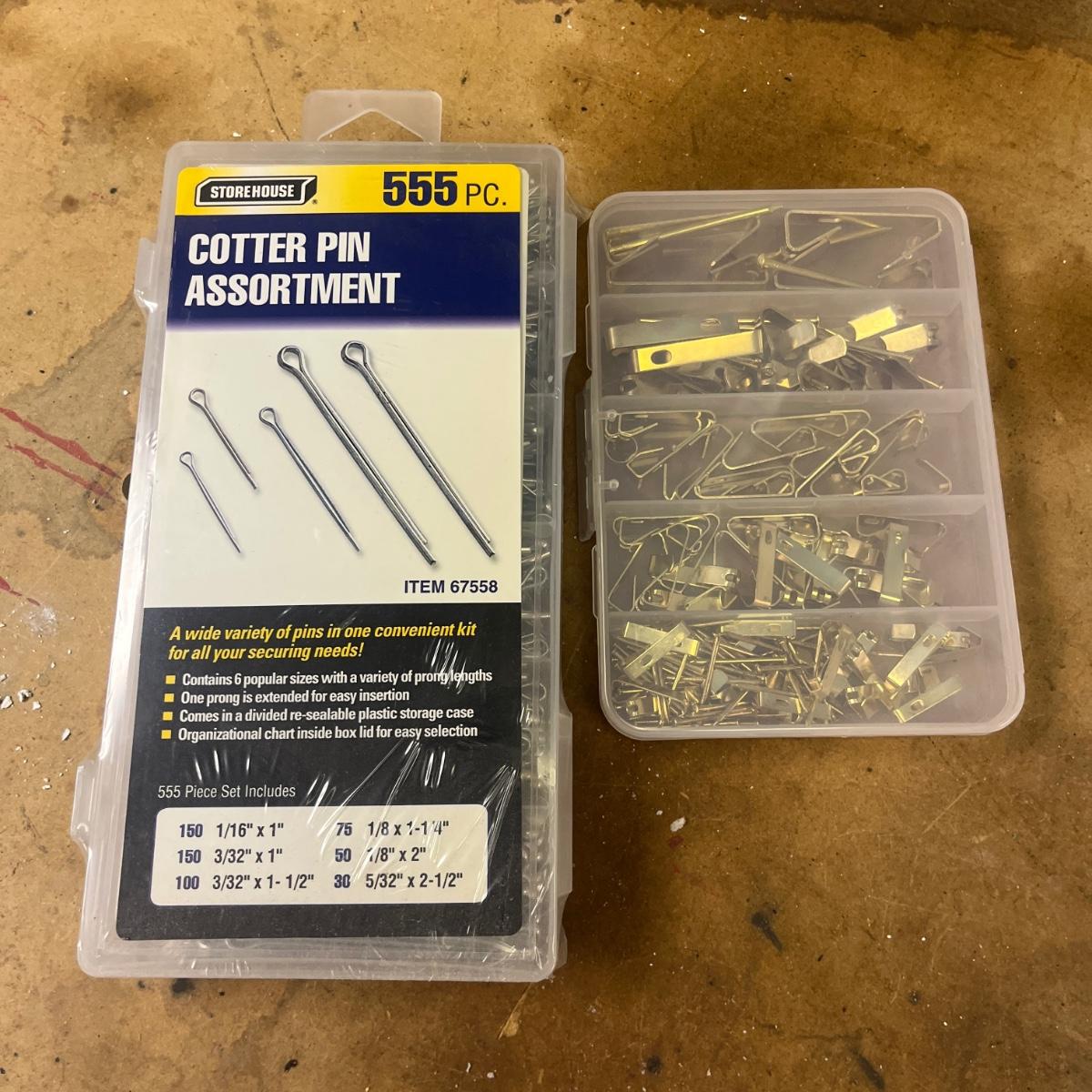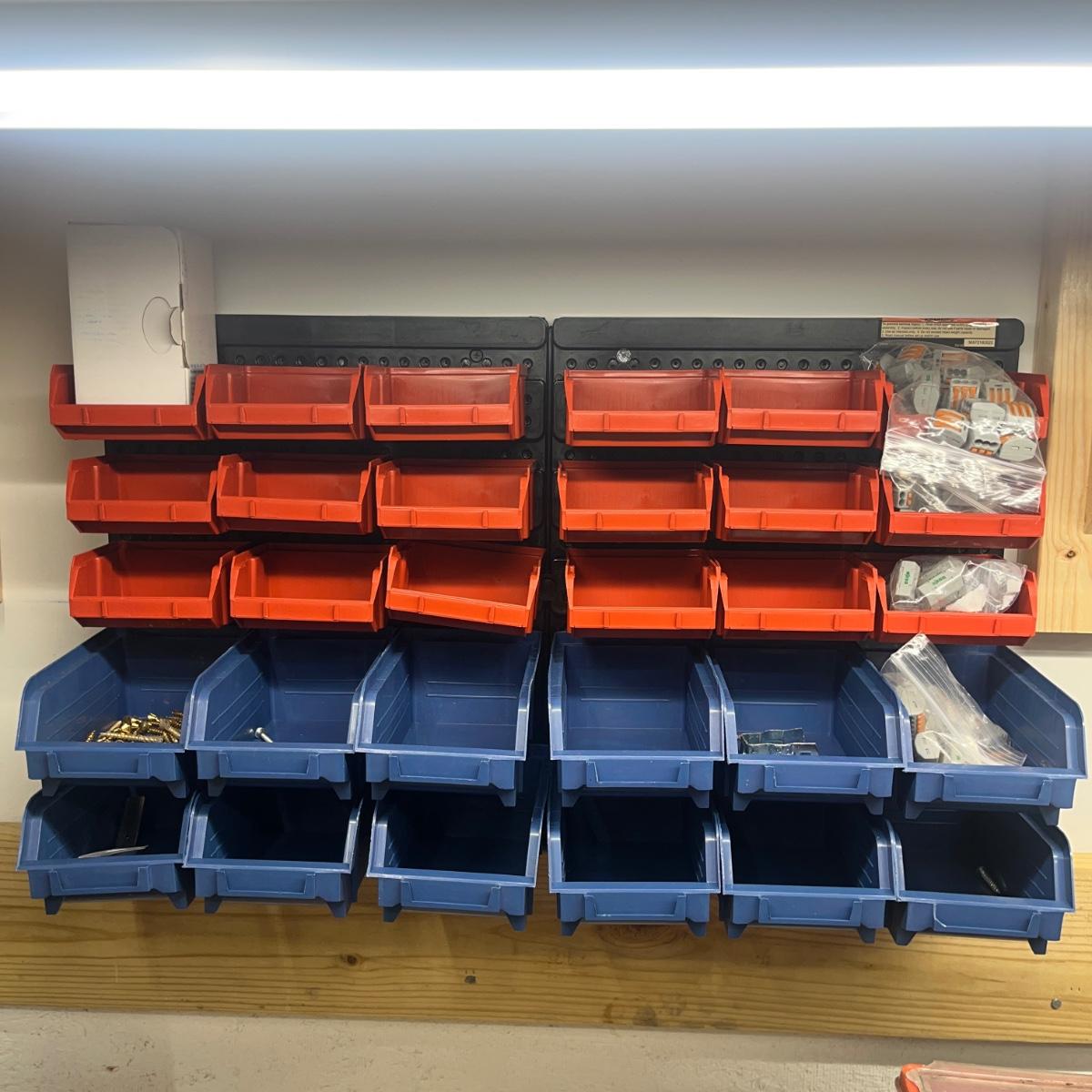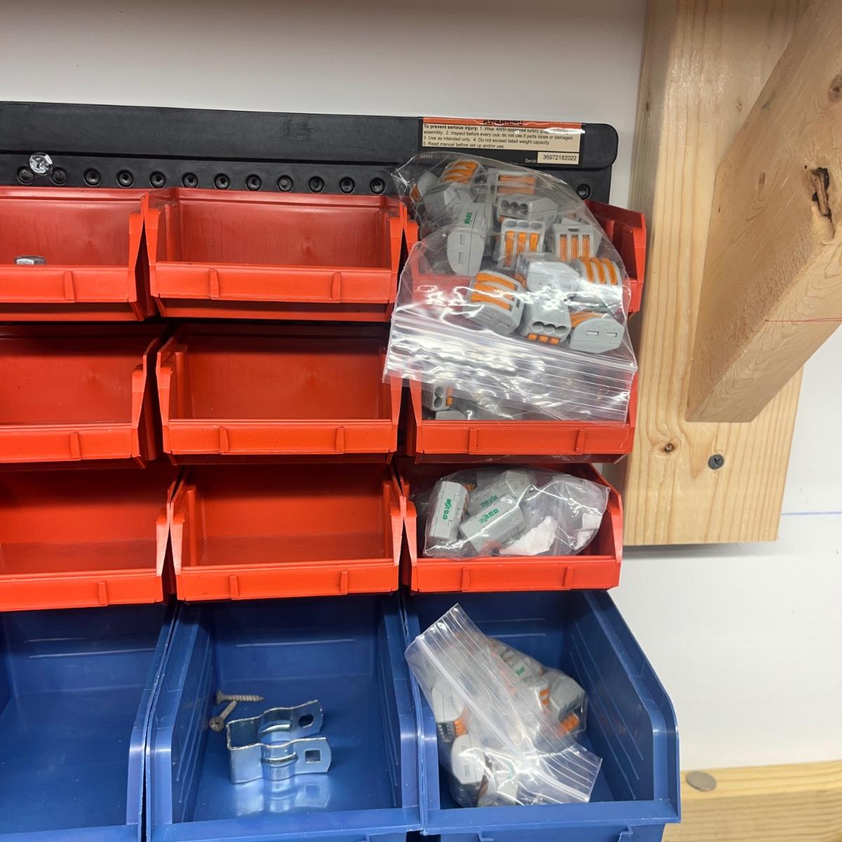 Lot contains a metal parts bin with plastic drawers and the contents that includes springs, anchors, screws, tacks, washers, picture hangers and more. Also includes a plastic parts bin with contents. Both items will need to be removed from wall by winning bidder with Phillips screwdriver. Metal and plastic bin measure 12” x 6” x 22”H and plastic bin measures 24” x 7” x 15”H.