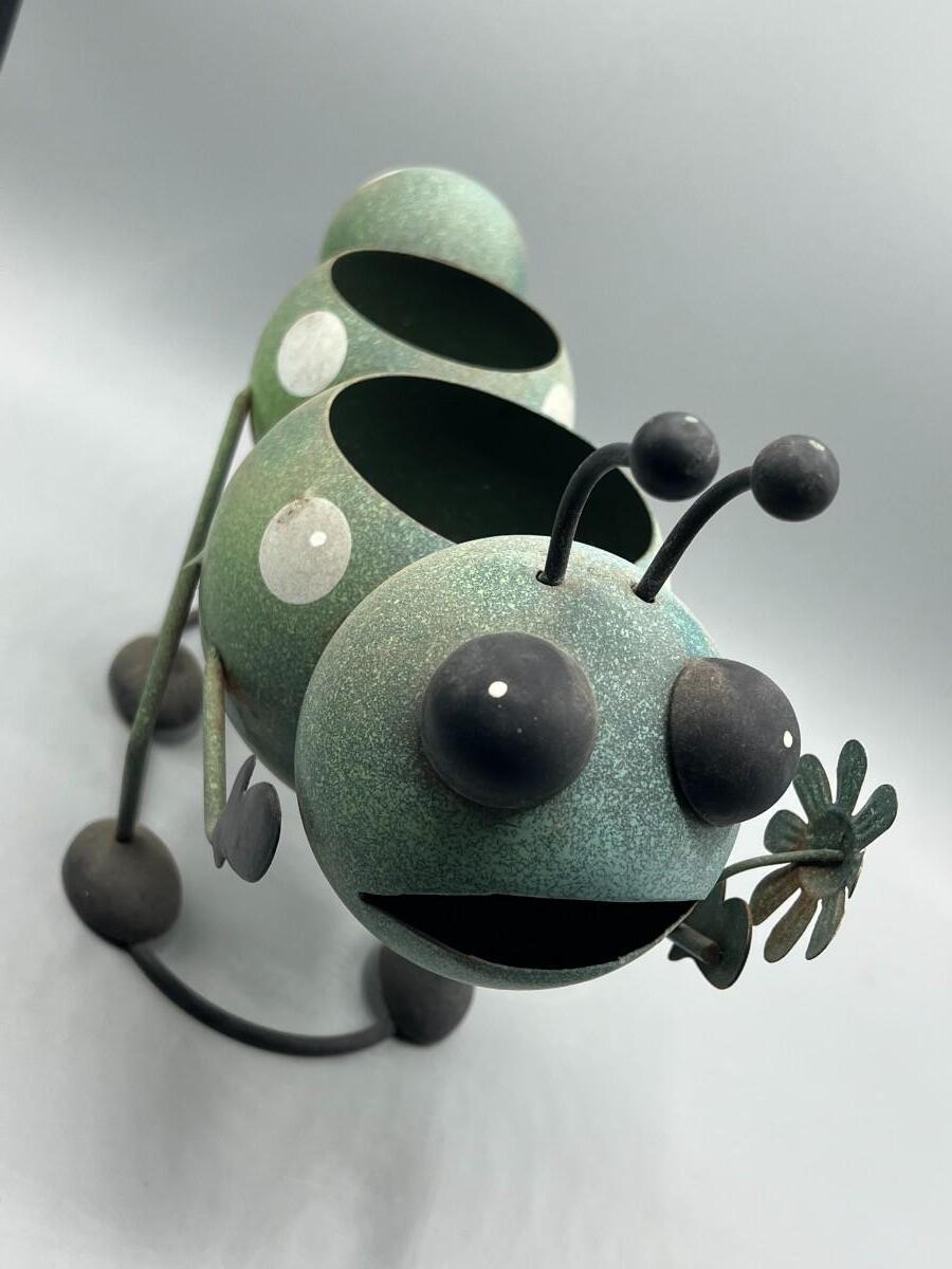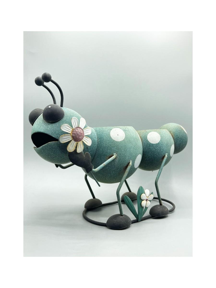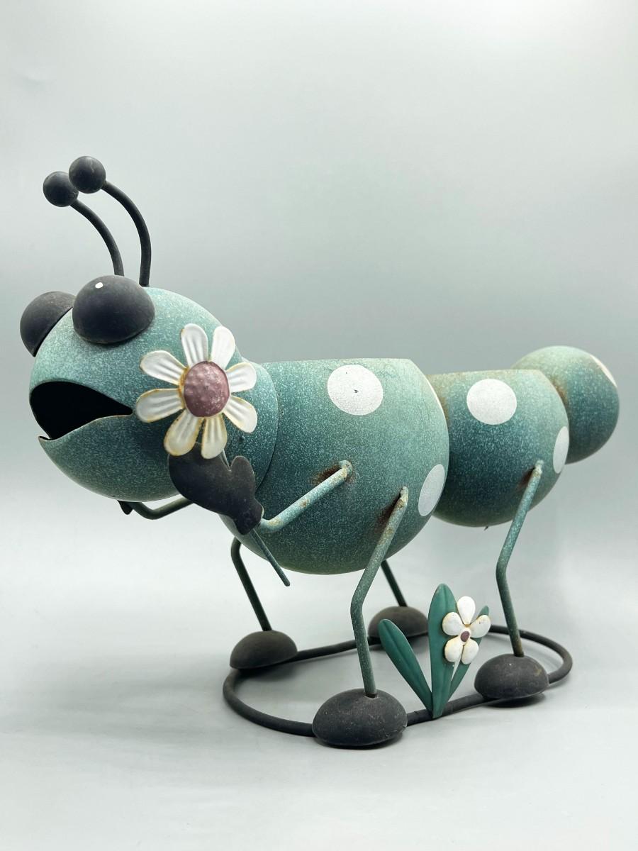 Metal Polka Dotted Caterpillar with Flower Yard Garden Art Planter Pot