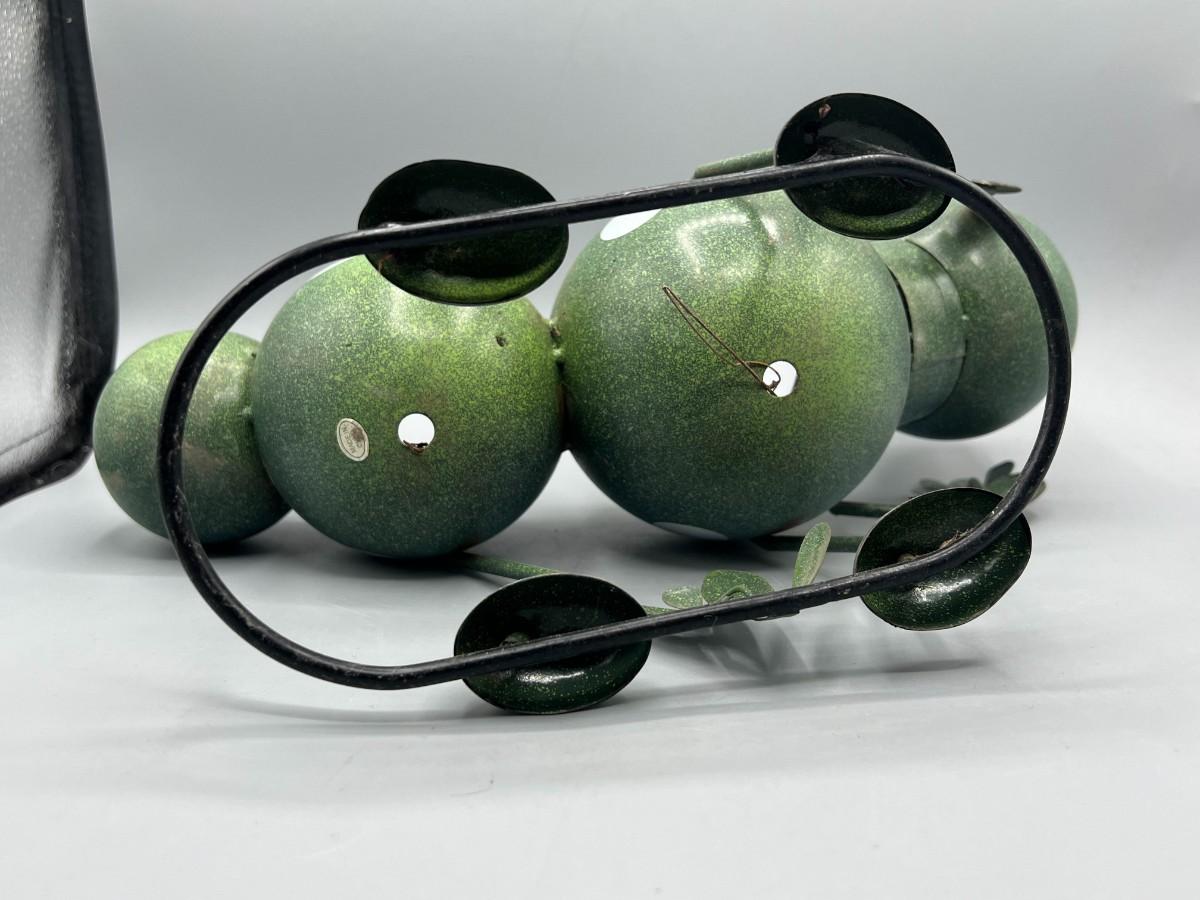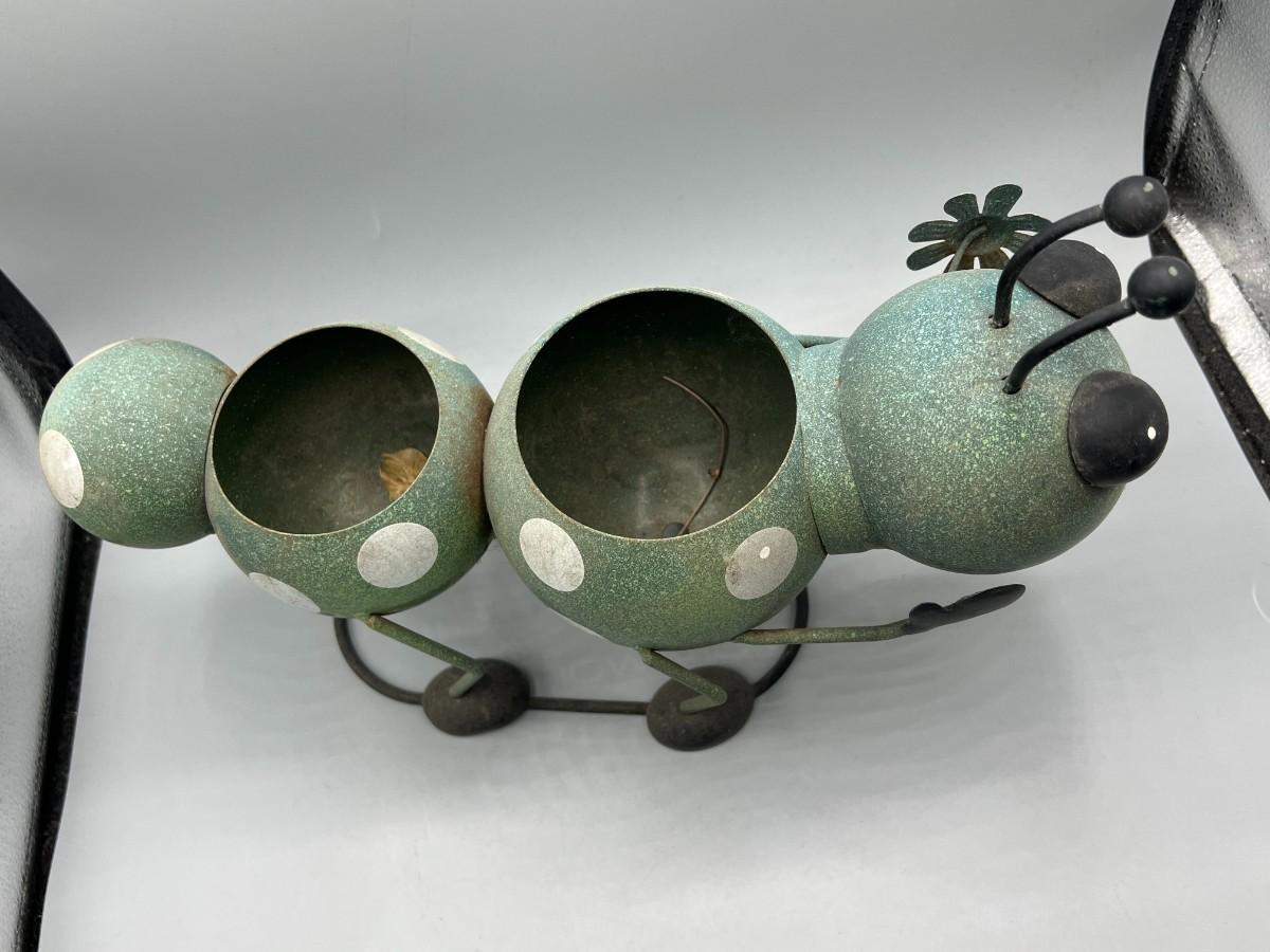 Metal polka dotted caterpillar with flower planter pot garden decor. Good, weathered condition. About 12" length.