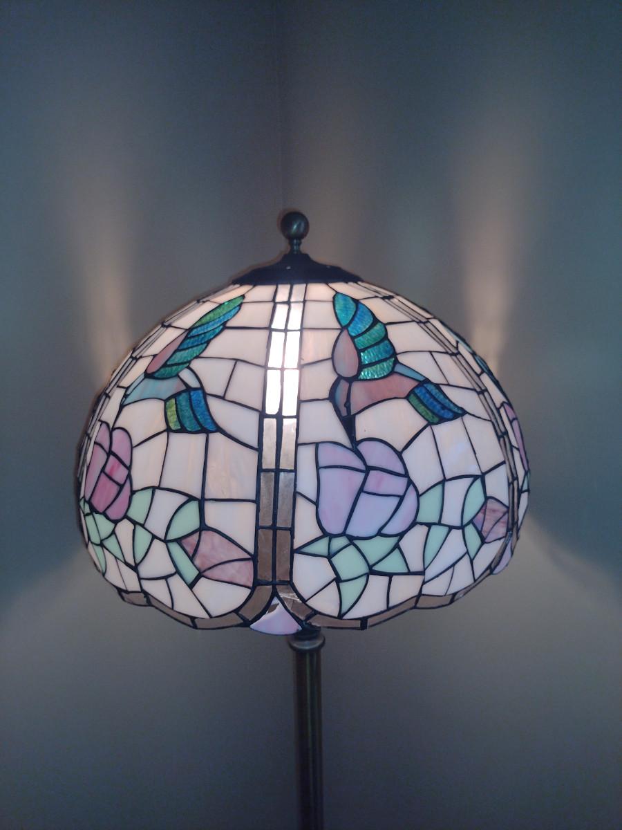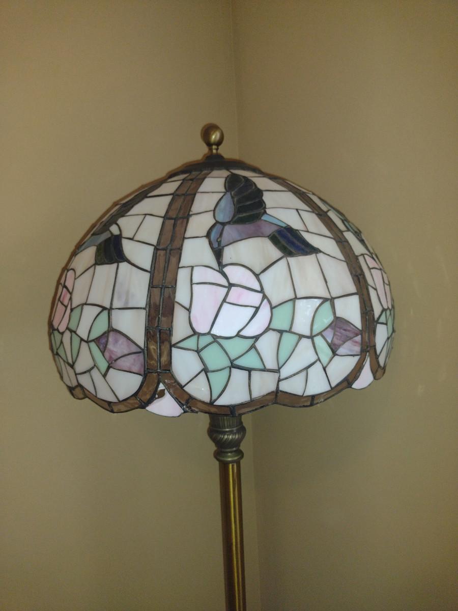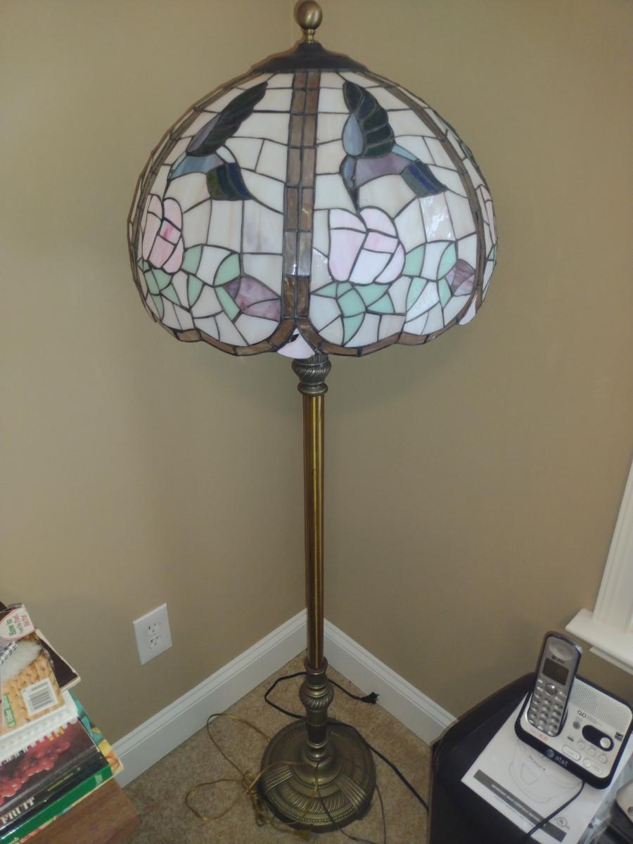 Metal Post Floor 3-Way Lamp with Stained Glass Hummingbird Design Shade- Approx 58" Tall. Item has some damage- cracked glass- please see all pictures.