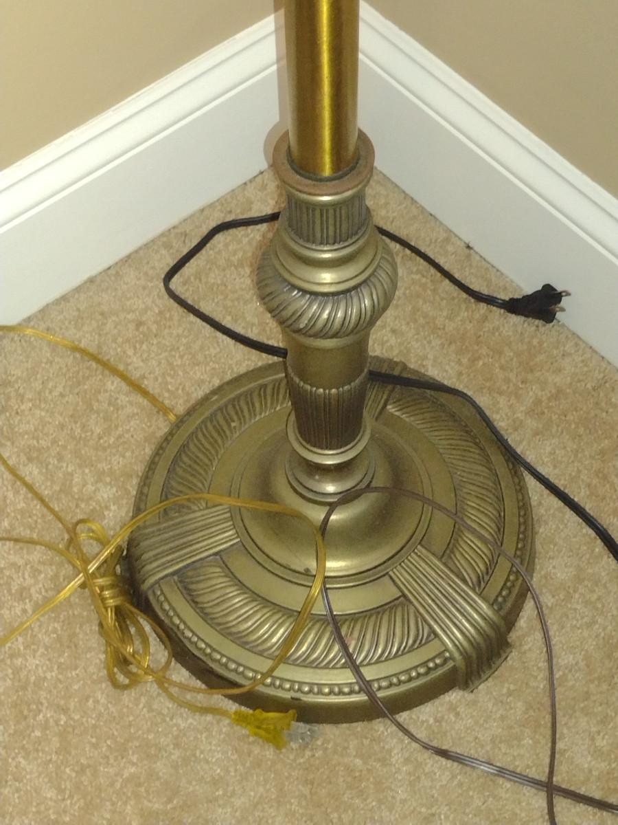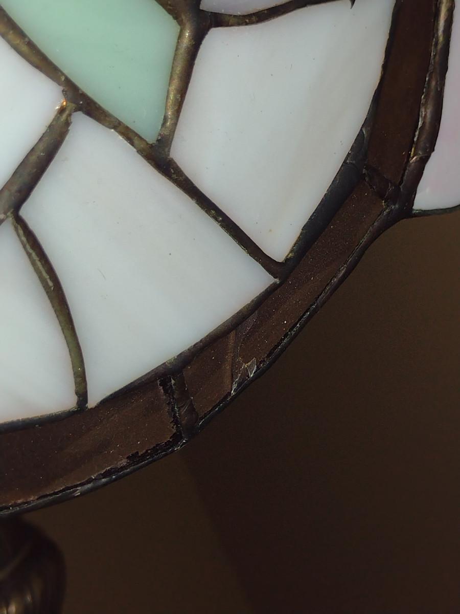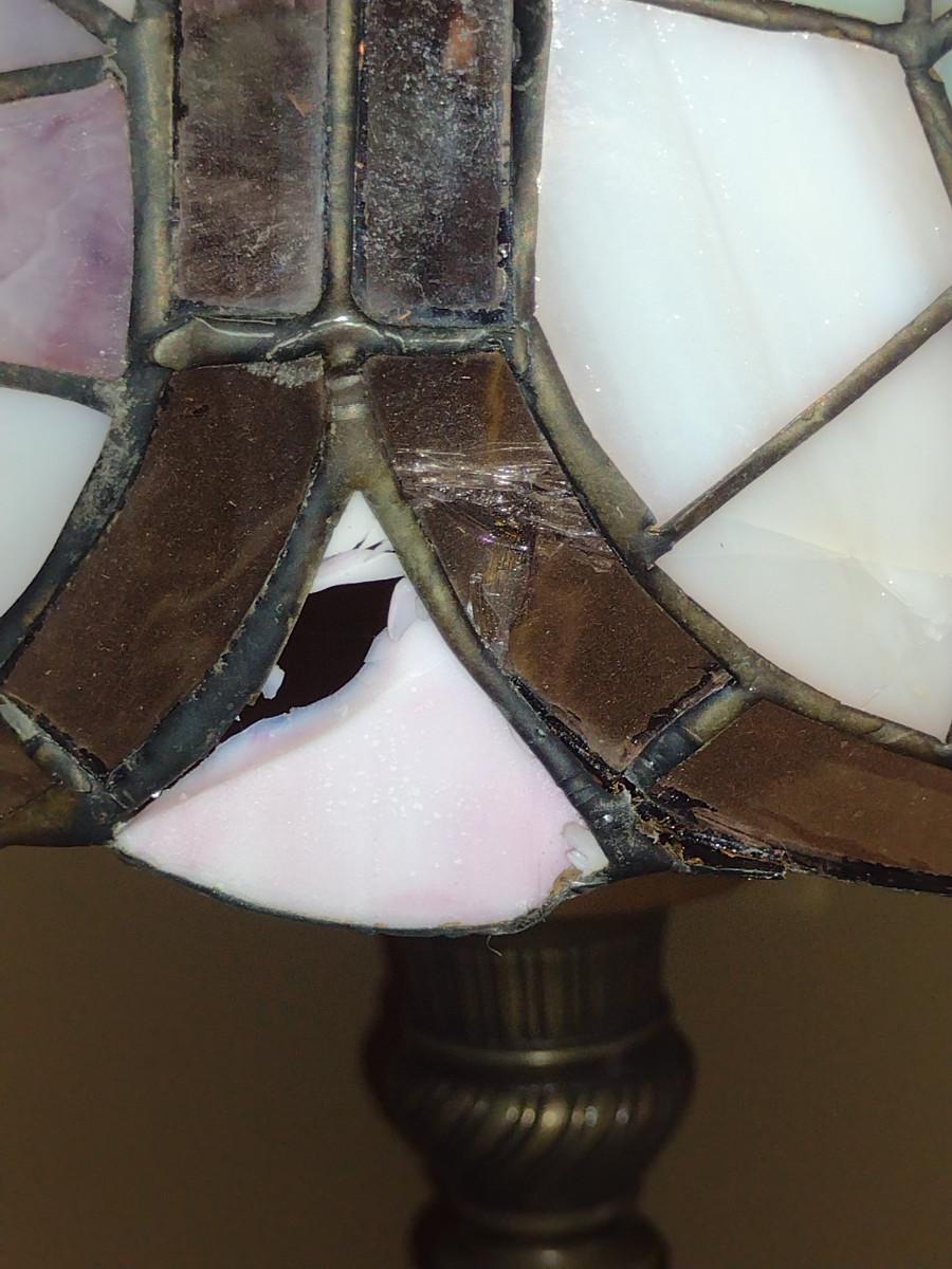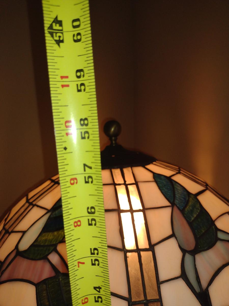 Metal Post Floor 3-Way Lamp with Stained Glass Hummingbird Design Shade- Approx 58" Tall. Item has some damage- cracked glass- please see all pictures.