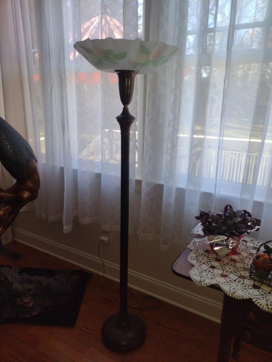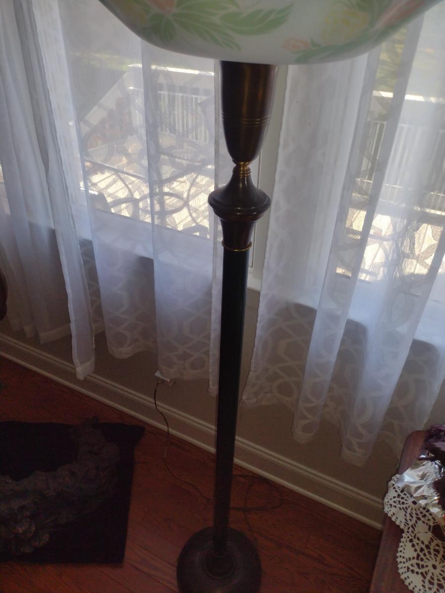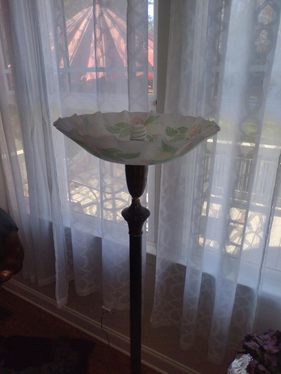 Metal Post Floor Lamp with Glass Shade- Approx 65" Tall. Item has dent on base- please see all pictures.