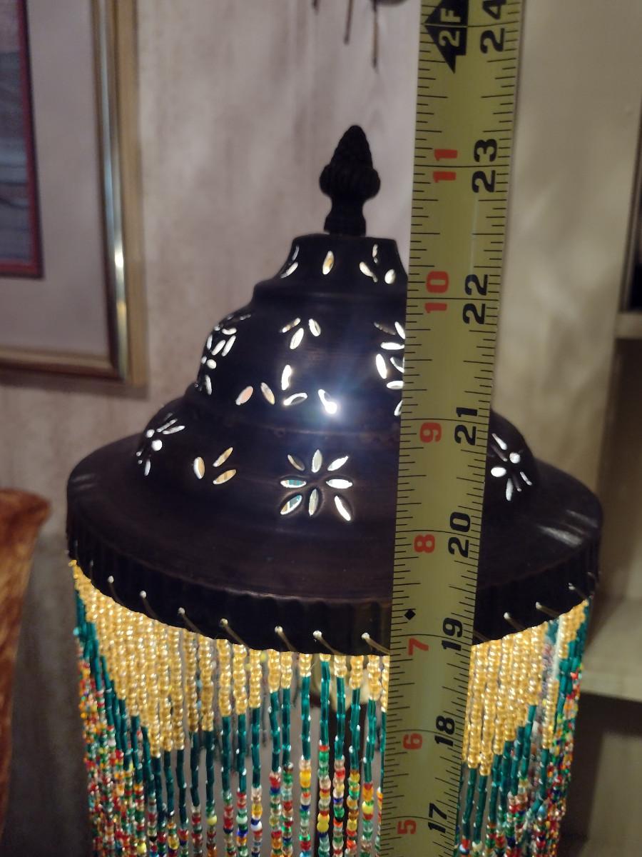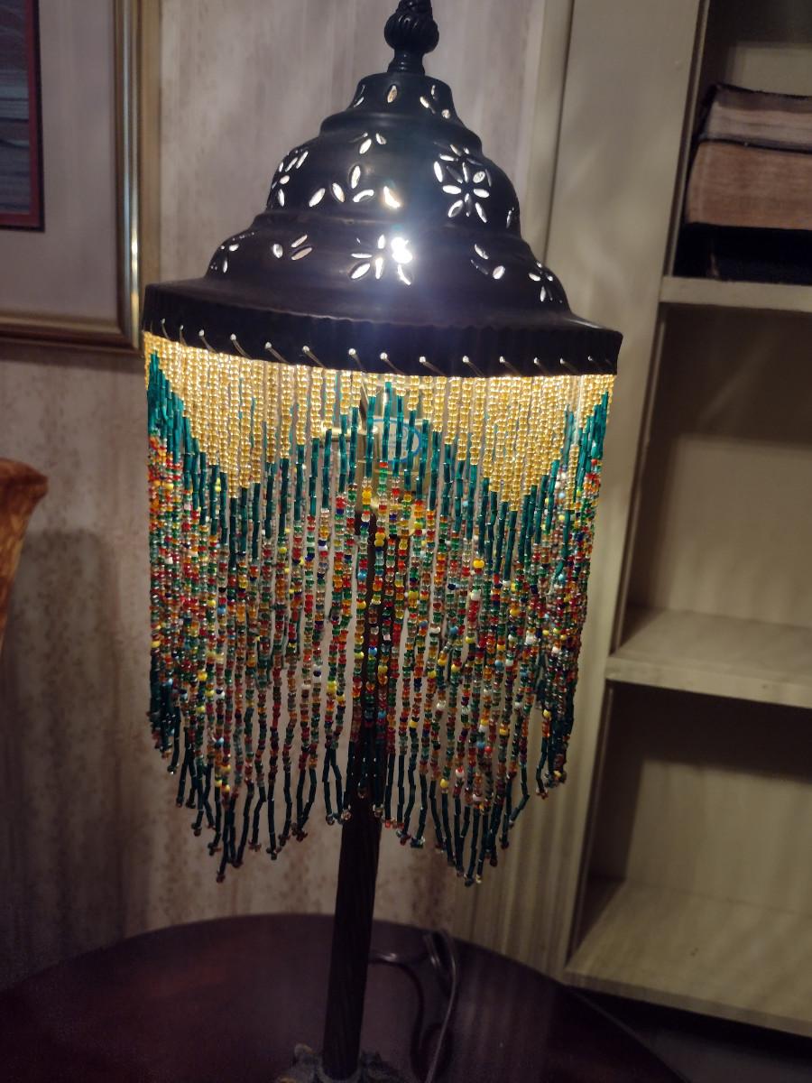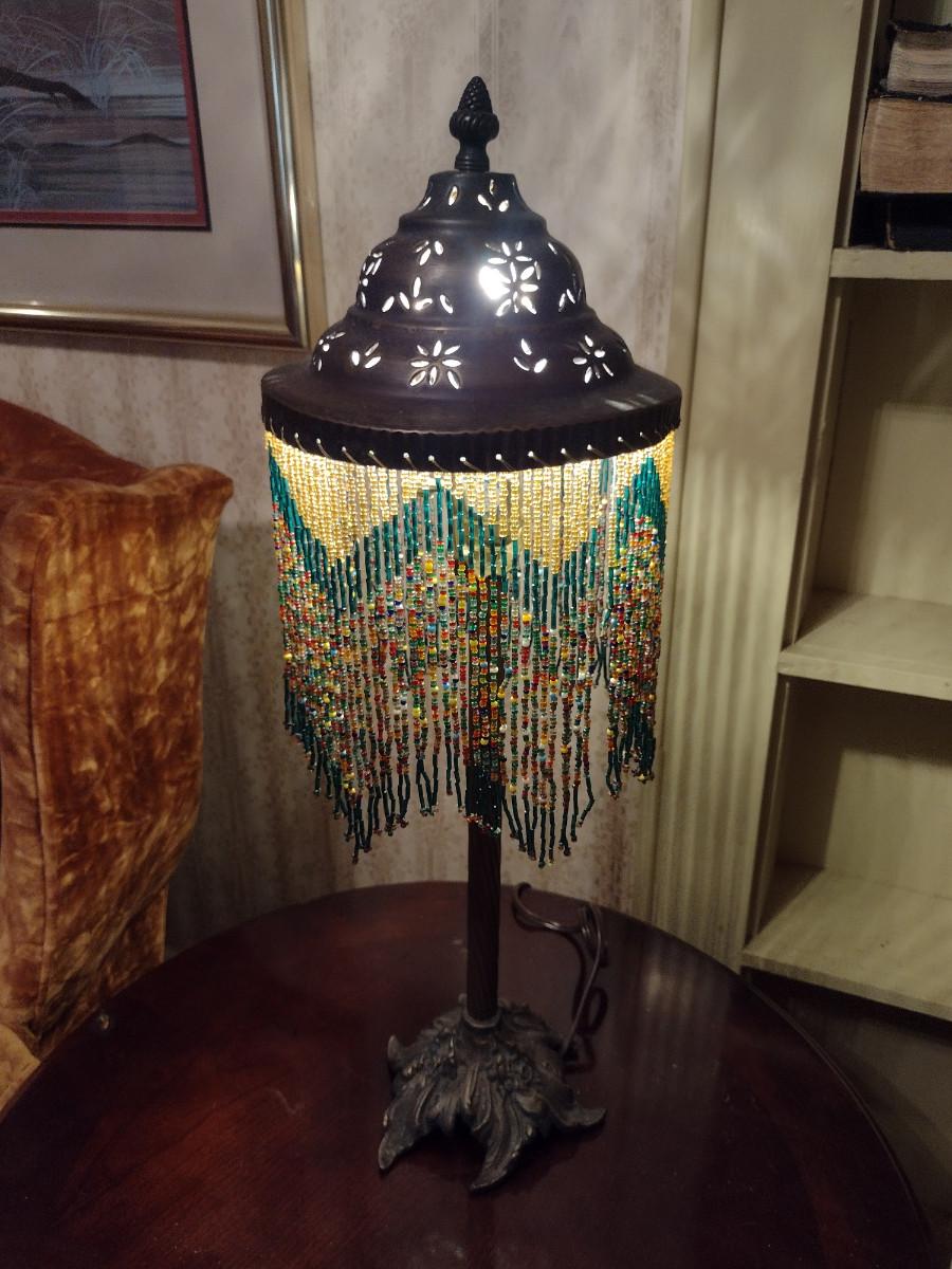 Metal Post Table Top Lamp with Beaded Shade. Approx 23" tall.