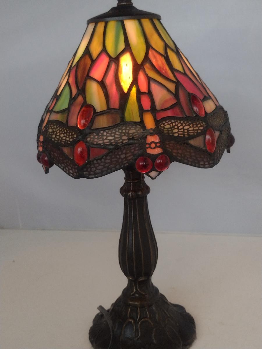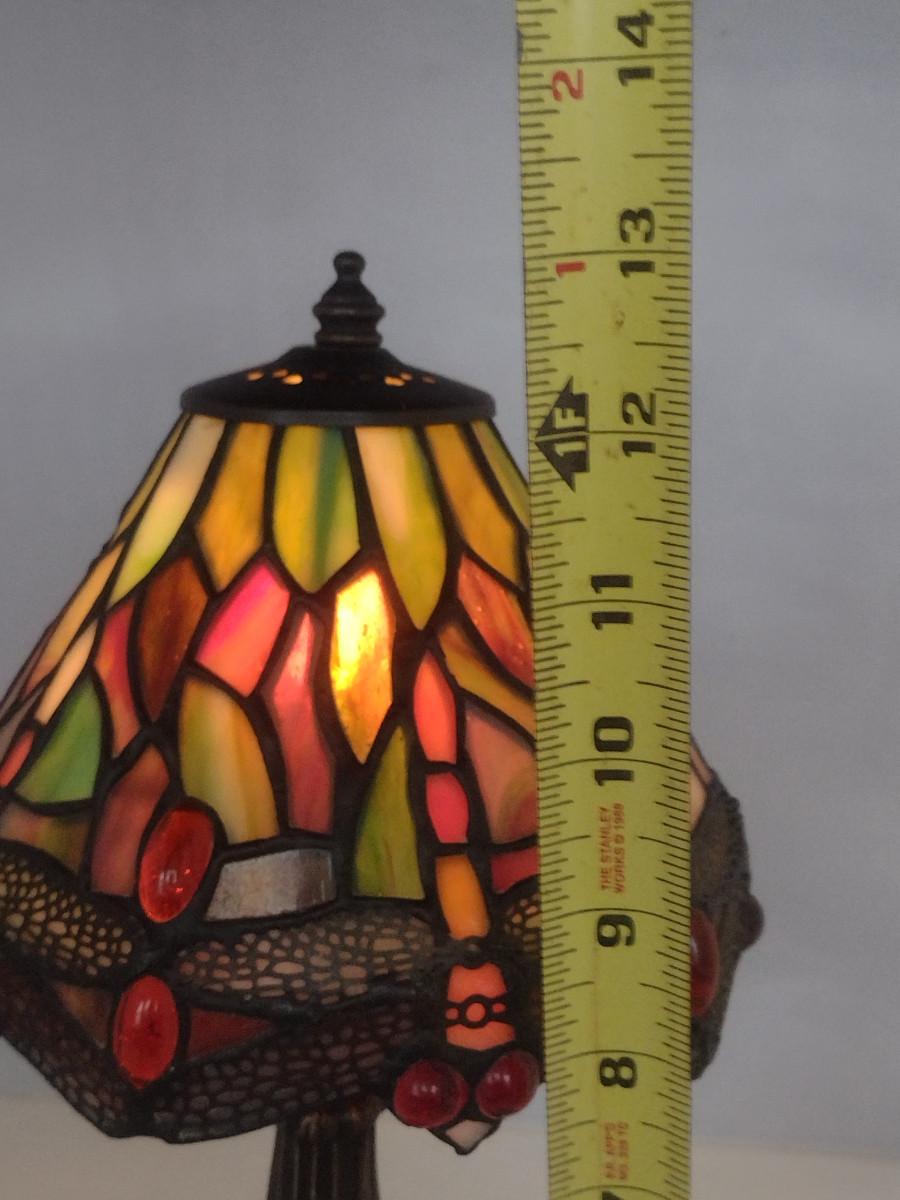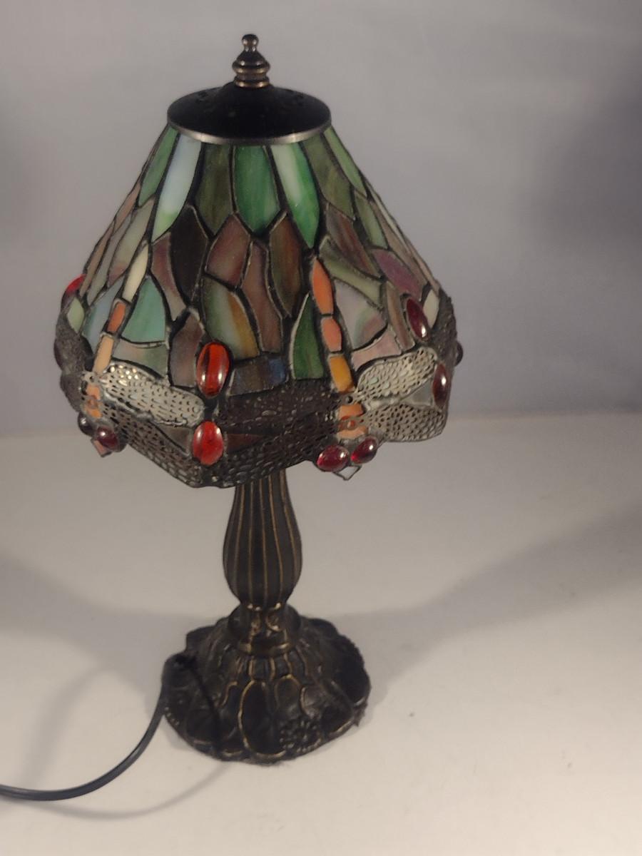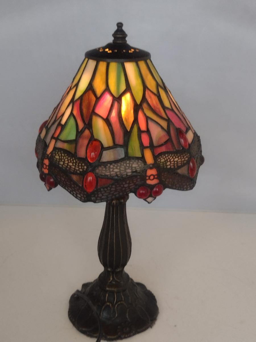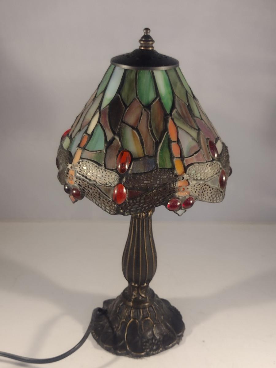 Metal Post Table Top Lamp with Stained Glass Shade- Dragonfly Design- Approx 13" Tall
