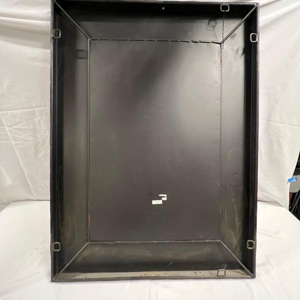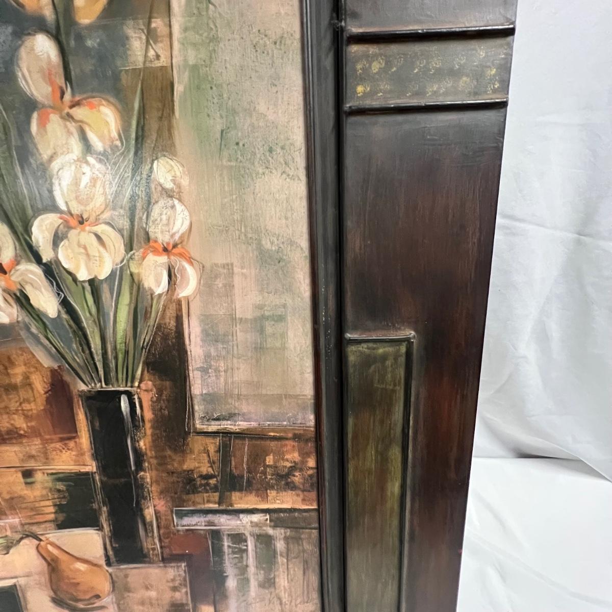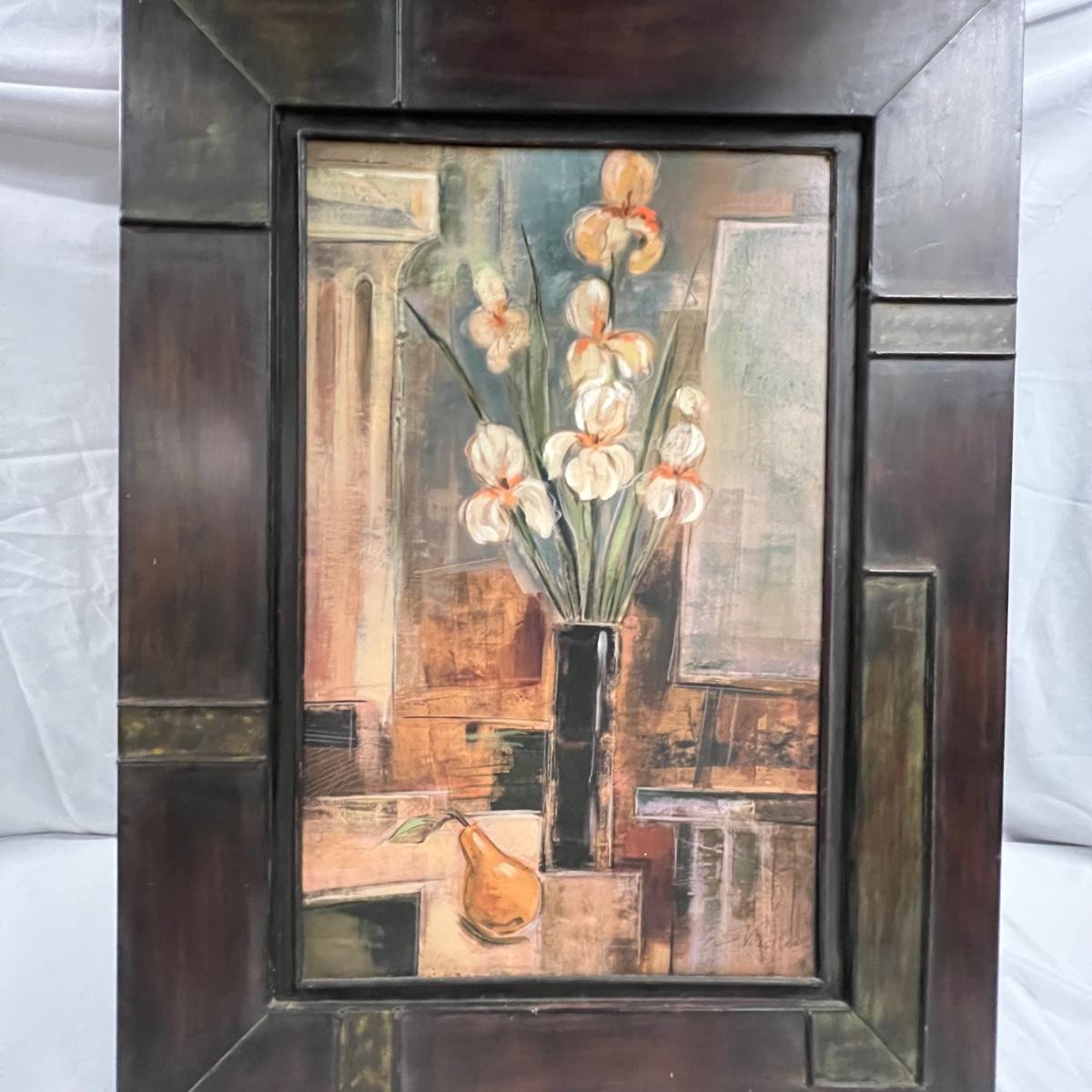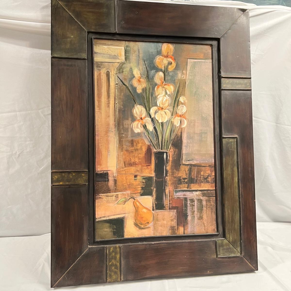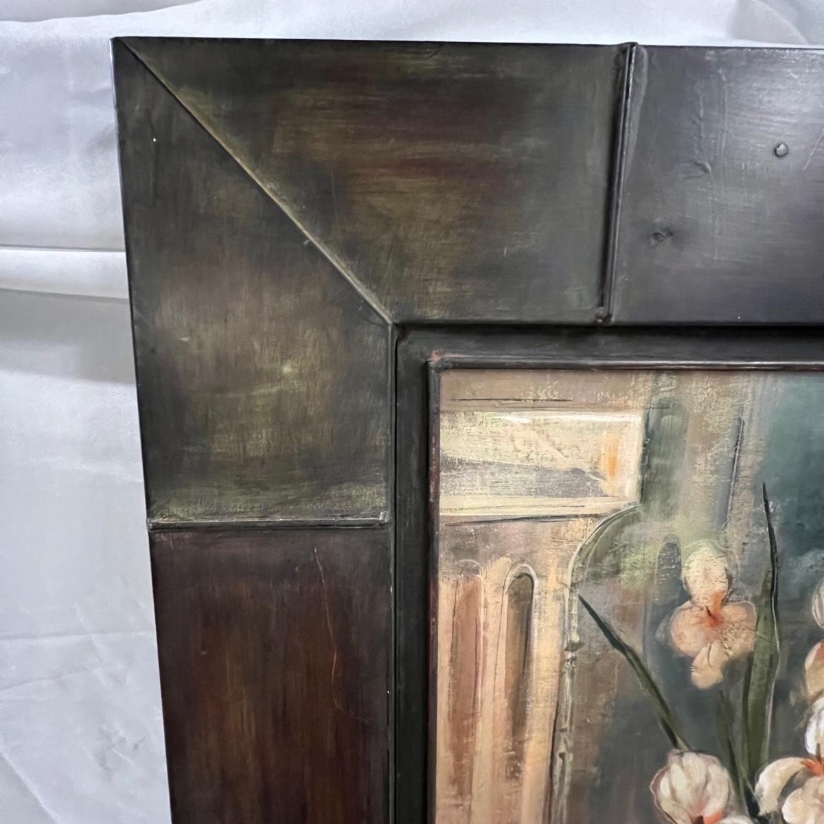 This unique large metal frame measures 33” x 2” x 45”H. The bearded iris floral print has been printed on metal. There is an indecipherable printed signature, see image.