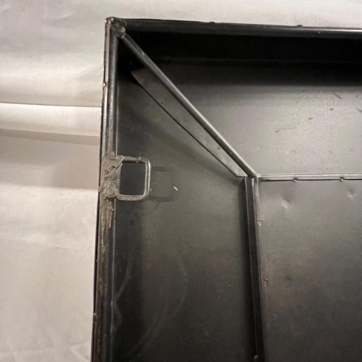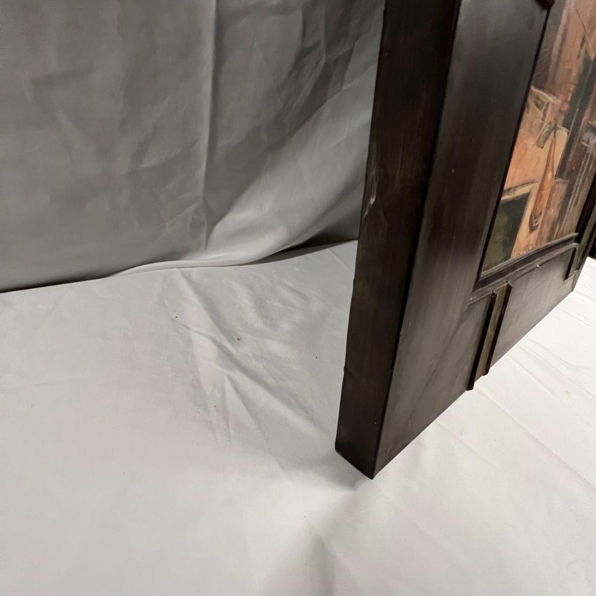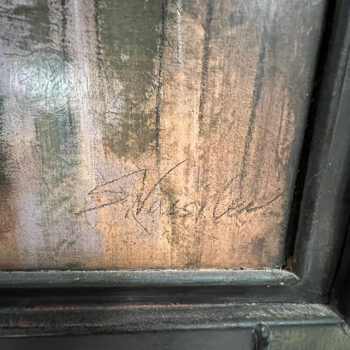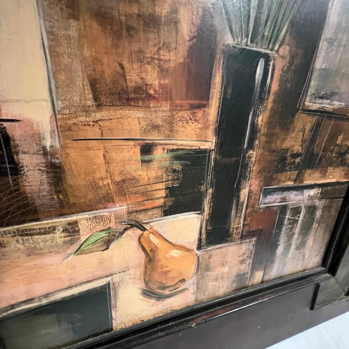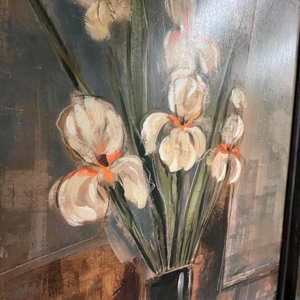 This unique large metal frame measures 33” x 2” x 45”H. The bearded iris floral print has been printed on metal. There is an indecipherable printed signature, see image.