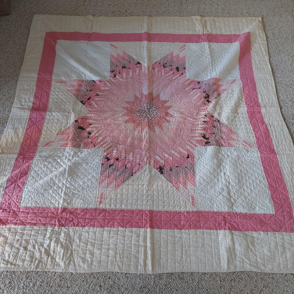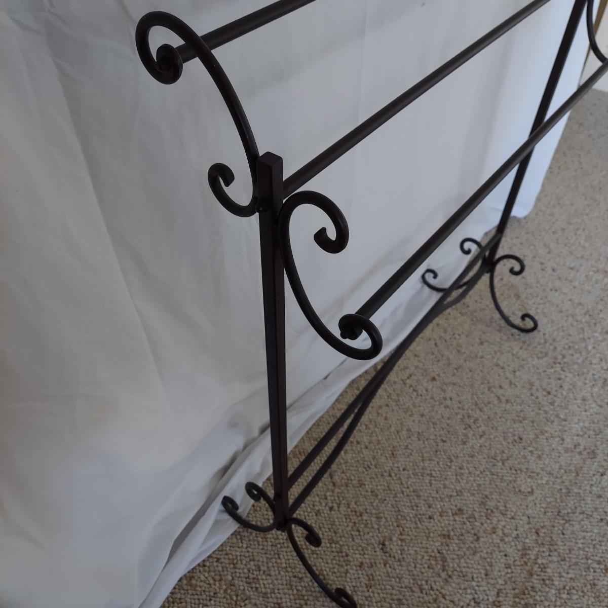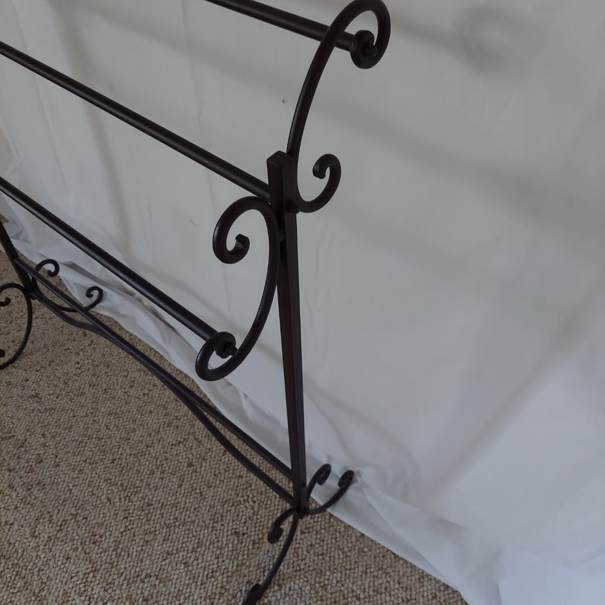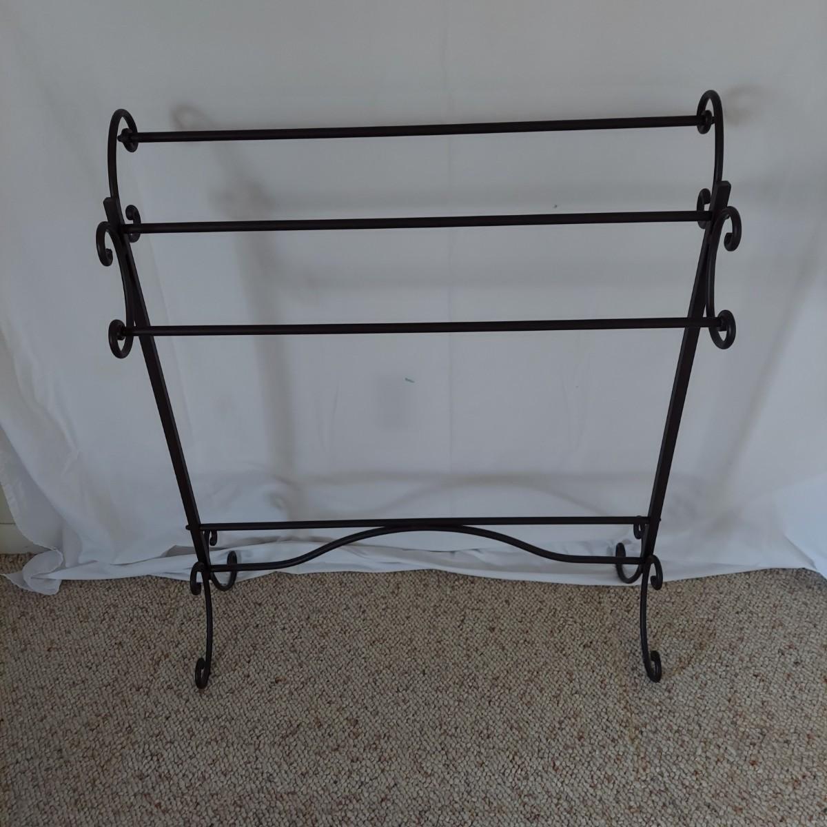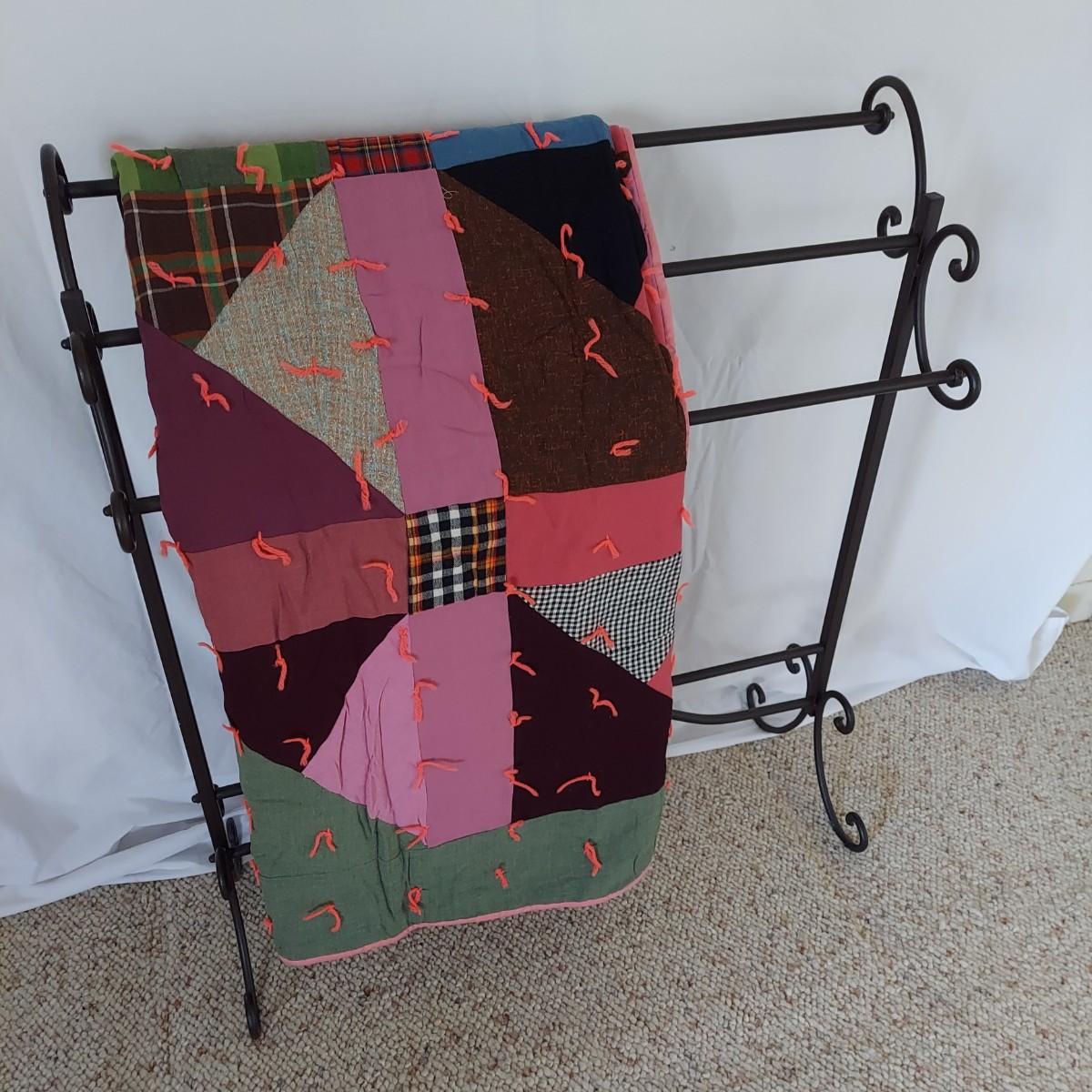 Metal quilt stand that measures 31” x 12” x 36"H. Also four quilts and one knitted blanket. Flowered quilt measures 64" x 84". Some condition issues on the quilts. Please see photos for details. Local Pickup Only