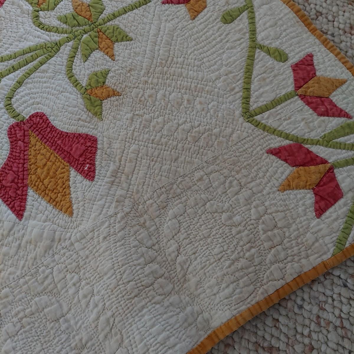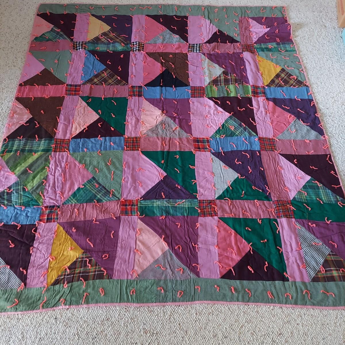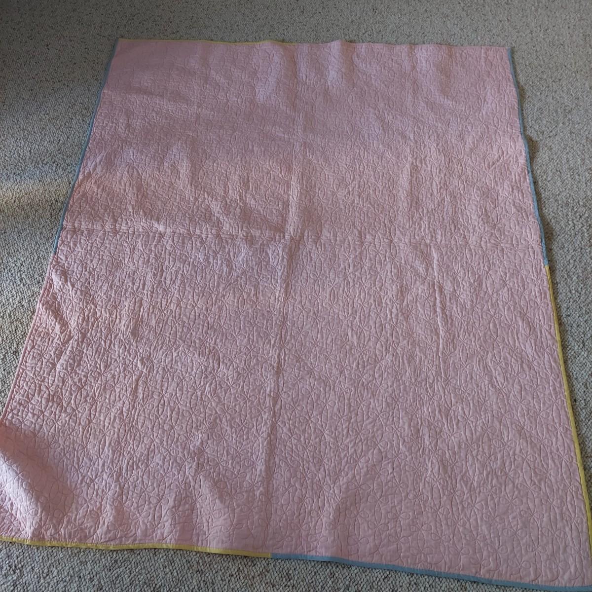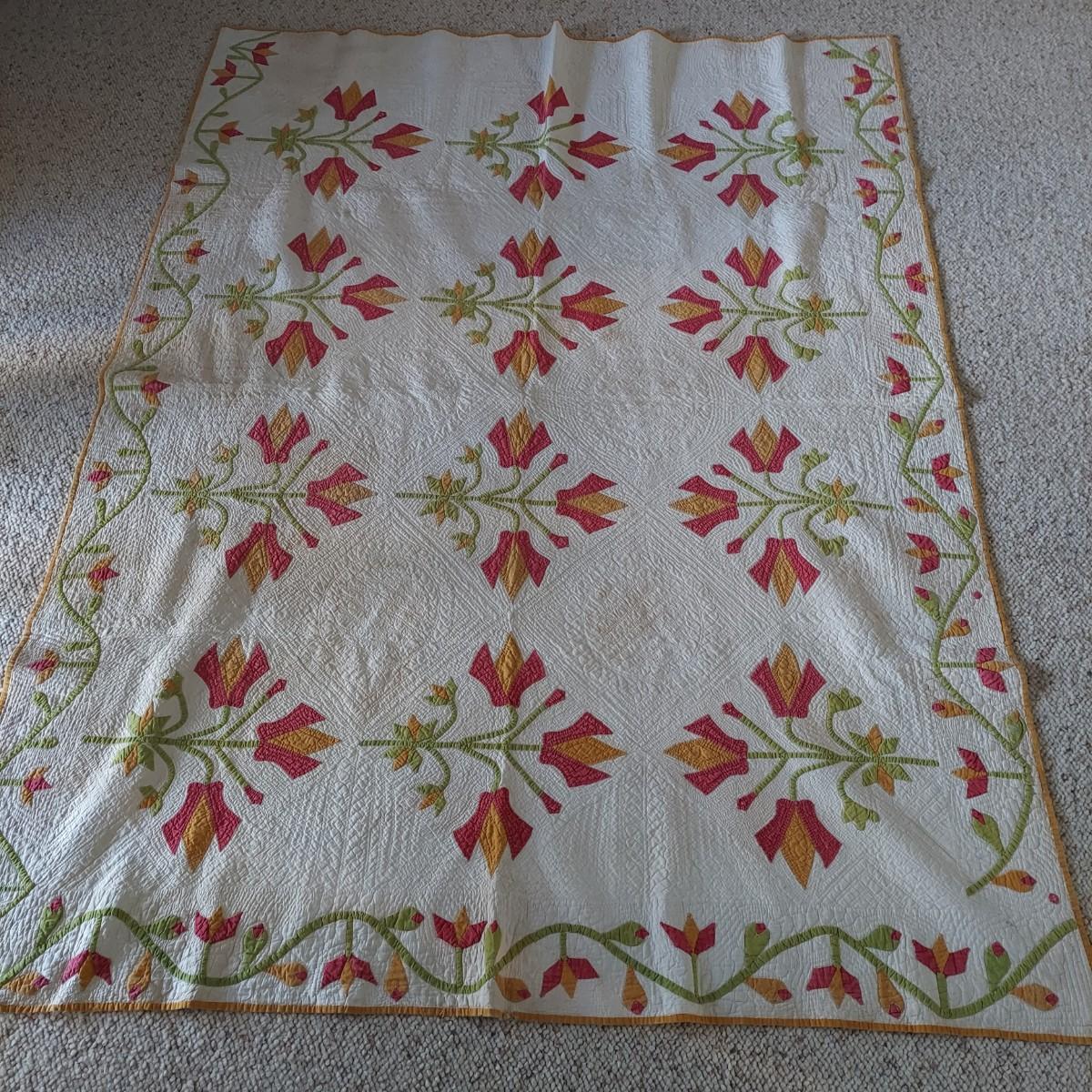 Metal quilt stand that measures 31” x 12” x 36"H. Also four quilts and one knitted blanket. Flowered quilt measures 64" x 84". Some condition issues on the quilts. Please see photos for details. Local Pickup Only