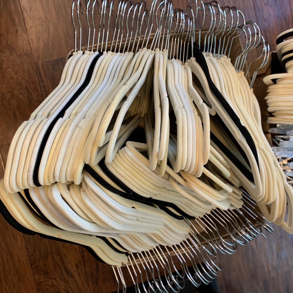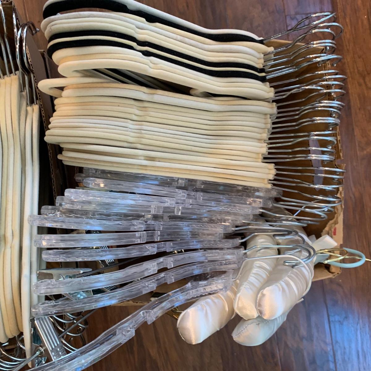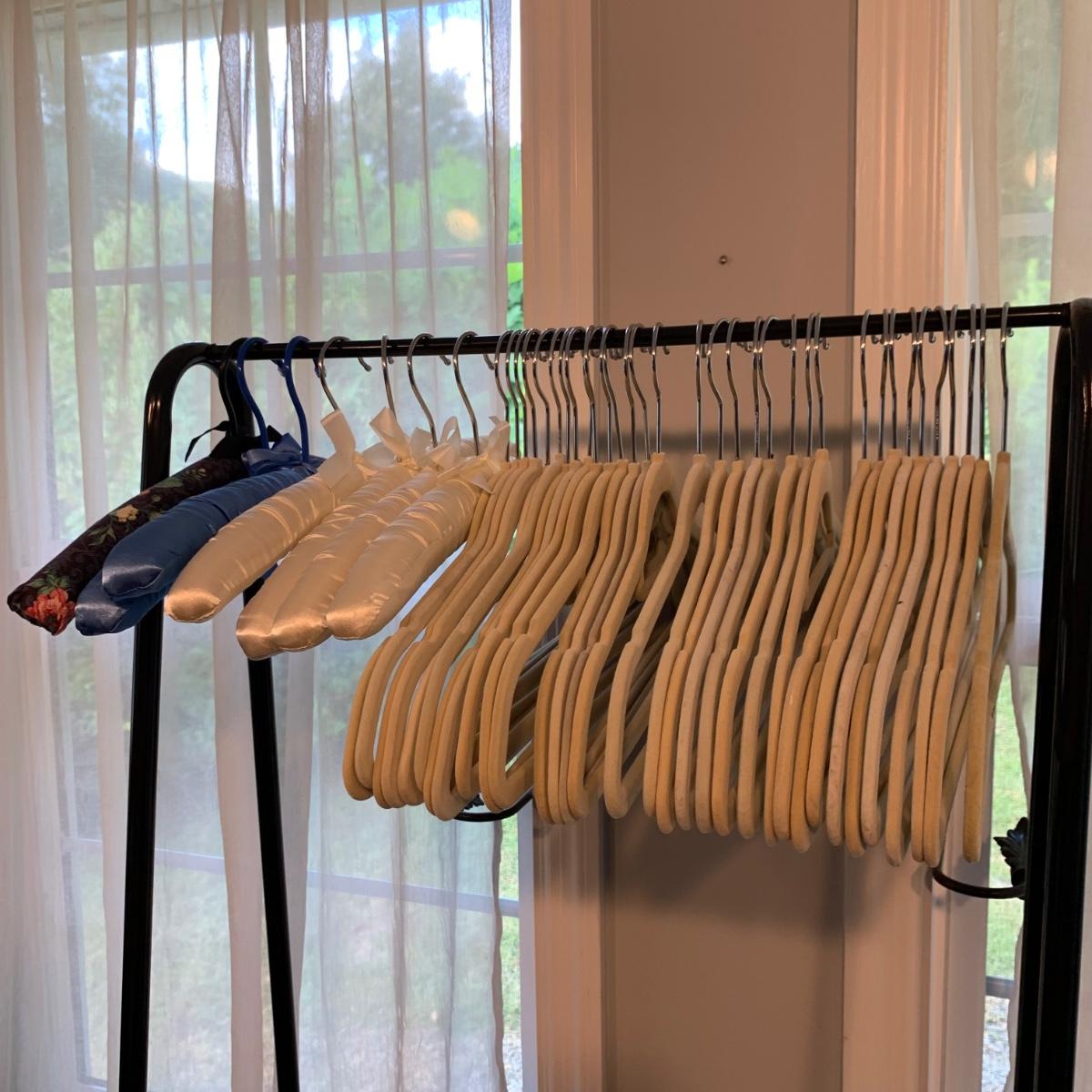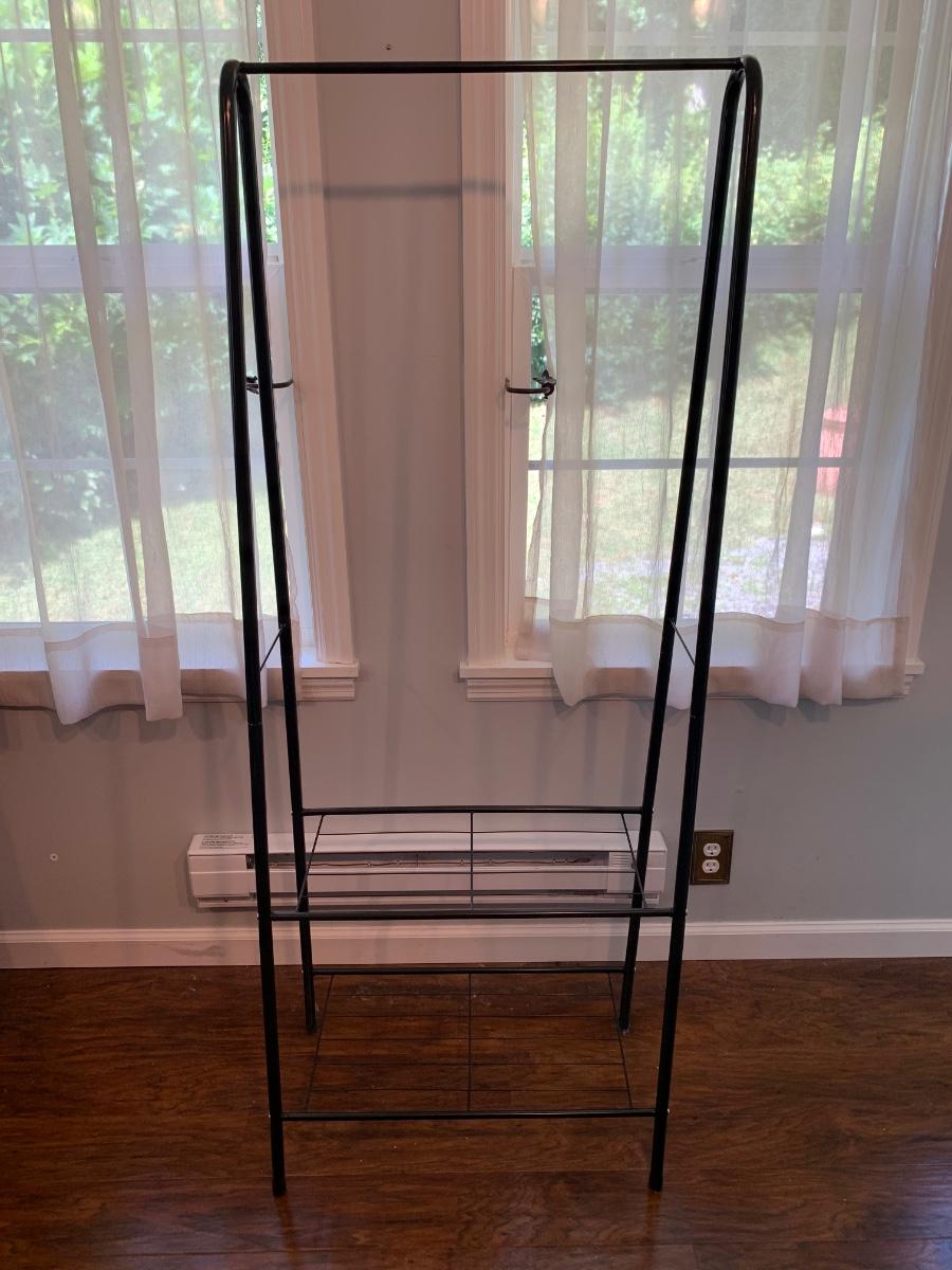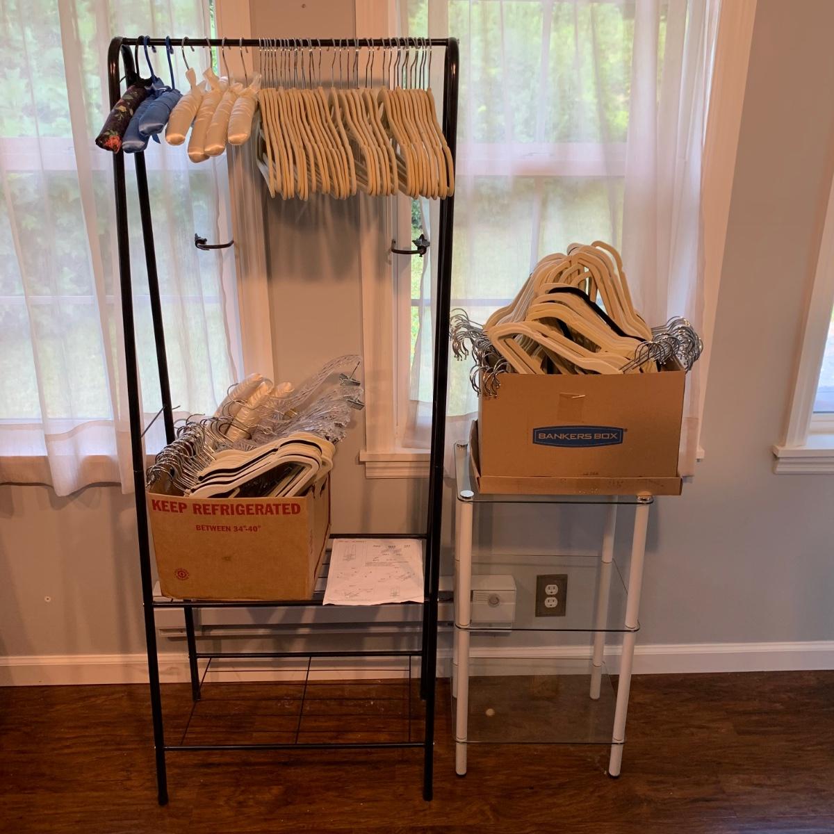 Black metal organizing rack is 24” x 14” x 62.5”H. It has a top rack for hanging and two lower shelves. Glass and metal shelving unit/side table is 15.75” x 12” x 28.5”H. It is dusty and needs cleaned. Approximately 170 hangers are included, most of which are velvet.