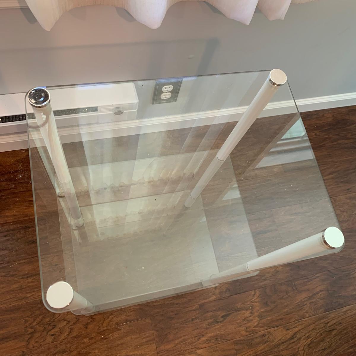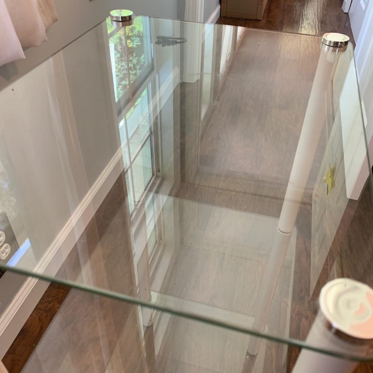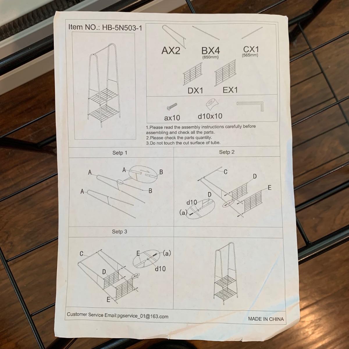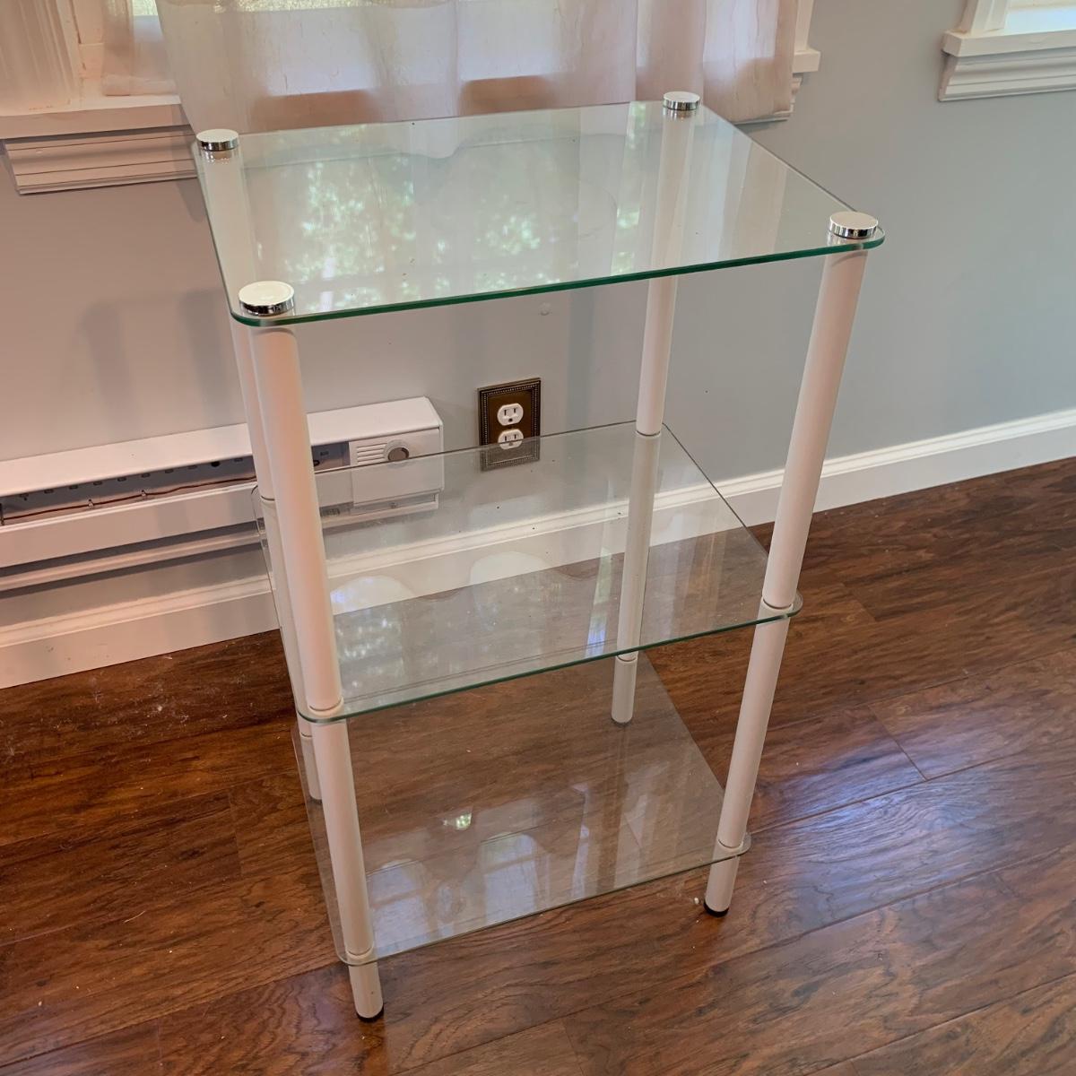 Black metal organizing rack is 24” x 14” x 62.5”H. It has a top rack for hanging and two lower shelves. Glass and metal shelving unit/side table is 15.75” x 12” x 28.5”H. It is dusty and needs cleaned. Approximately 170 hangers are included, most of which are velvet.