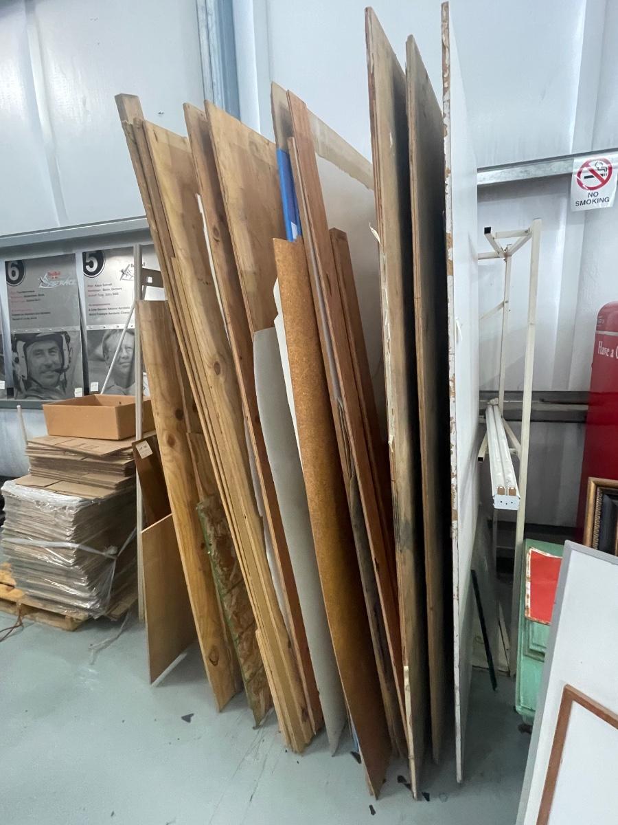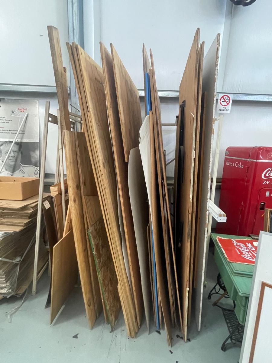 Metal Rack with Misc. Lumber/Plywood Included - Some pieces have table legs attached