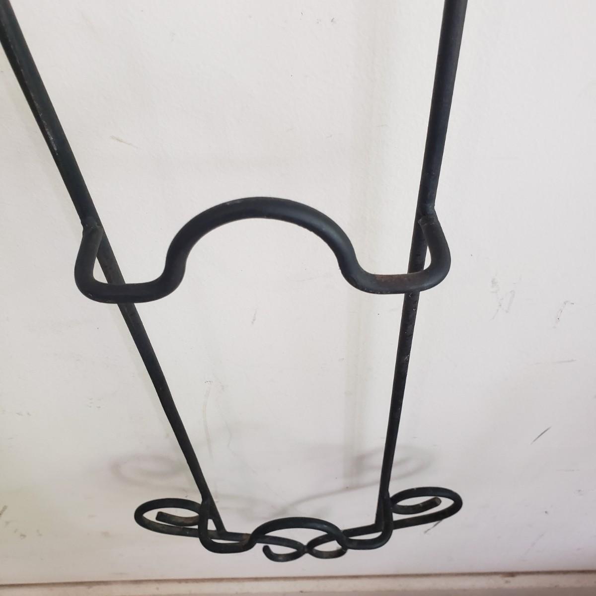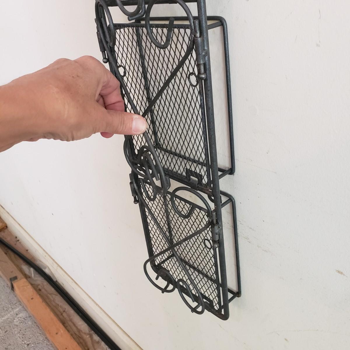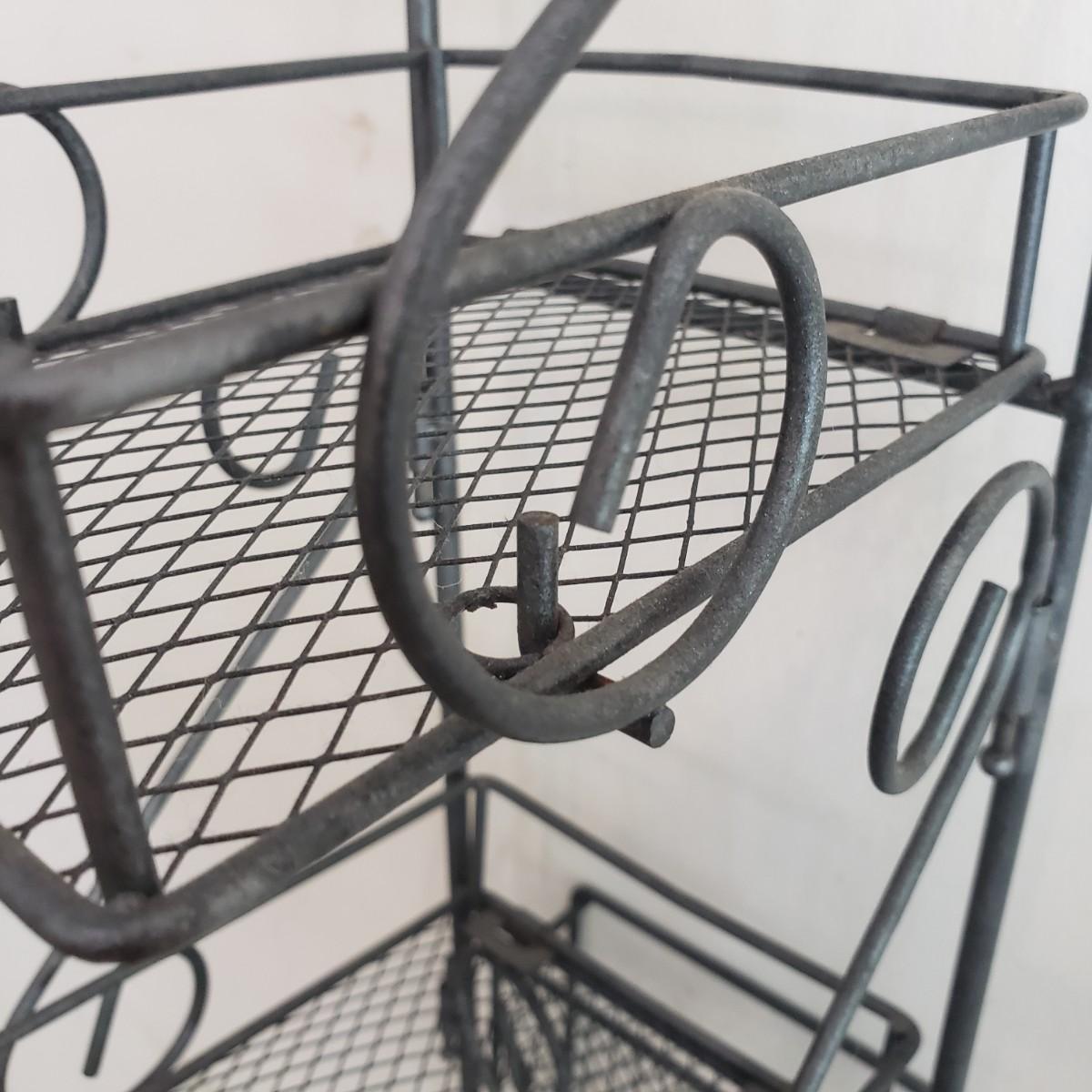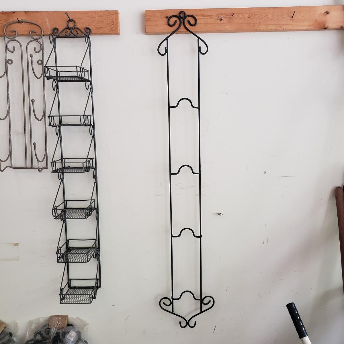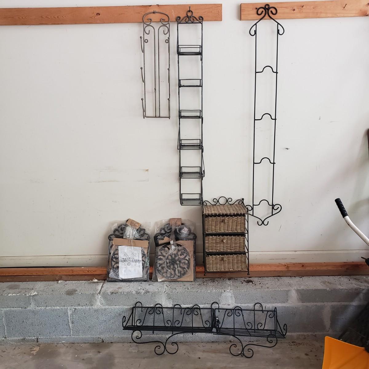 This seven-piece lot contains metal display racks and a small wicker shelving unit. The long rack for plates measures 10" x 54"H. The wicker three drawer shelf measures 11" x 8" x 18"H. The black rack with scrolled metal features needs some screws and nuts to hold it together. The tall six wired basket rack can fold down. The two heavy metal racks are new in the package; it appears the left rack may be missing the piece pointed at on the right rack in the last photo.
