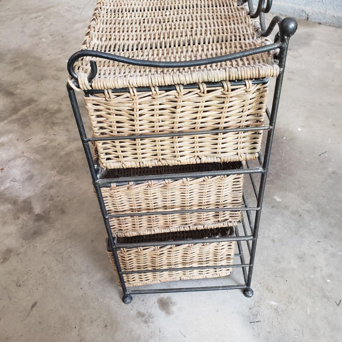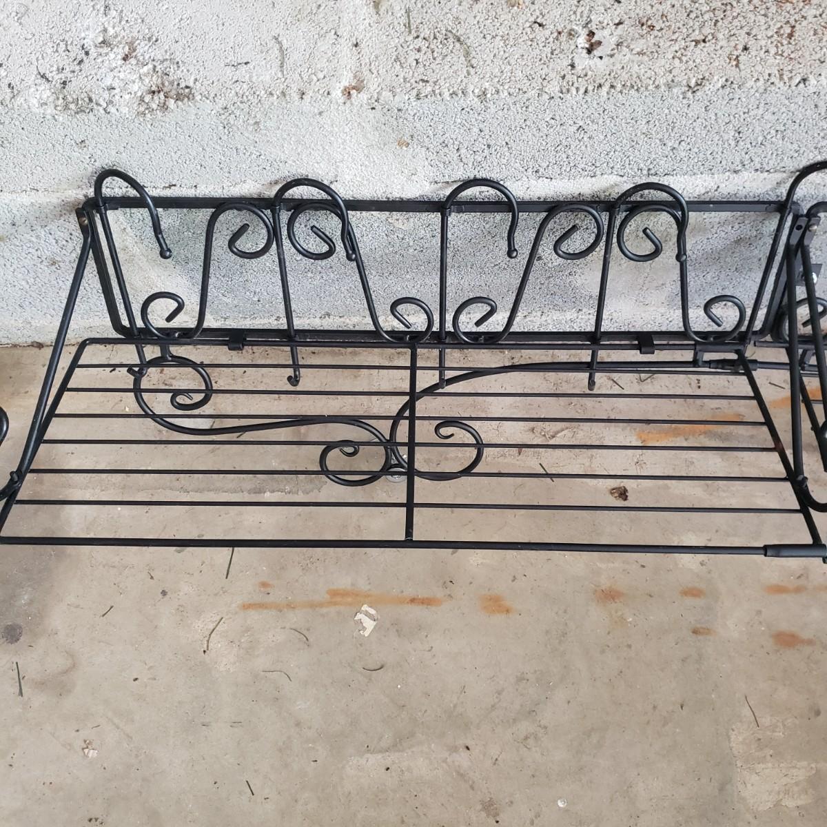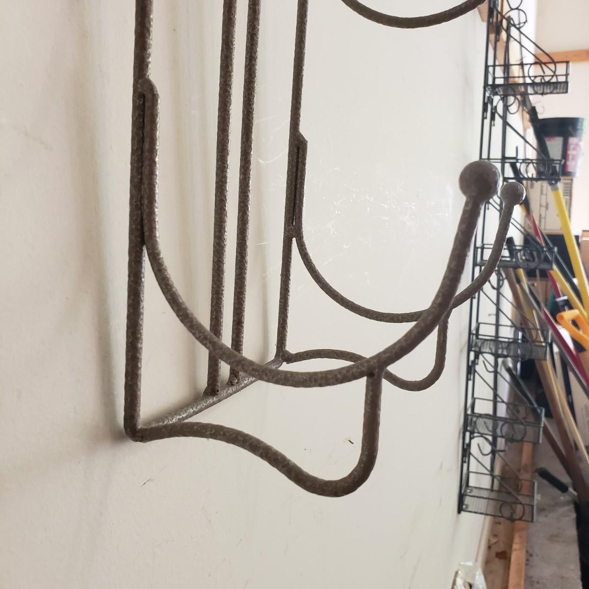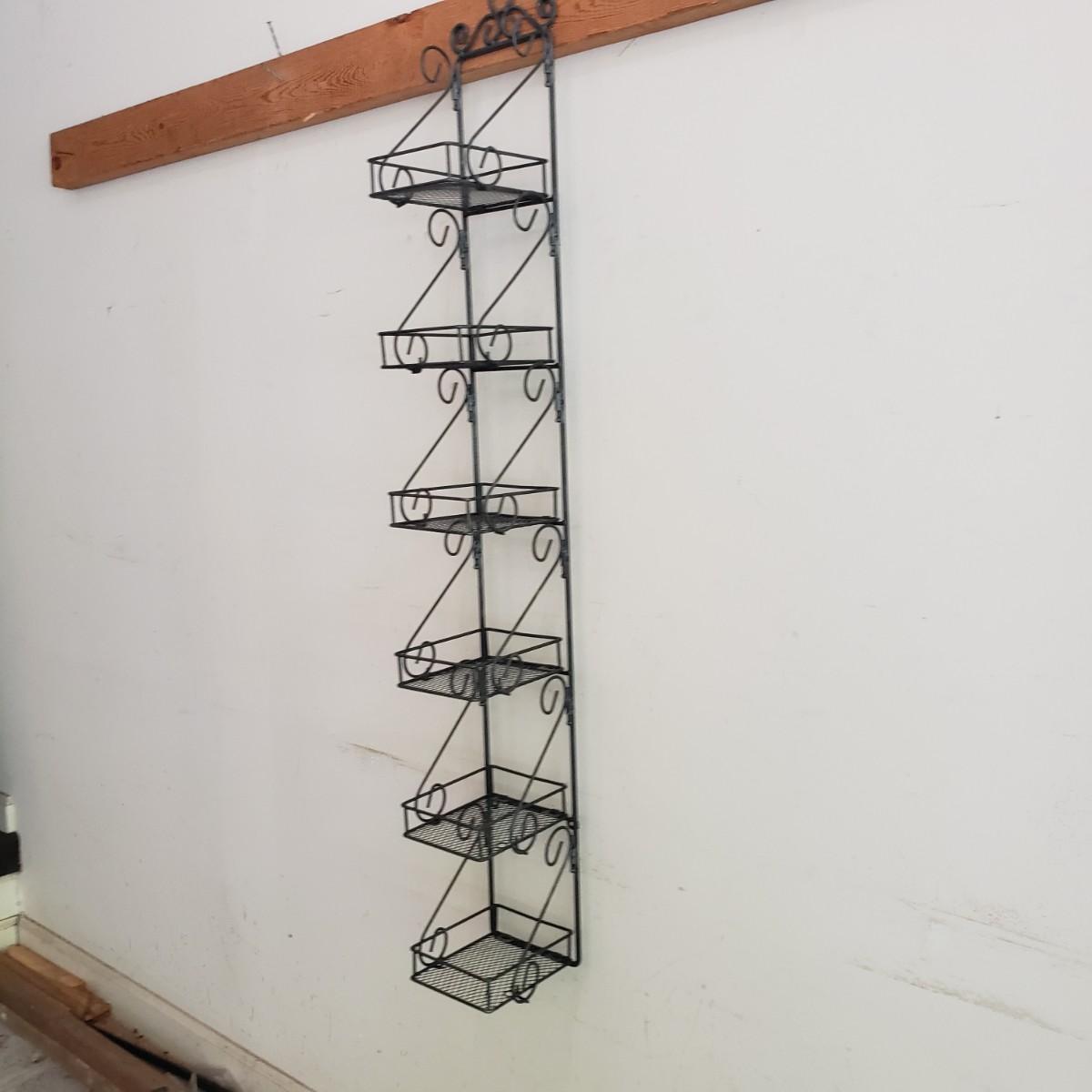 This seven-piece lot contains metal display racks and a small wicker shelving unit. The long rack for plates measures 10" x 54"H. The wicker three drawer shelf measures 11" x 8" x 18"H. The black rack with scrolled metal features needs some screws and nuts to hold it together. The tall six wired basket rack can fold down. The two heavy metal racks are new in the package; it appears the left rack may be missing the piece pointed at on the right rack in the last photo.