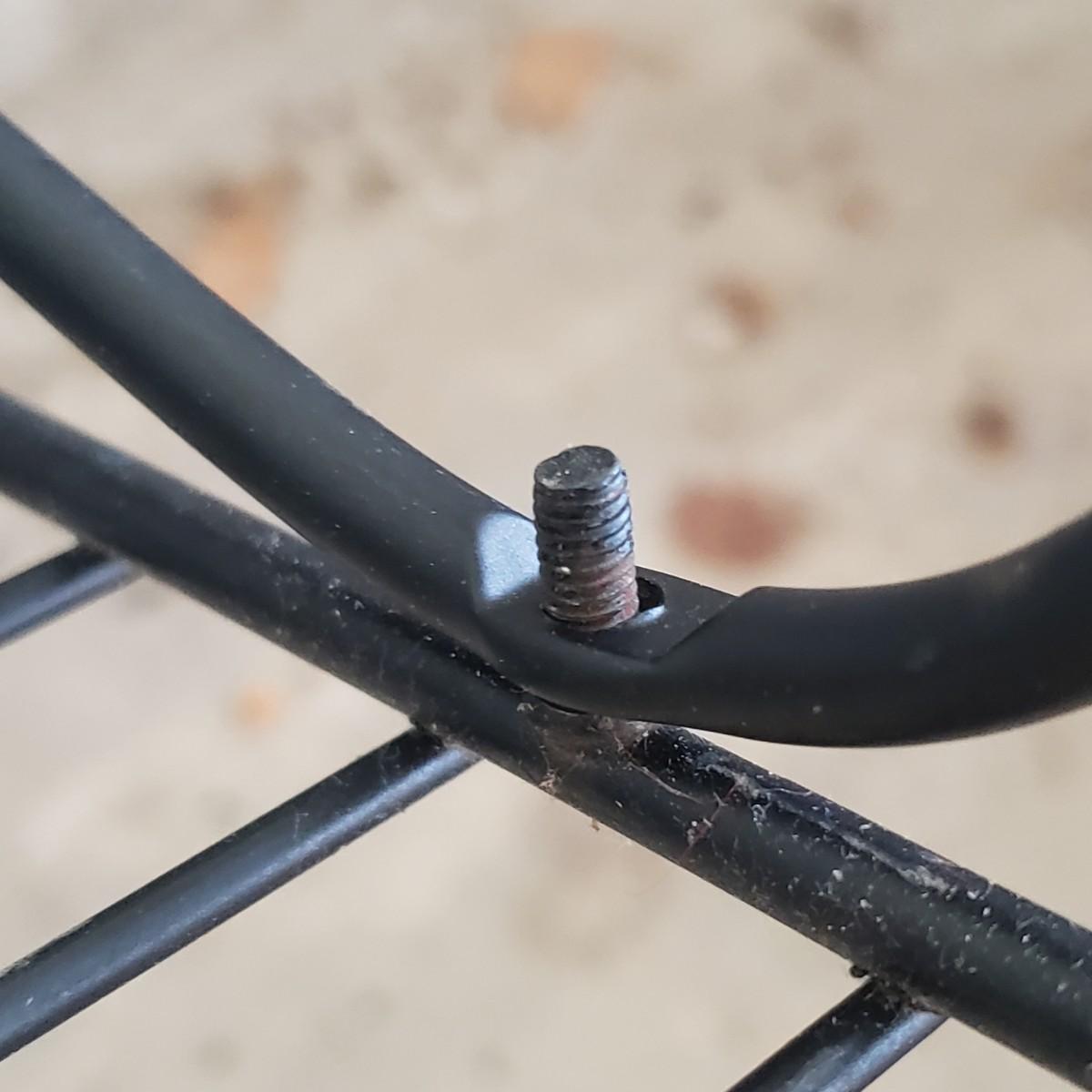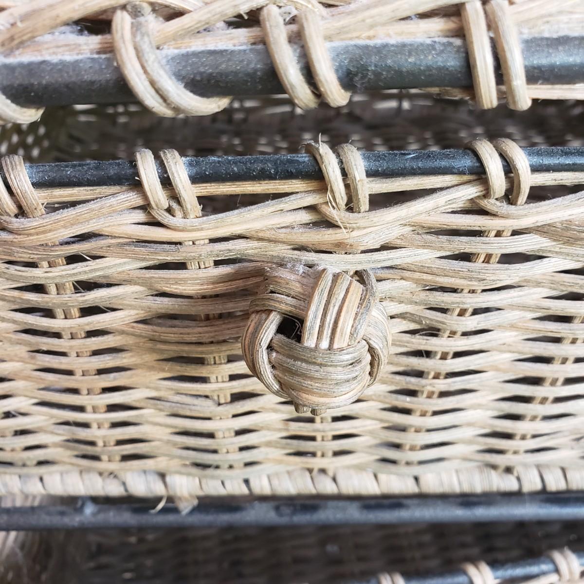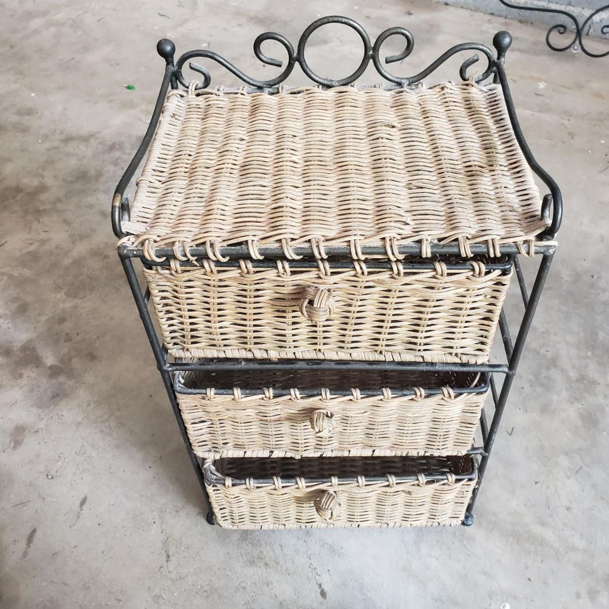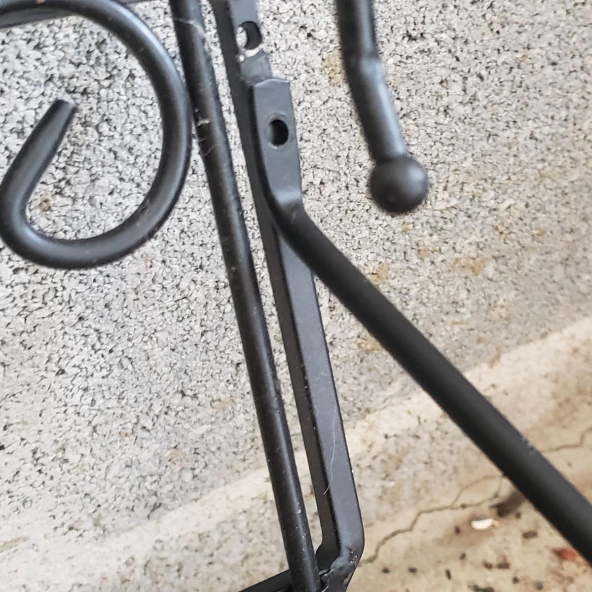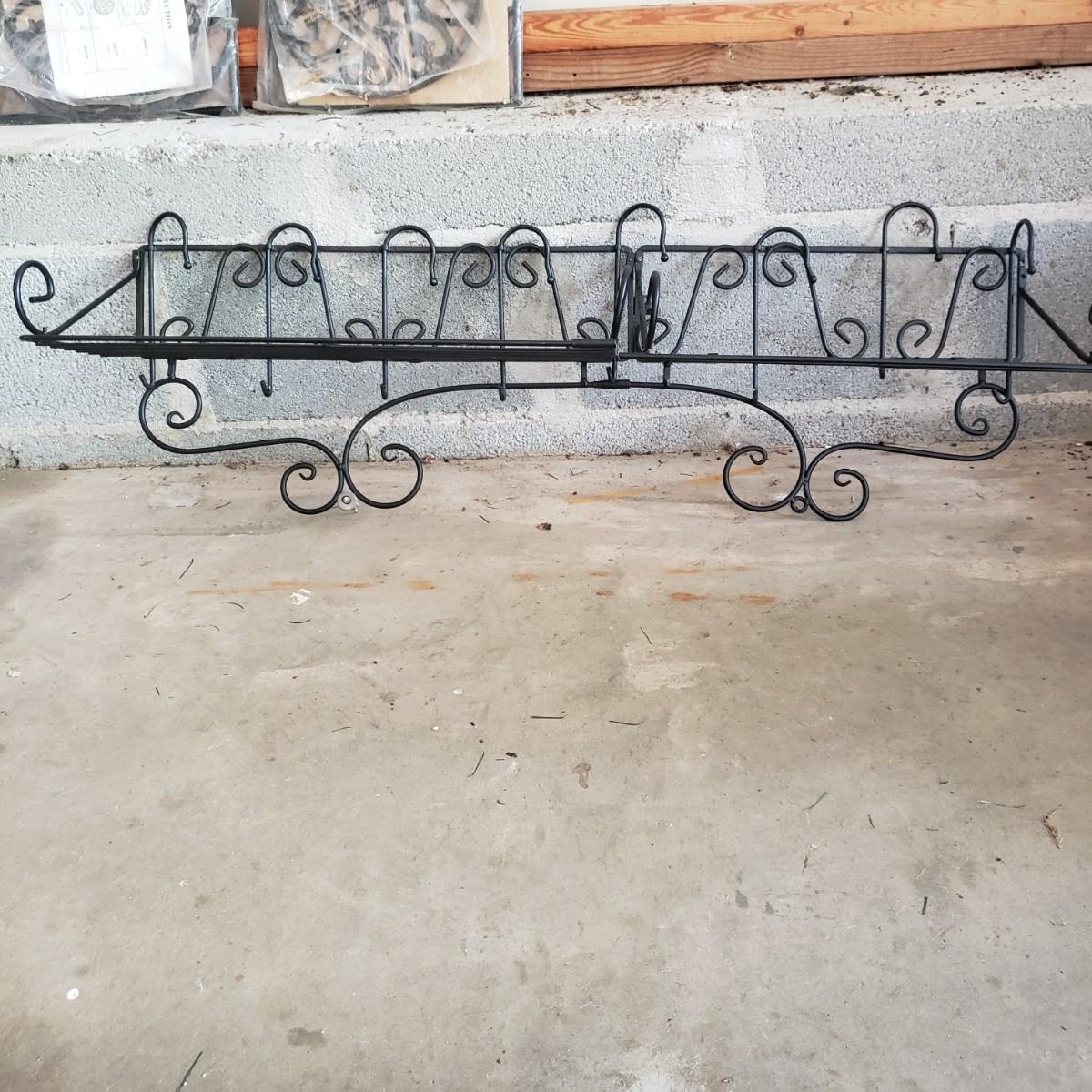 This seven-piece lot contains metal display racks and a small wicker shelving unit. The long rack for plates measures 10" x 54"H. The wicker three drawer shelf measures 11" x 8" x 18"H. The black rack with scrolled metal features needs some screws and nuts to hold it together. The tall six wired basket rack can fold down. The two heavy metal racks are new in the package; it appears the left rack may be missing the piece pointed at on the right rack in the last photo.
