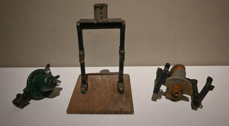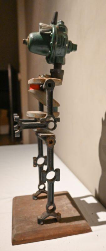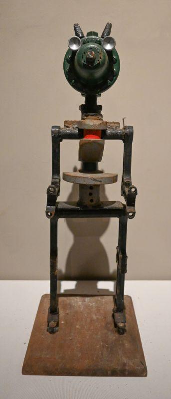 A robot sculpture by an unknown or anonymous artist. Metal on wood. Approx. 7" x 7" x 20.5". Please note, two of the welds have come undone, as photographed. Assembled robot stands very unsteadily.