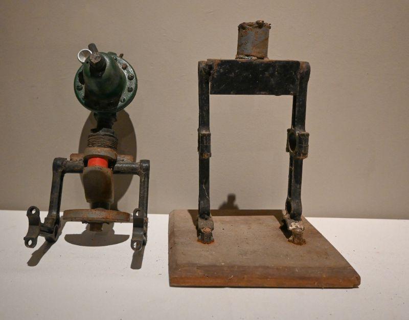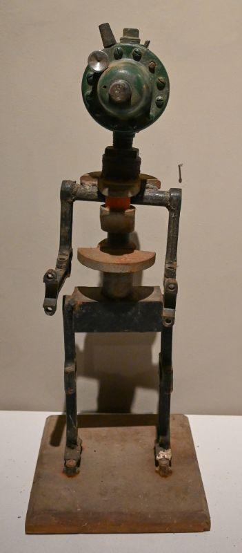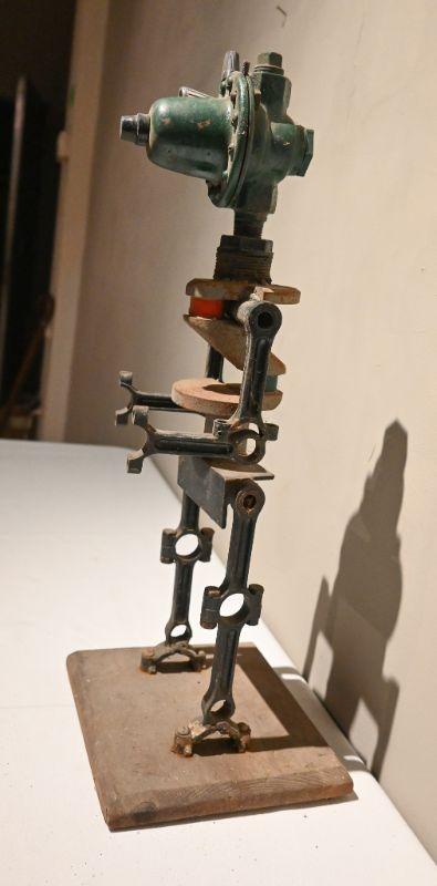A robot sculpture by an unknown or anonymous artist. Metal on wood. Approx. 8" x 8" x 20.5". Please note, one of the welds has come undone, as photographed. Assembled robot stands very unsteadily.
