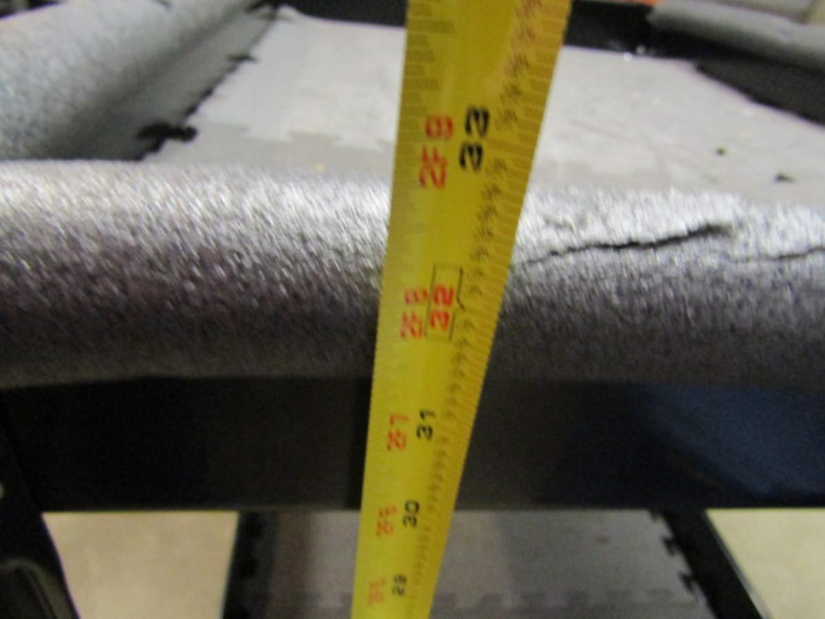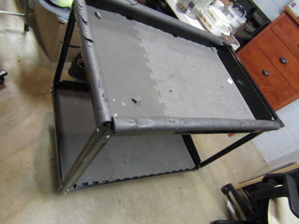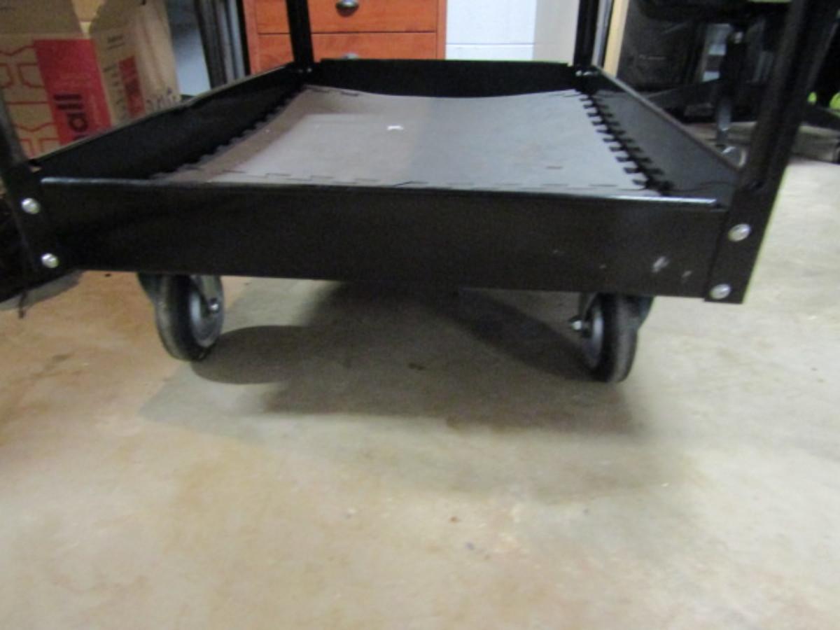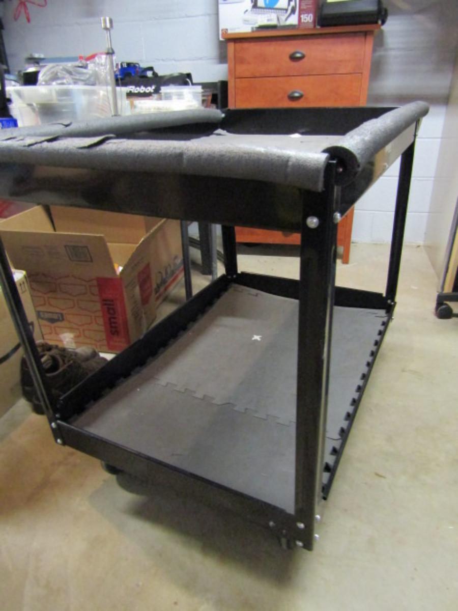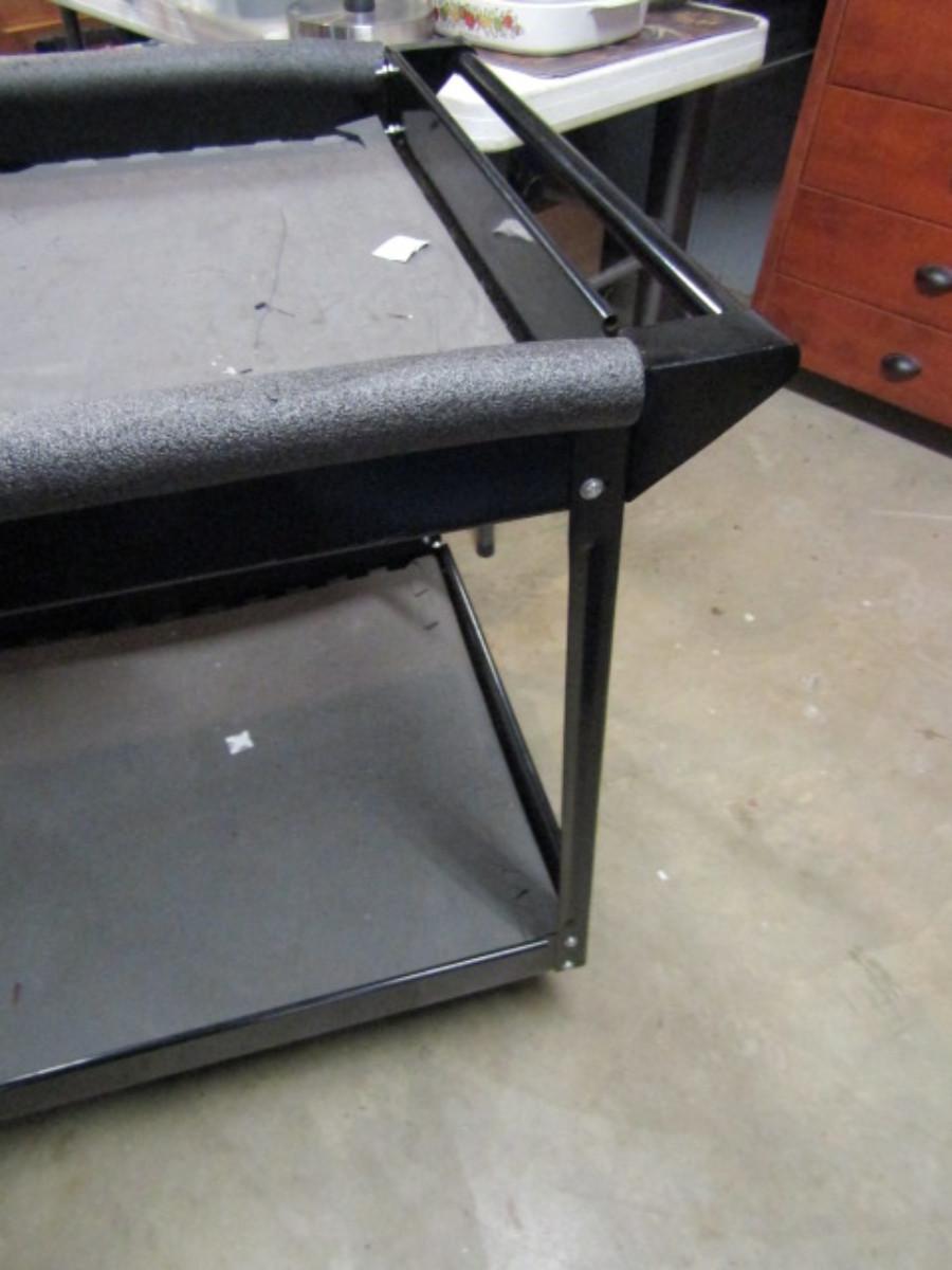 Metal Rolling Cart. The pictures of this item are difficult to decipher- rubber/foam 'bumpers' have been attached around the top edge and rubber has been put down on both flat surfaces.