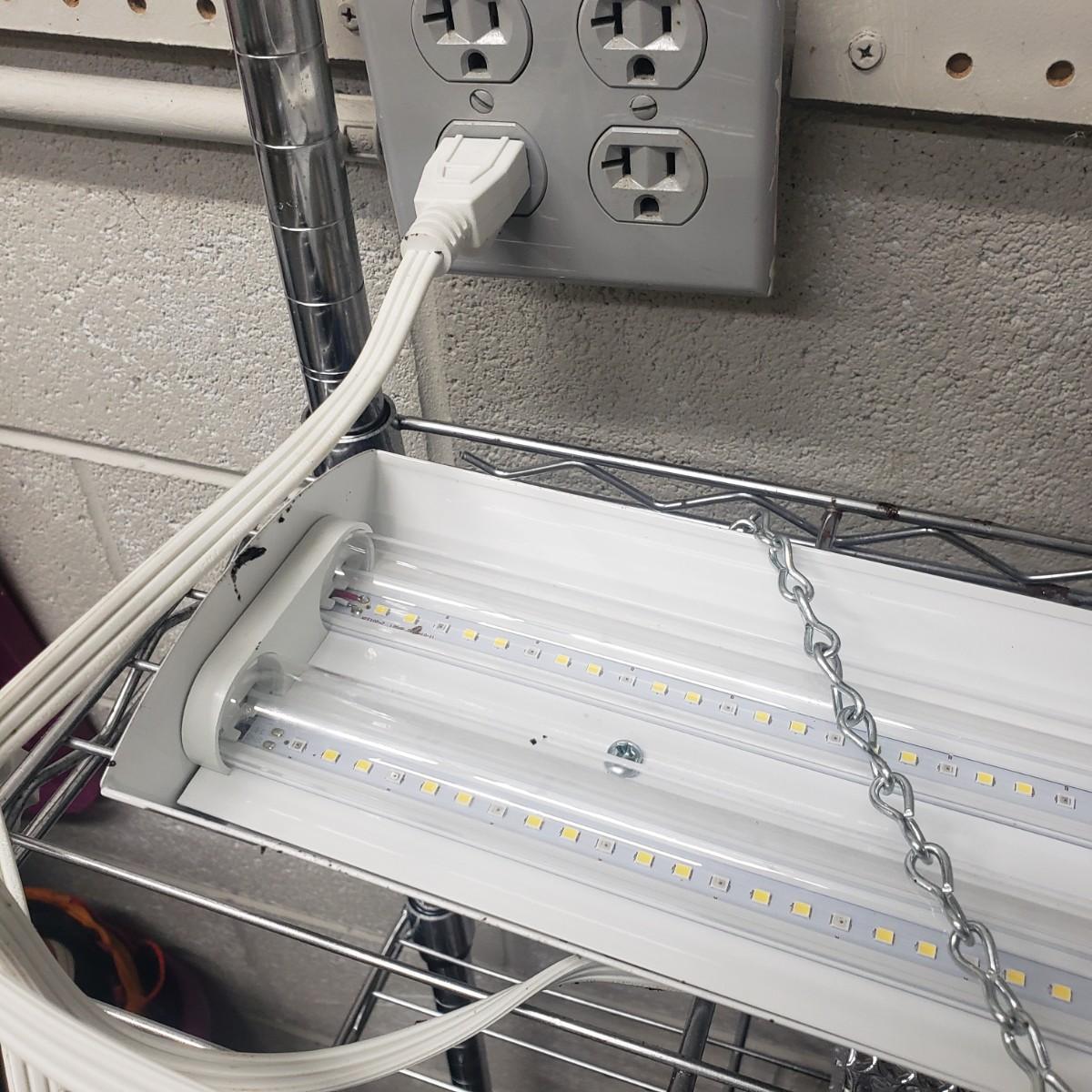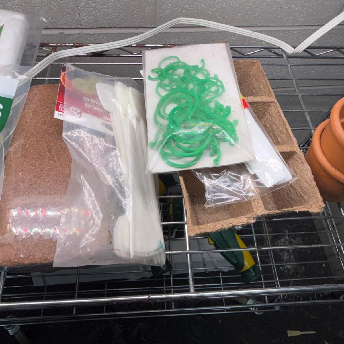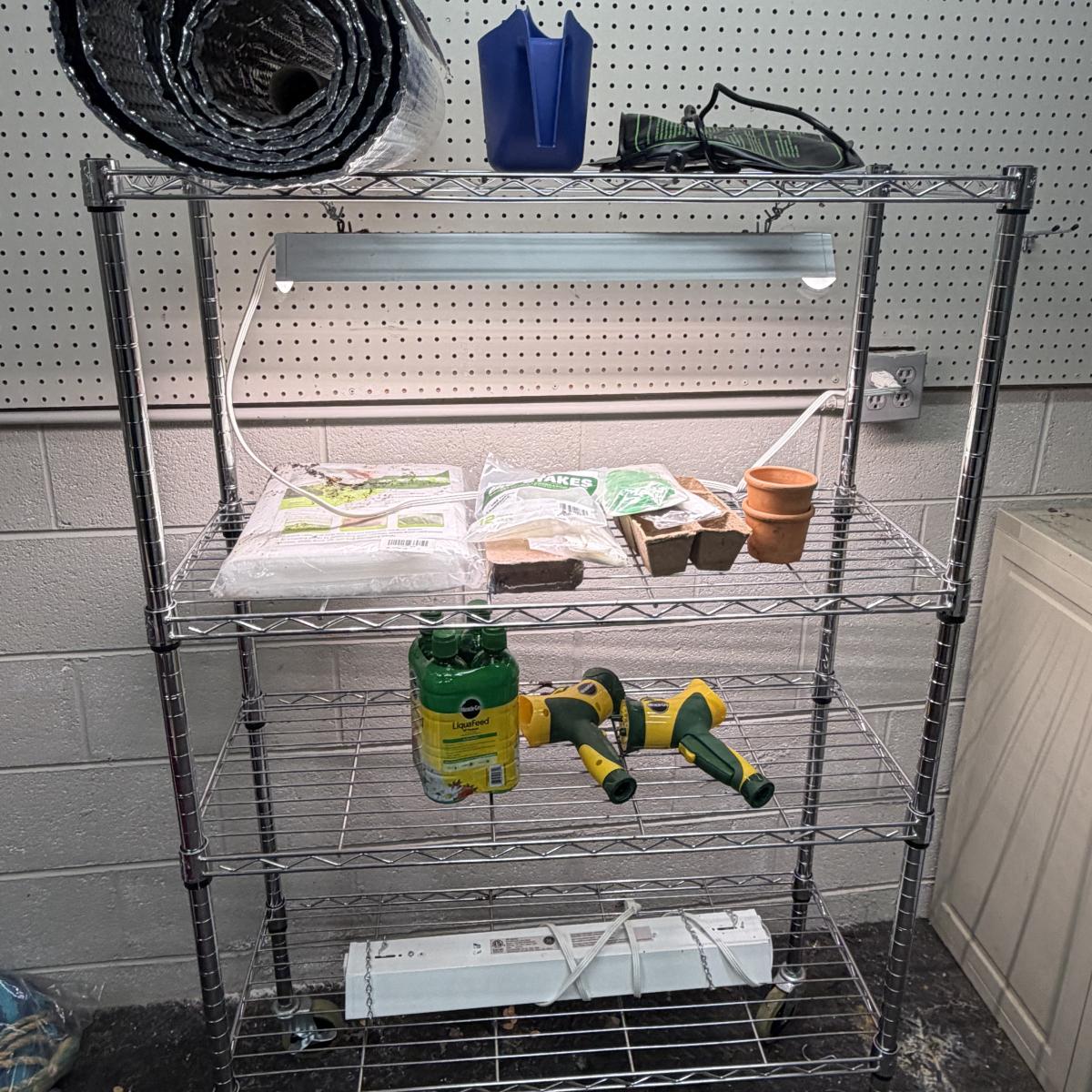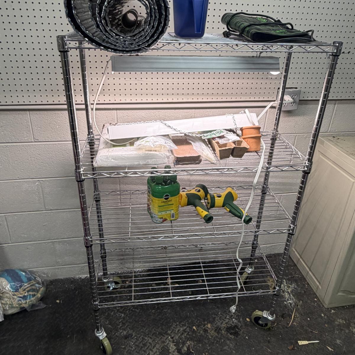 Lot includes a metal rolling shelving unit, two 24” LED lights, seed warmer, two small plant pots, plastic and more. Shelving unit measures 36” x 14” x 58”H. Of the two lights only one lights up when plugged in, but we included it just in case its a bulb replacement. The roll of silver insulation wrap will insulate the shelf. The seed warmer also warmed up when plugged in.