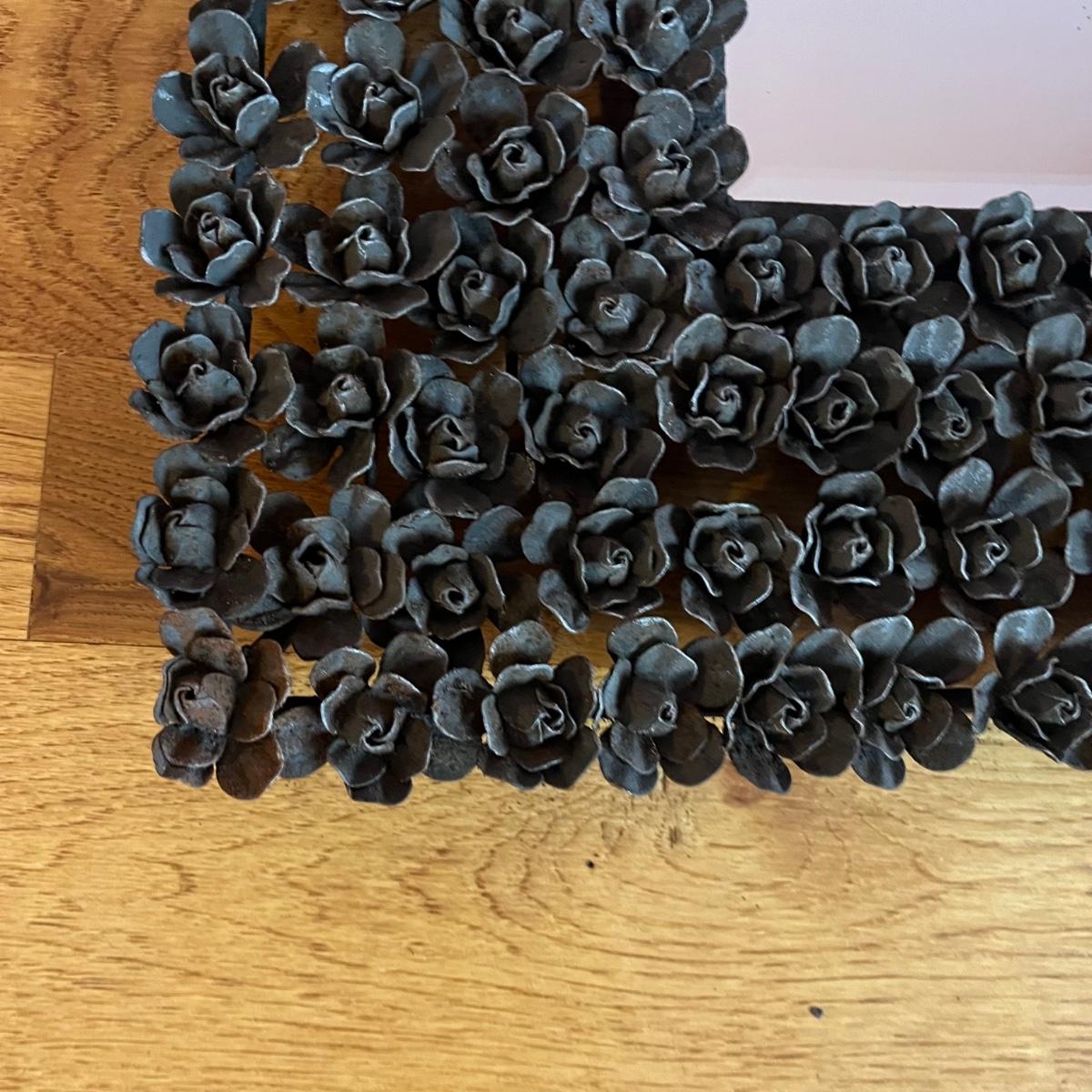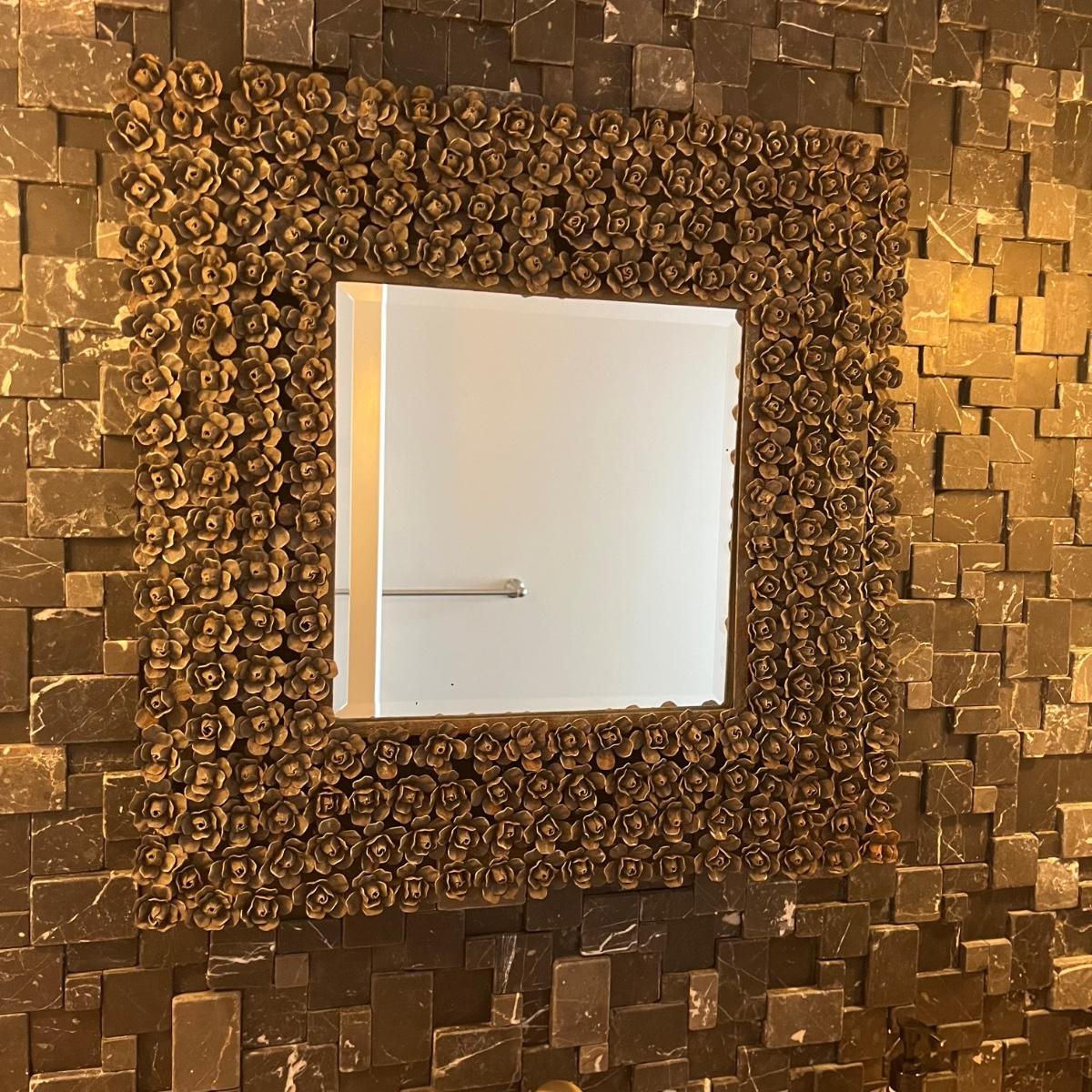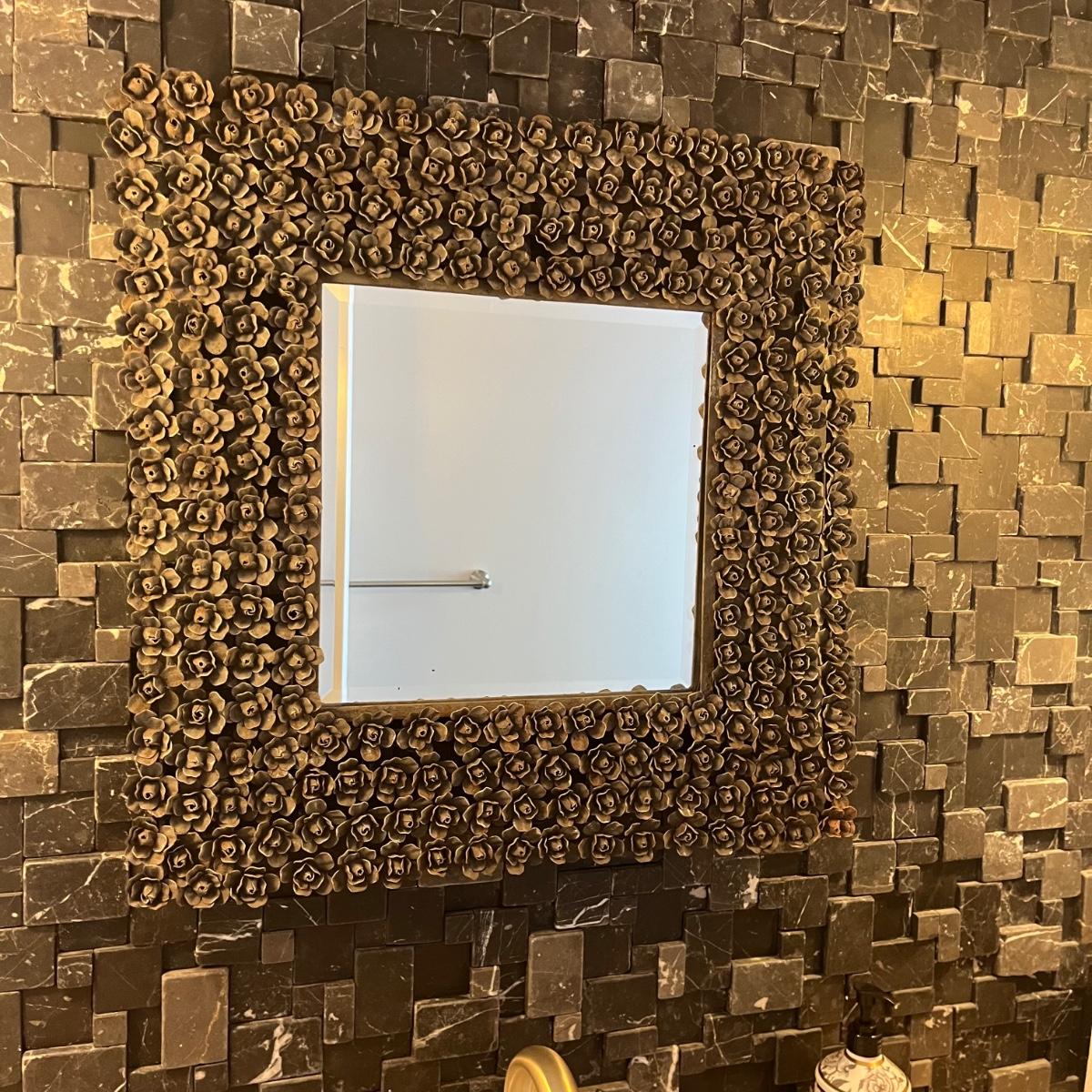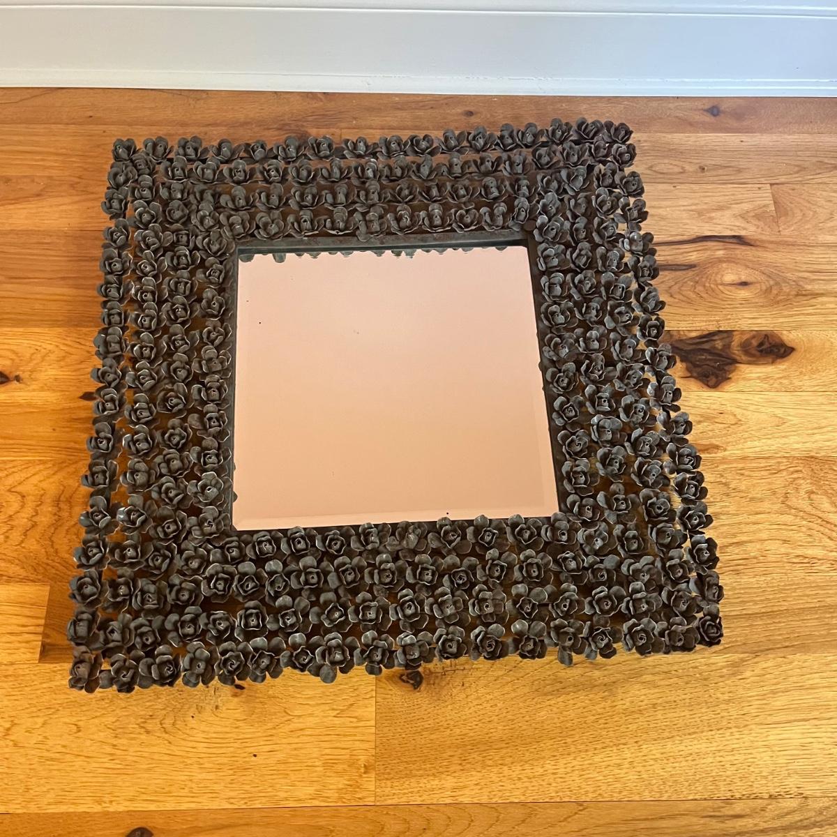 Lot includes a beveled mirror with metal roses surrounding it. Mirror measures 24” x 24” x 2”.