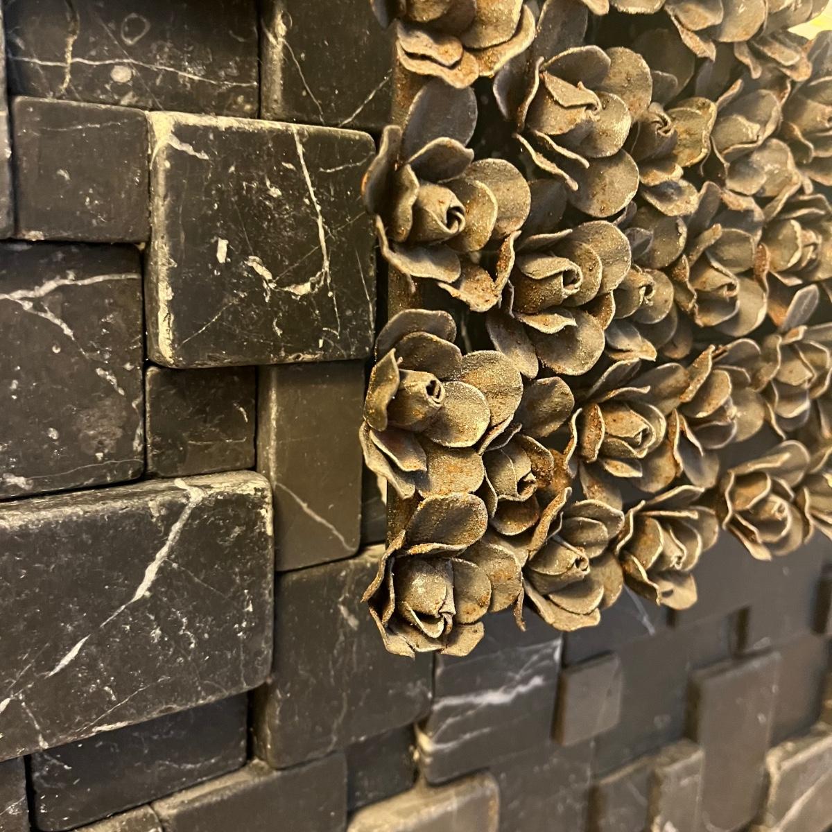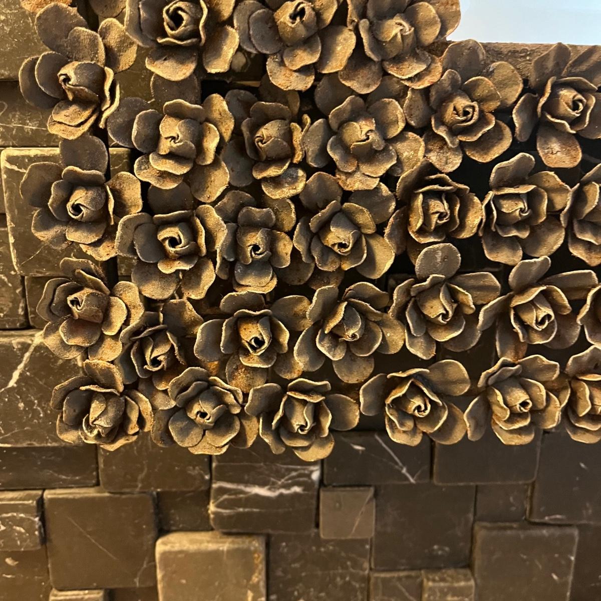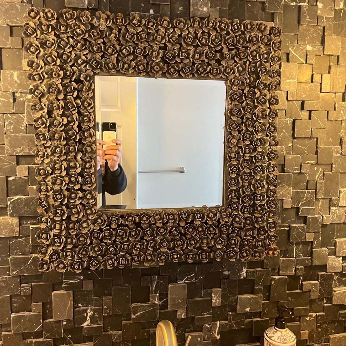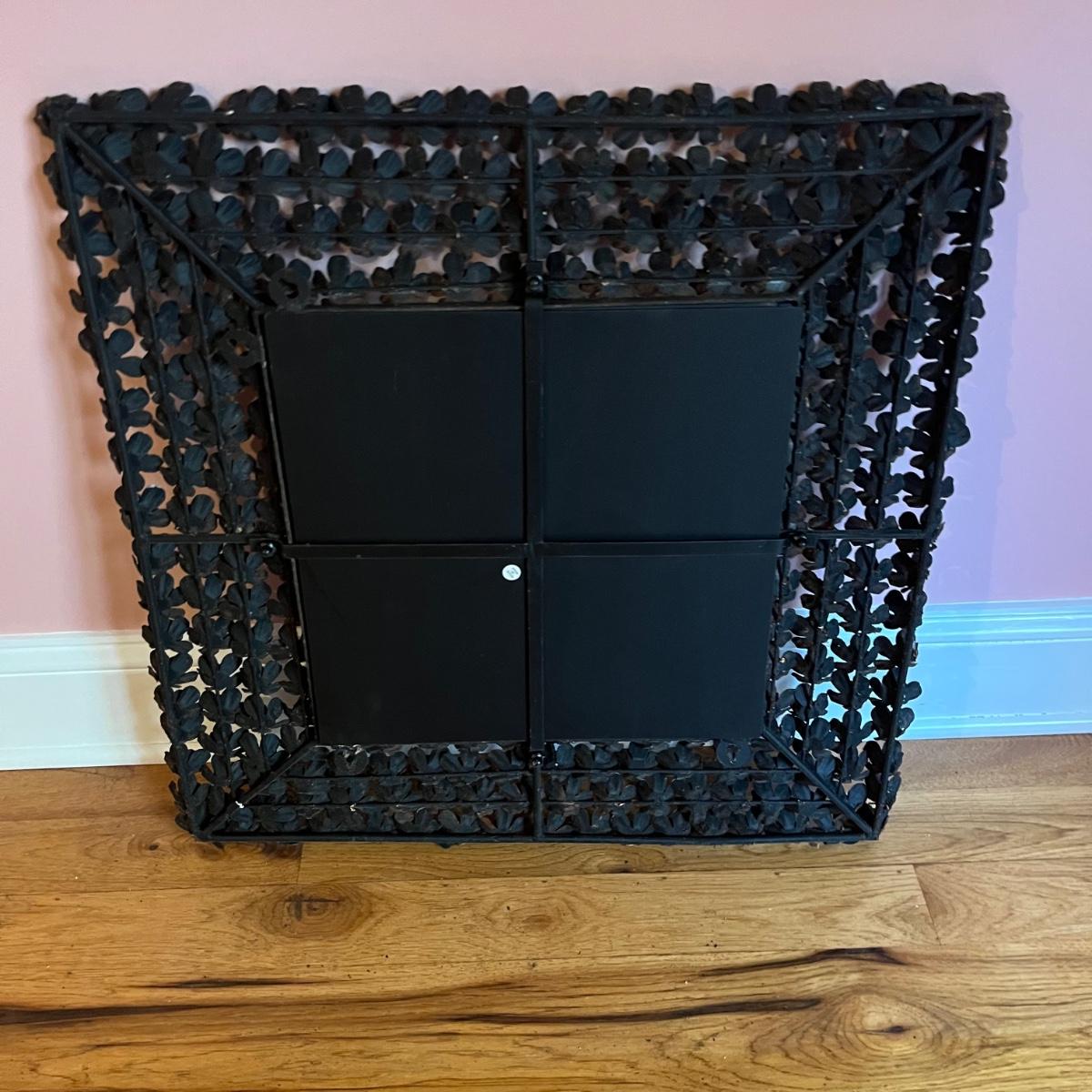 Lot includes a beveled mirror with metal roses surrounding it. Mirror measures 24” x 24” x 2”.