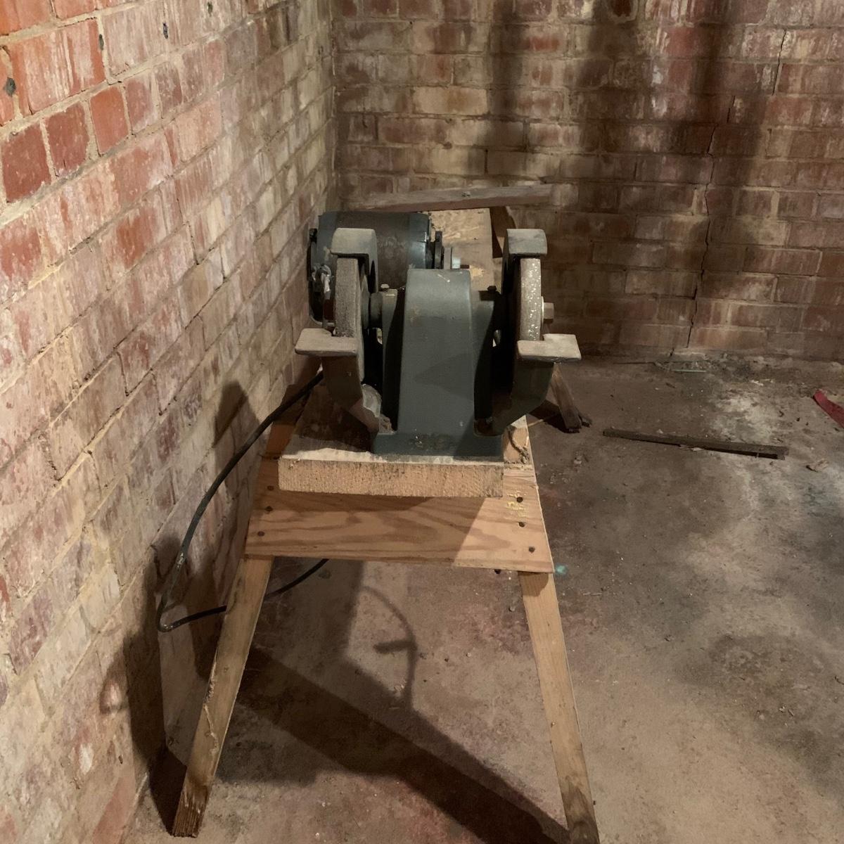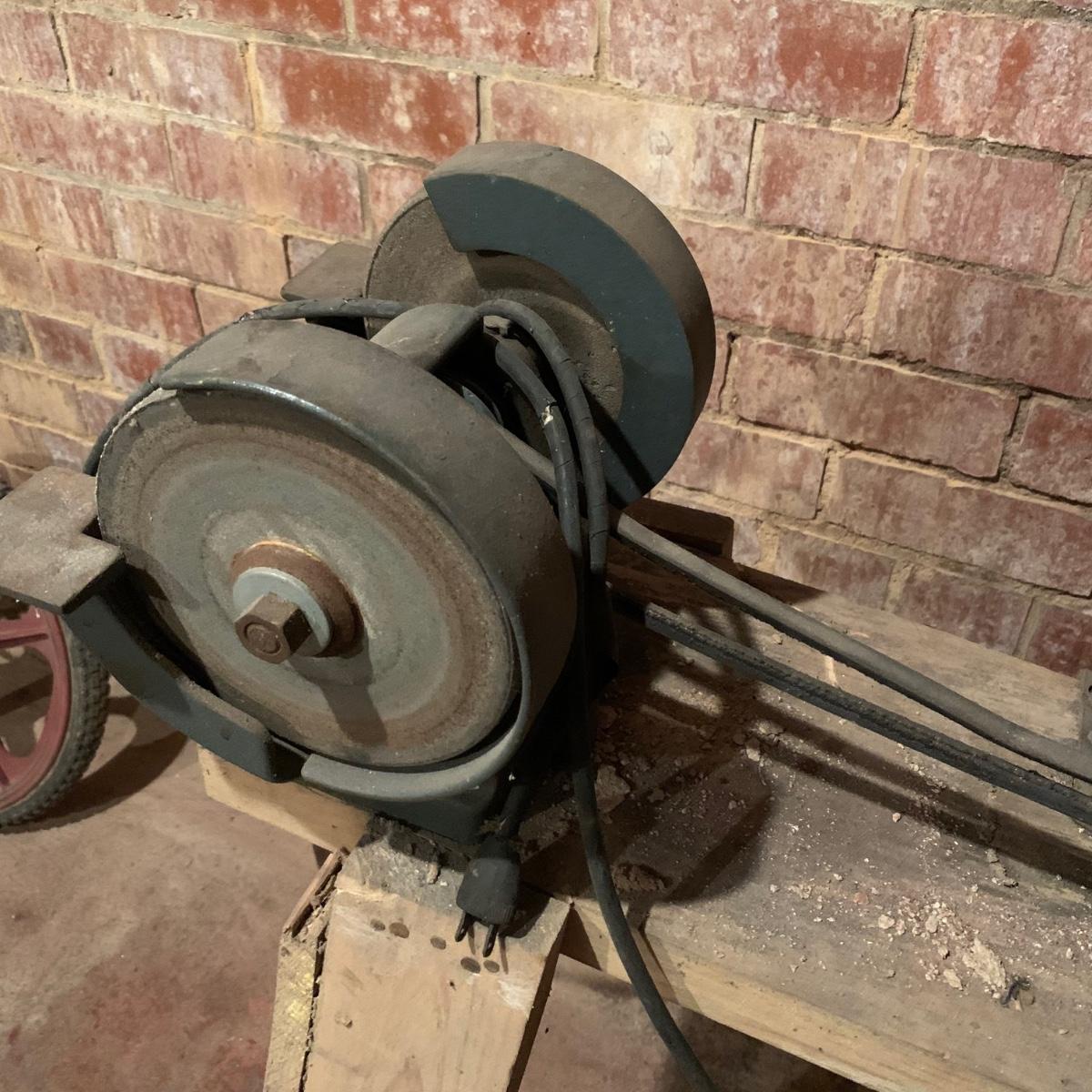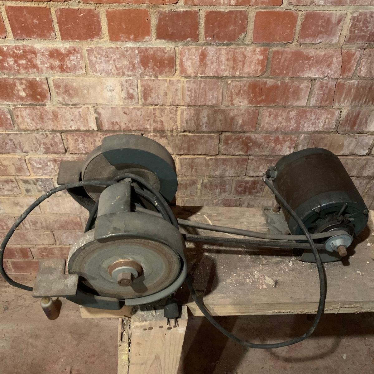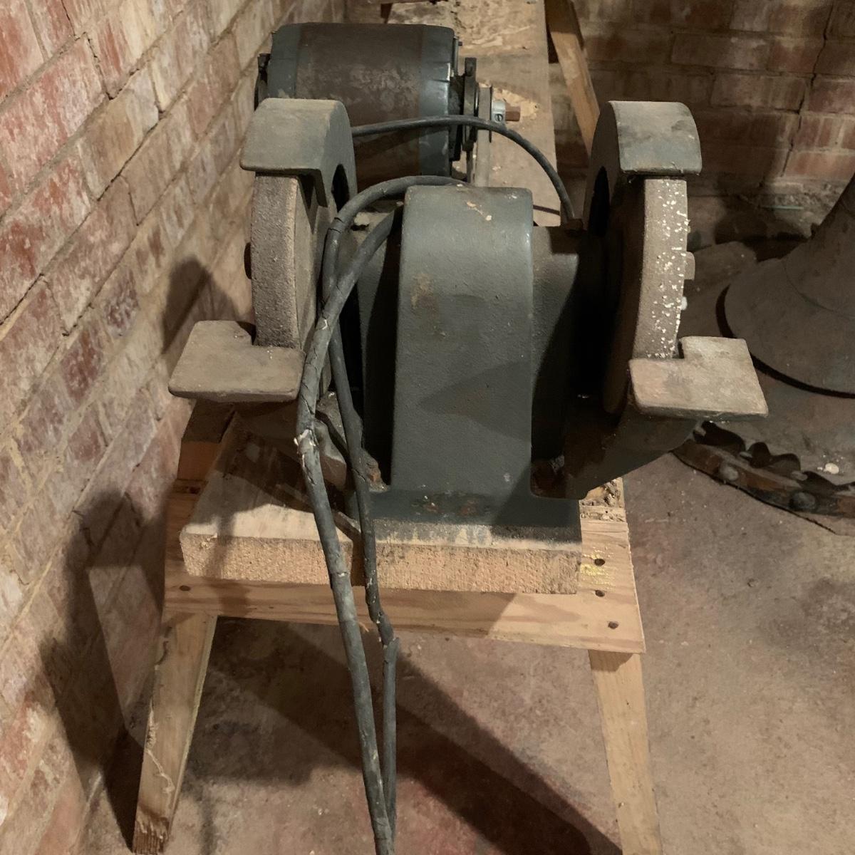 This lot includes a metal sander on a wooden stand and oil lubricant. The sander is in fair condition as it is pretty rusted but can confirm it turns on. The wood stand has some wear on the top and the legs (see photos) and is a bit wobbly. The machine measures about 54in x 11.5in x 41in. Local pickup only.