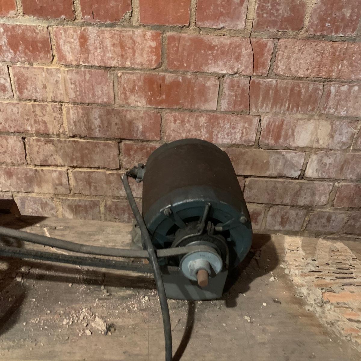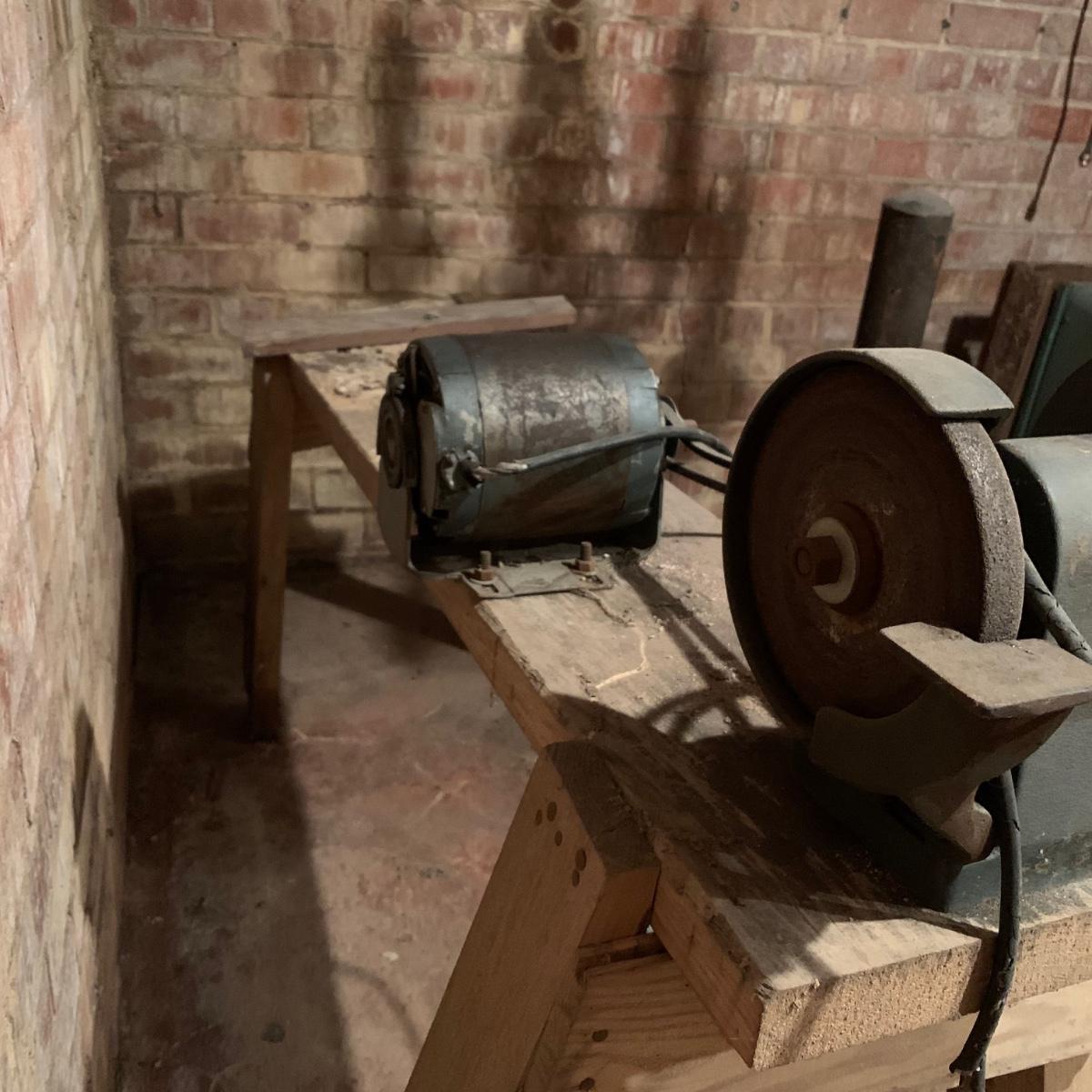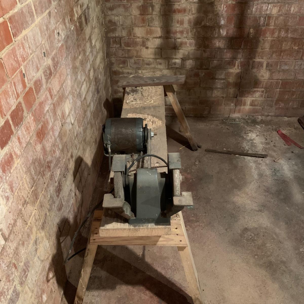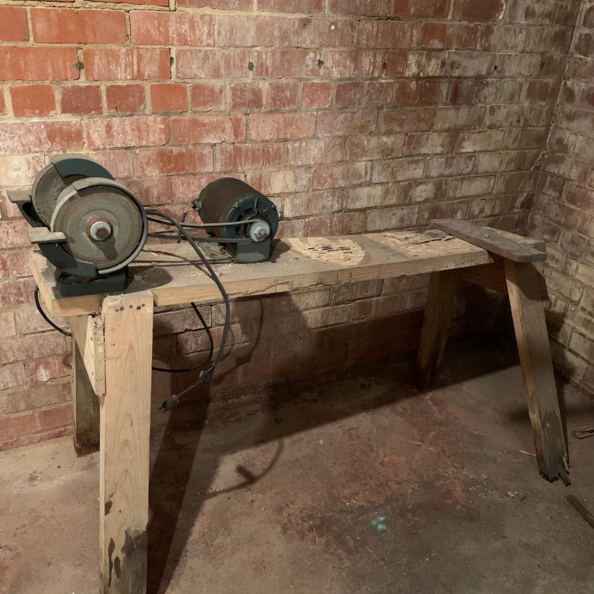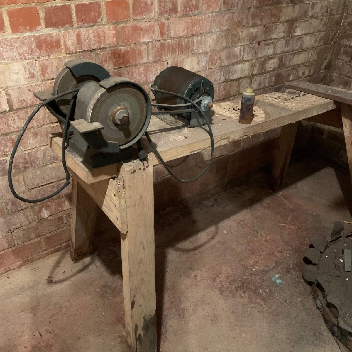 This lot includes a metal sander on a wooden stand and oil lubricant. The sander is in fair condition as it is pretty rusted but can confirm it turns on. The wood stand has some wear on the top and the legs (see photos) and is a bit wobbly. The machine measures about 54in x 11.5in x 41in. Local pickup only.