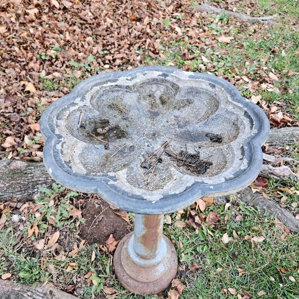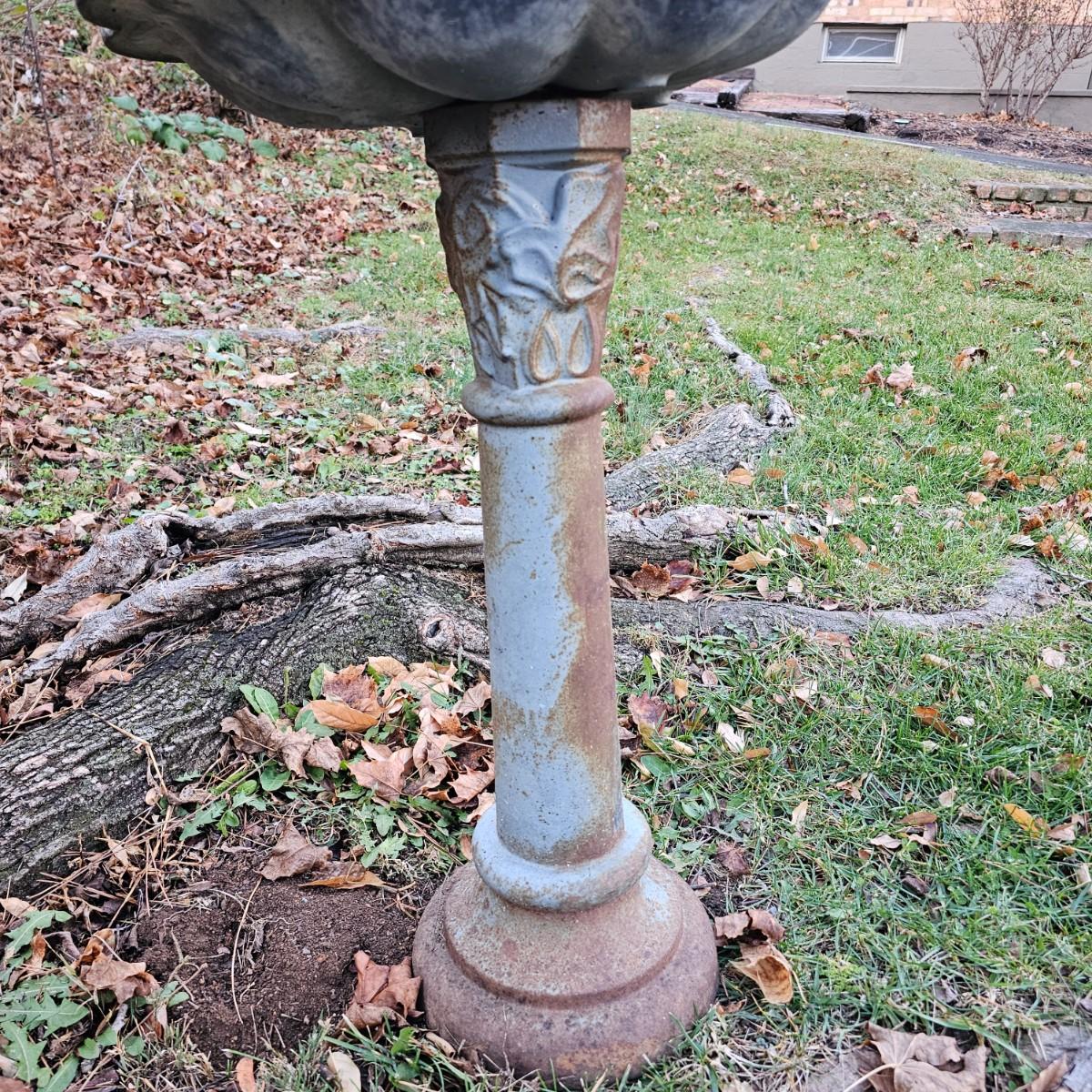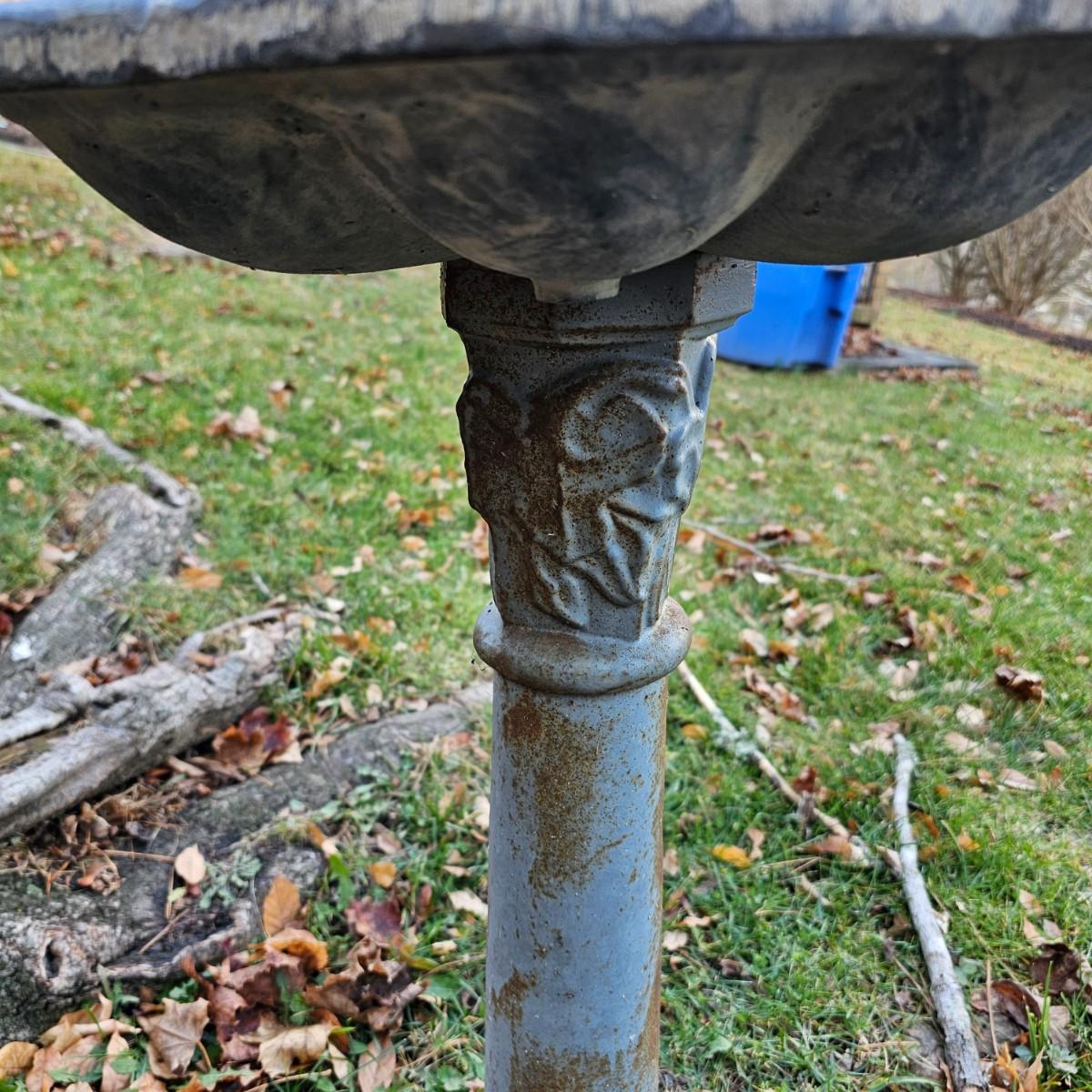 Dainty small metal birdbath with scallop edge bowl and decorated pedestal. Item measures 18"D x 28.5"H. Has some normal wear. See photos for details. Local pickup only.