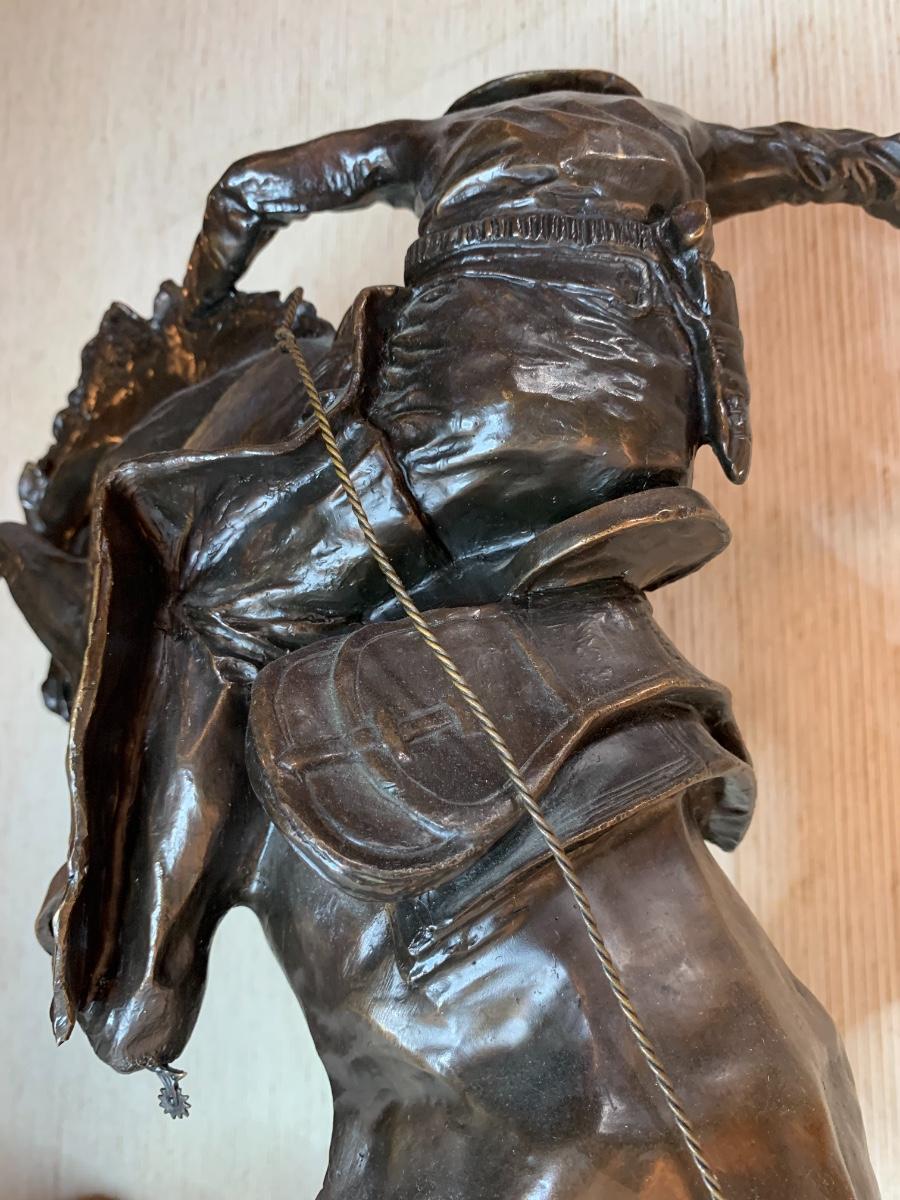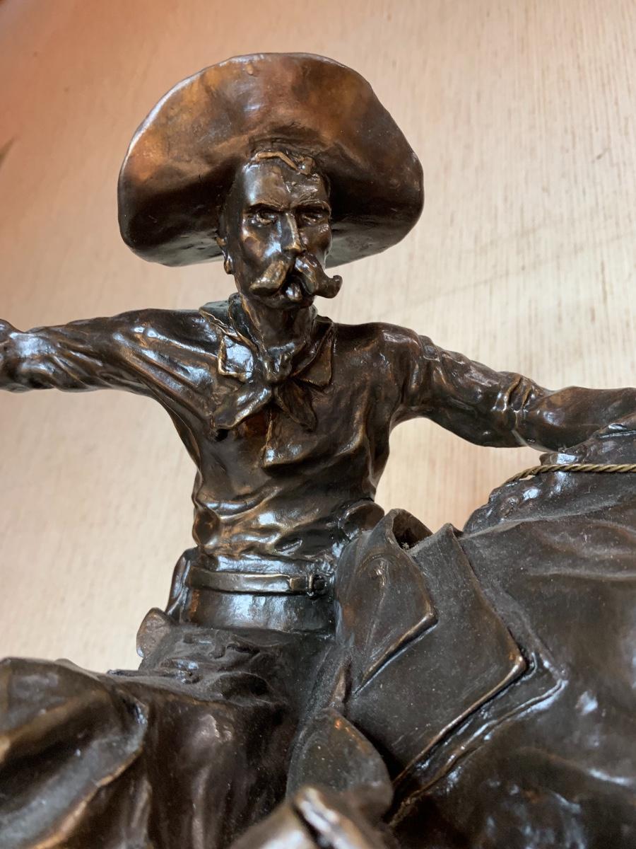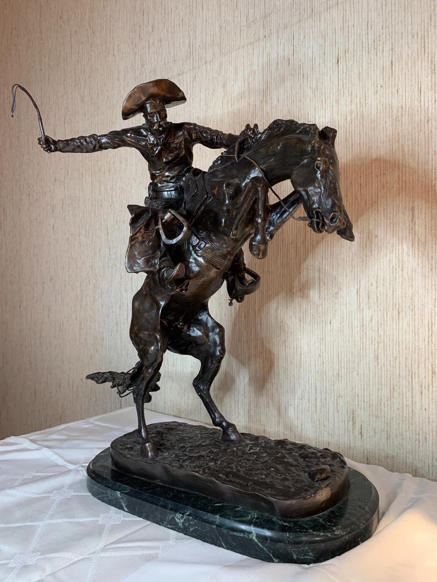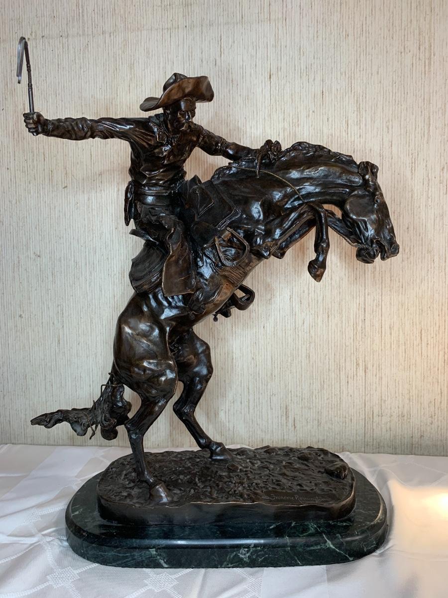 Cowboy on bucking horse. Dark brown on dark green marble base.