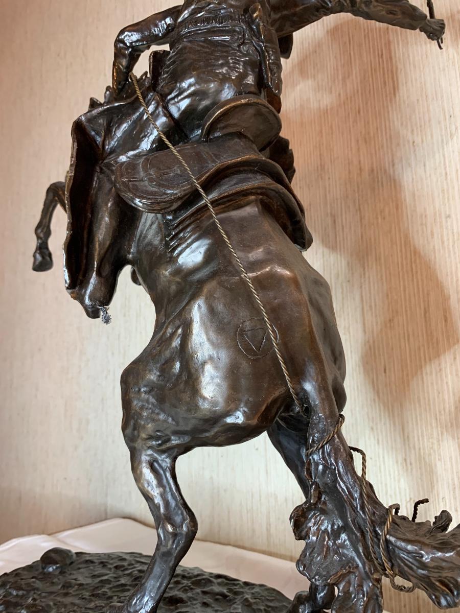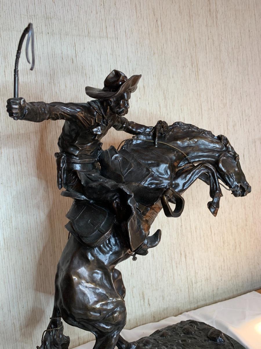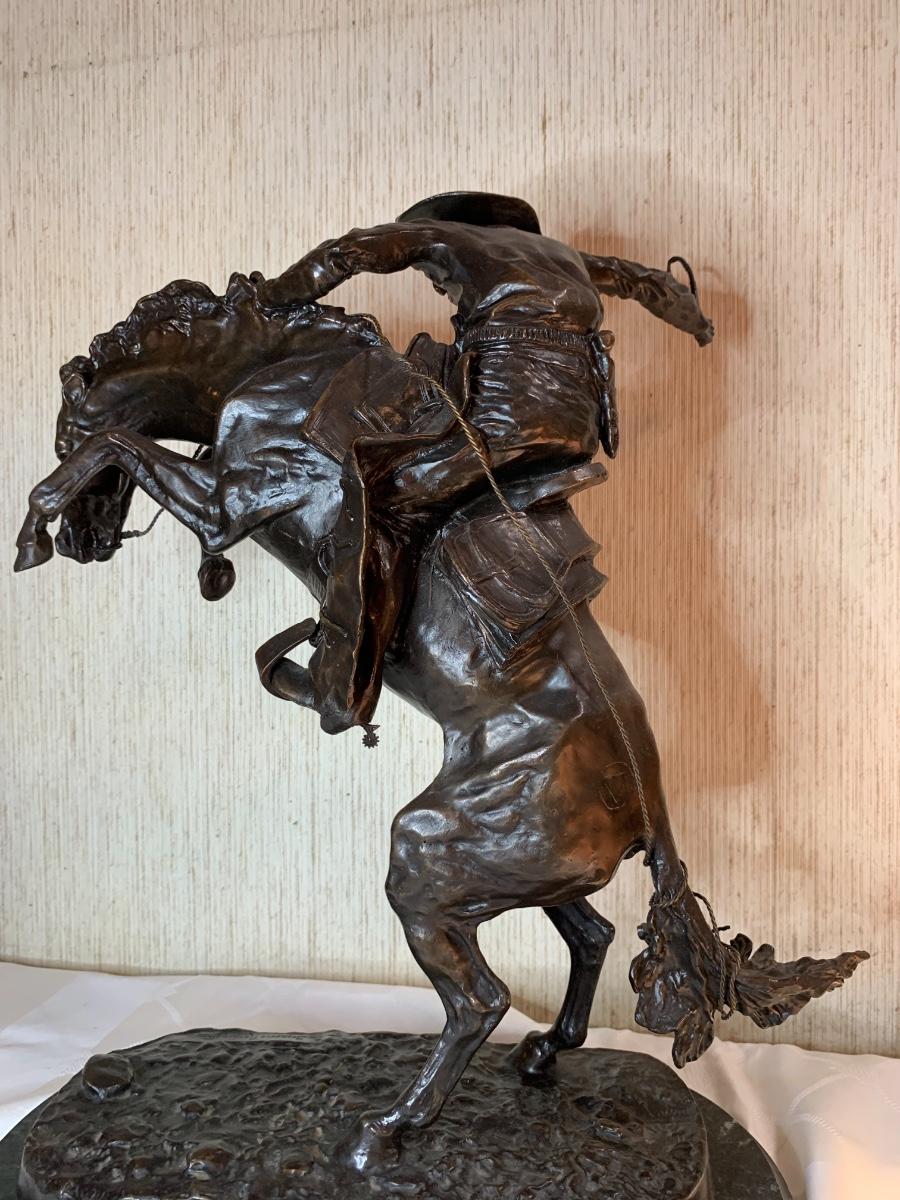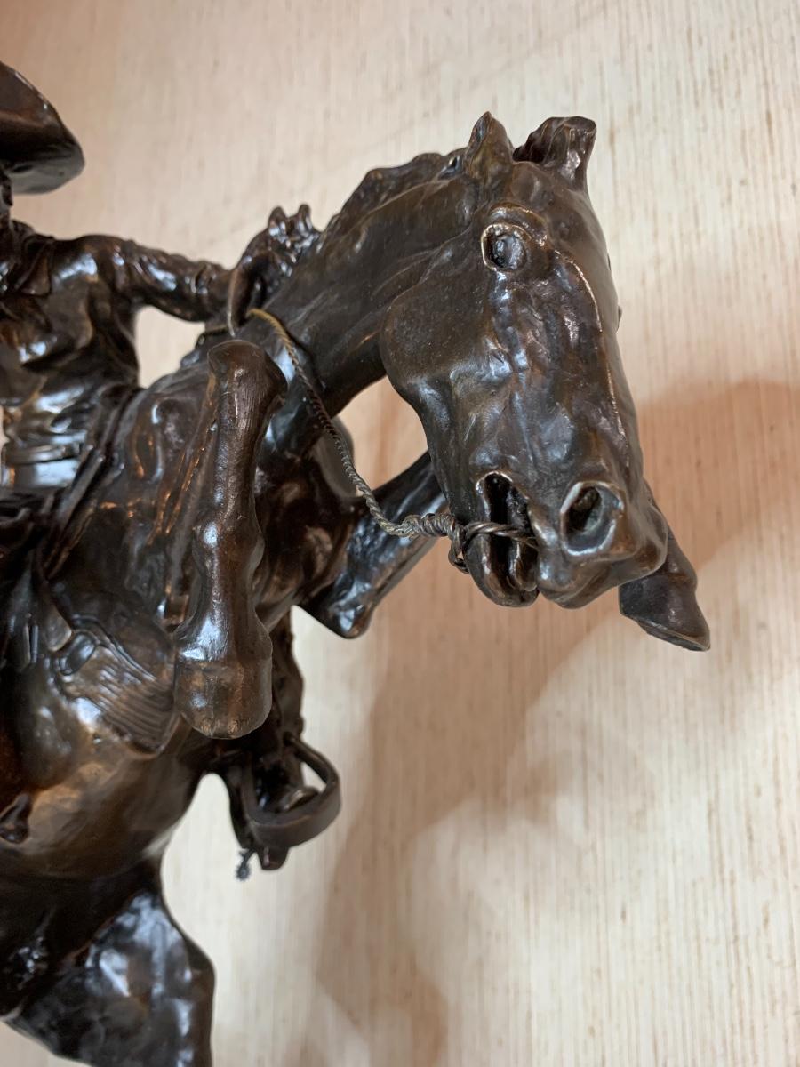 Cowboy on bucking horse. Dark brown on dark green marble base.