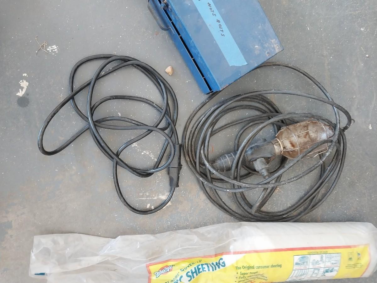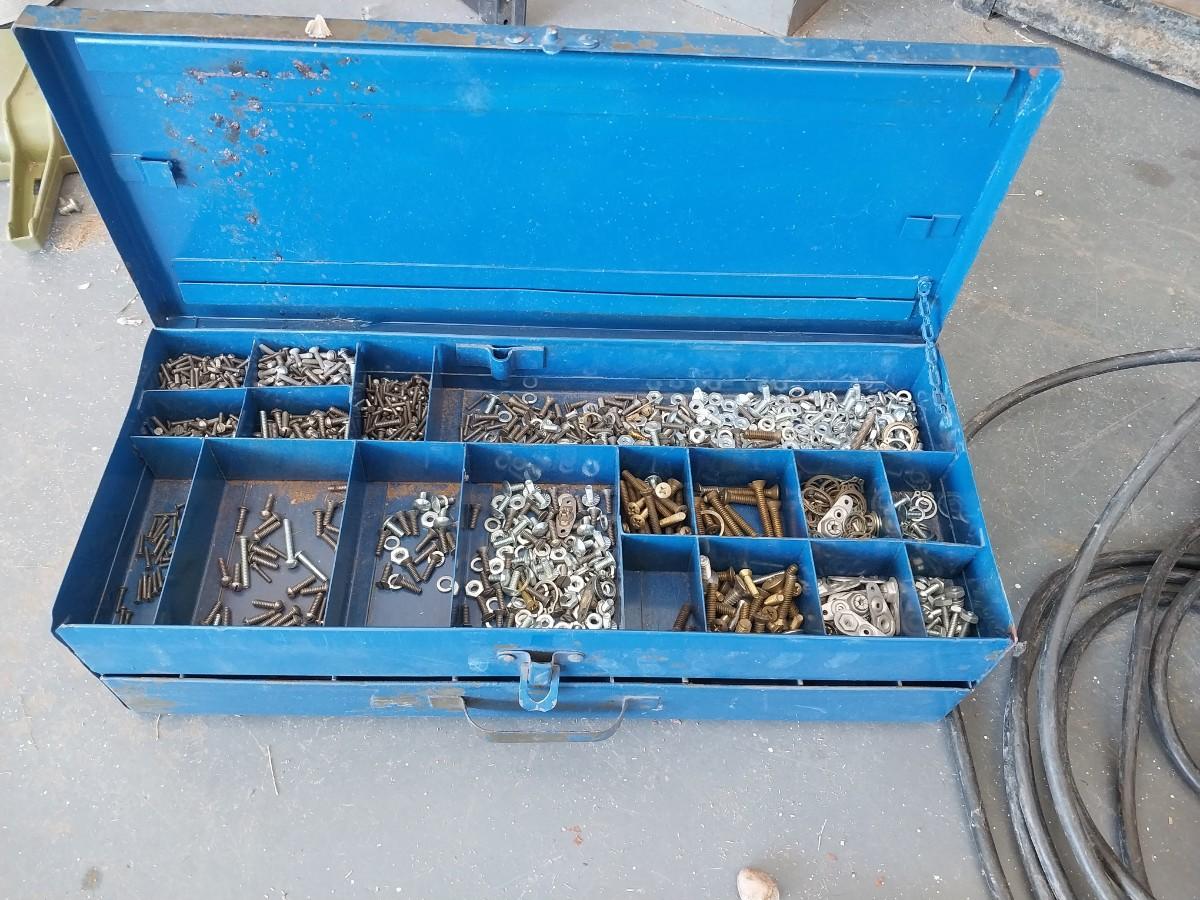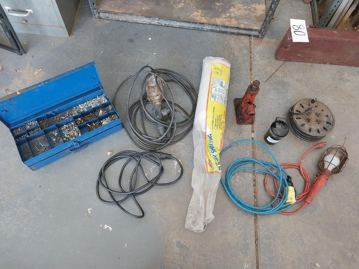 METAL SECTIONED BOX, TROUBLE LIGHTS, BOTTLE JACK AND MORE