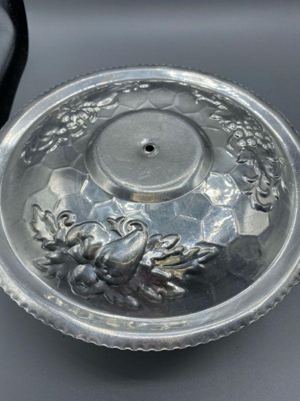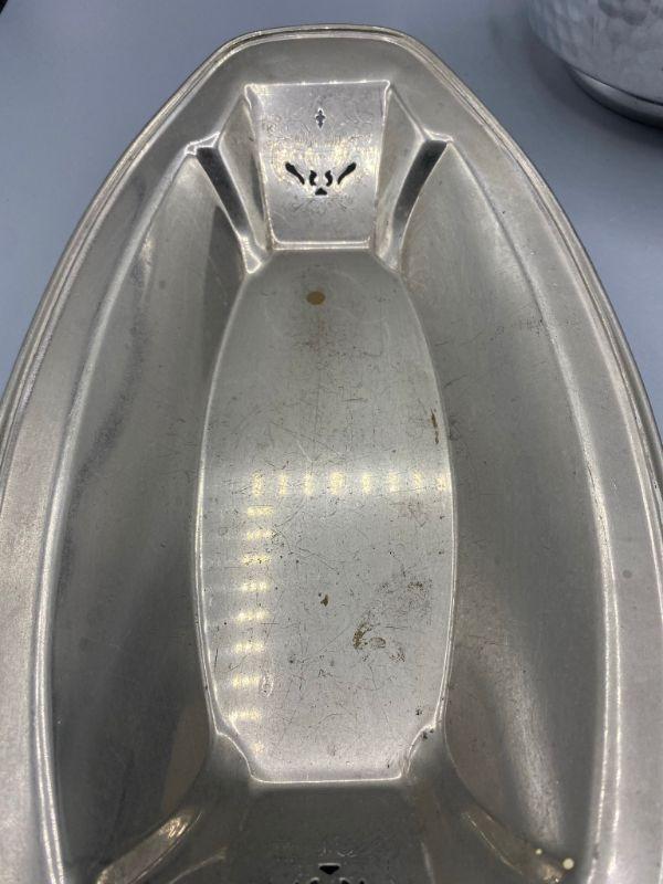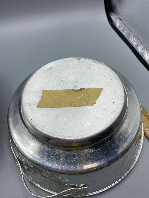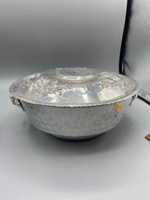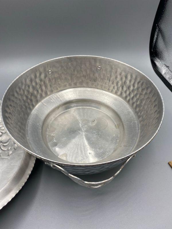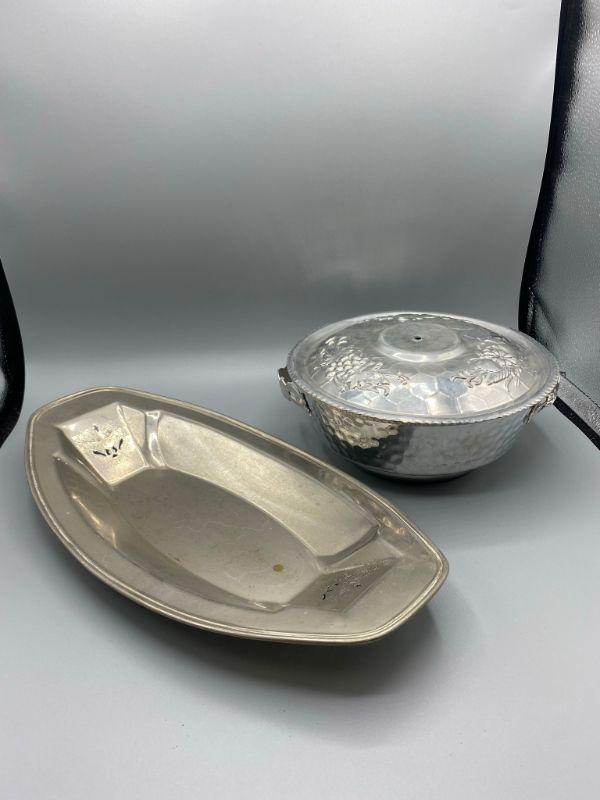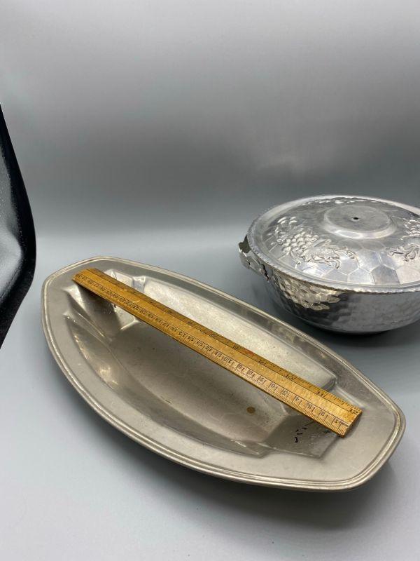 Pair of metal serving dishes. Oblong dish is over 12" and has some signs of age. The lidded casserole is missing the knob on top. It is super light like aluminum.