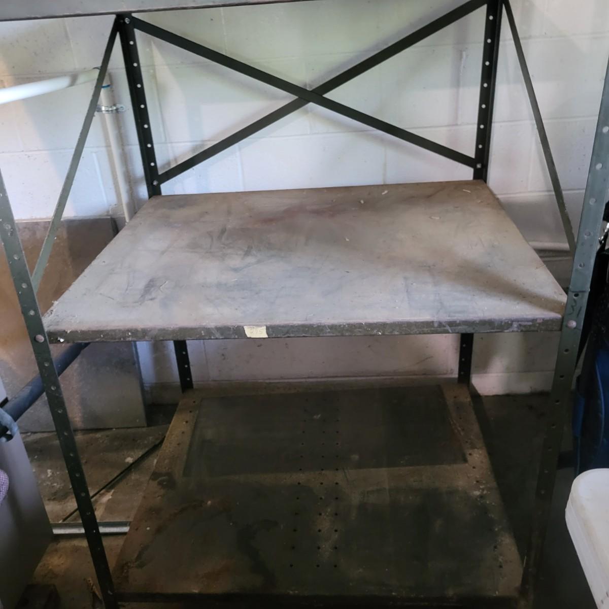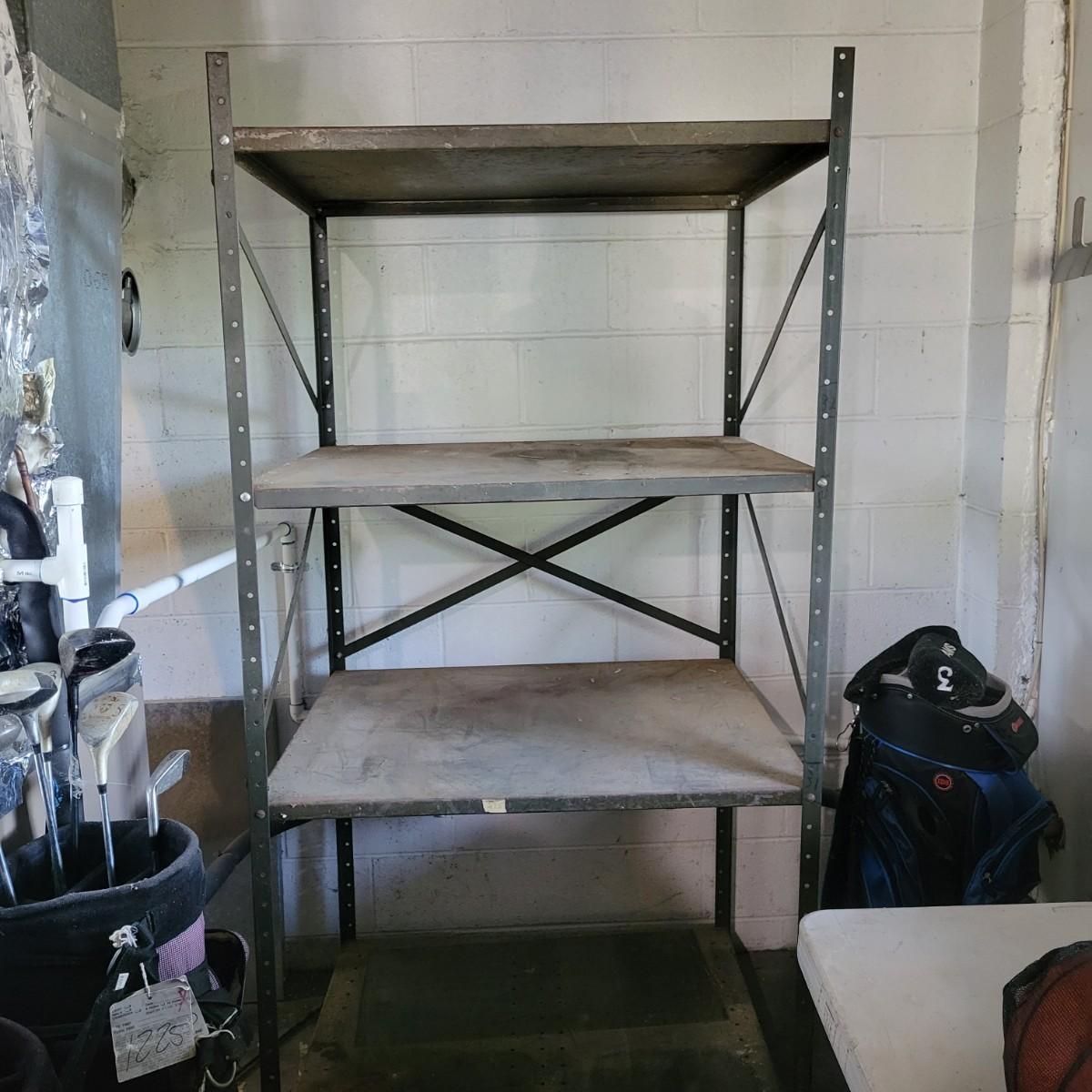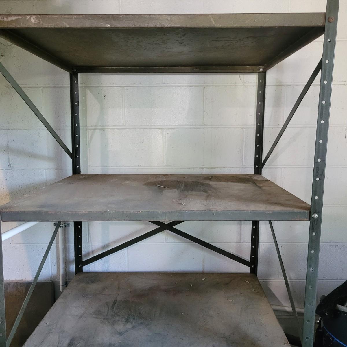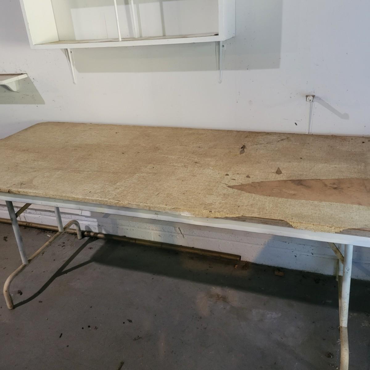 A metal shelving unit and folding table in good condition. Shelving unit is made of coated metal and has four shelves that can be adjusted. Measures approximately 36" x 30" x 75". Folding table does have some damage to its surface and features a metal base. Measures approximately 72" x 30" x 29" Local pickup only