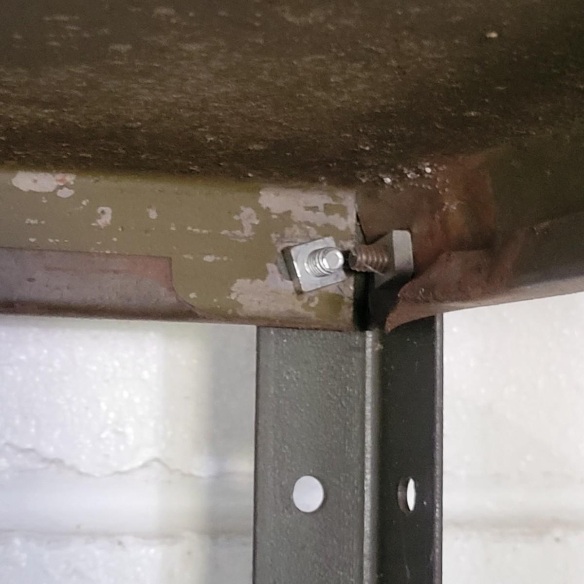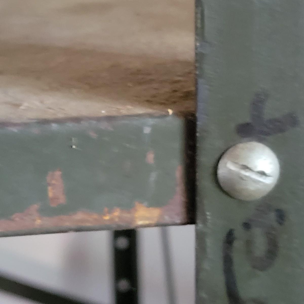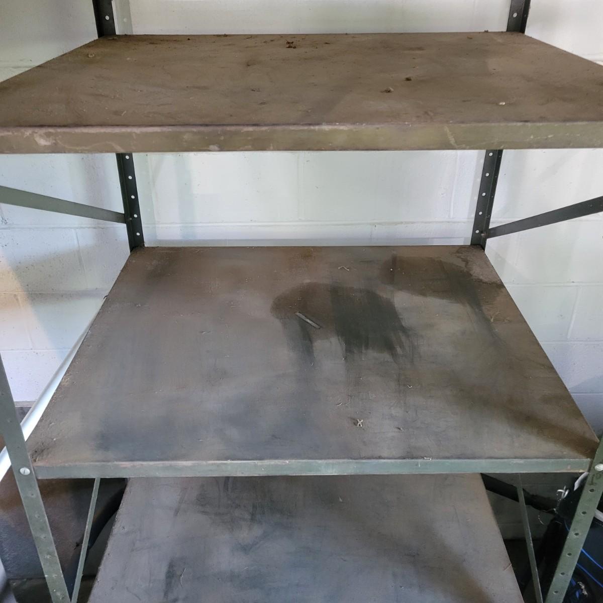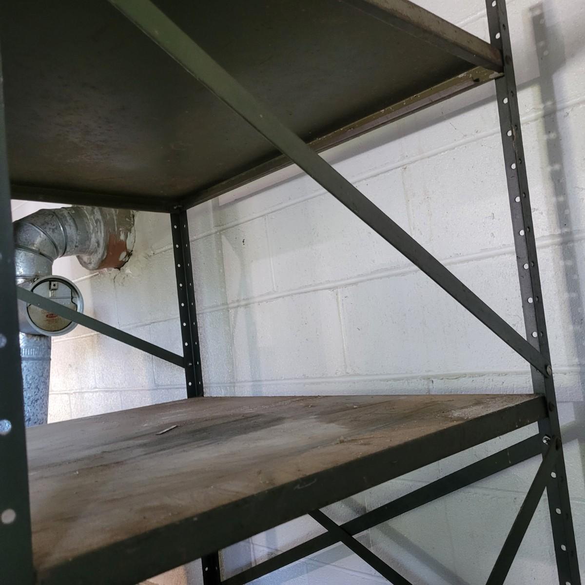 A metal shelving unit and folding table in good condition. Shelving unit is made of coated metal and has four shelves that can be adjusted. Measures approximately 36" x 30" x 75". Folding table does have some damage to its surface and features a metal base. Measures approximately 72" x 30" x 29" Local pickup only
