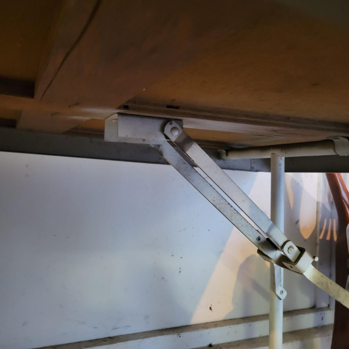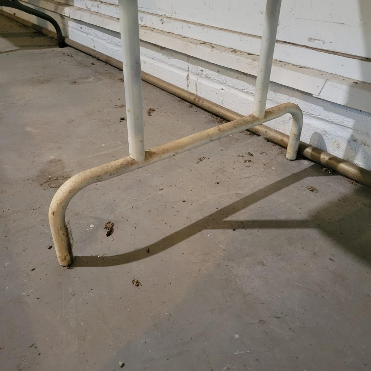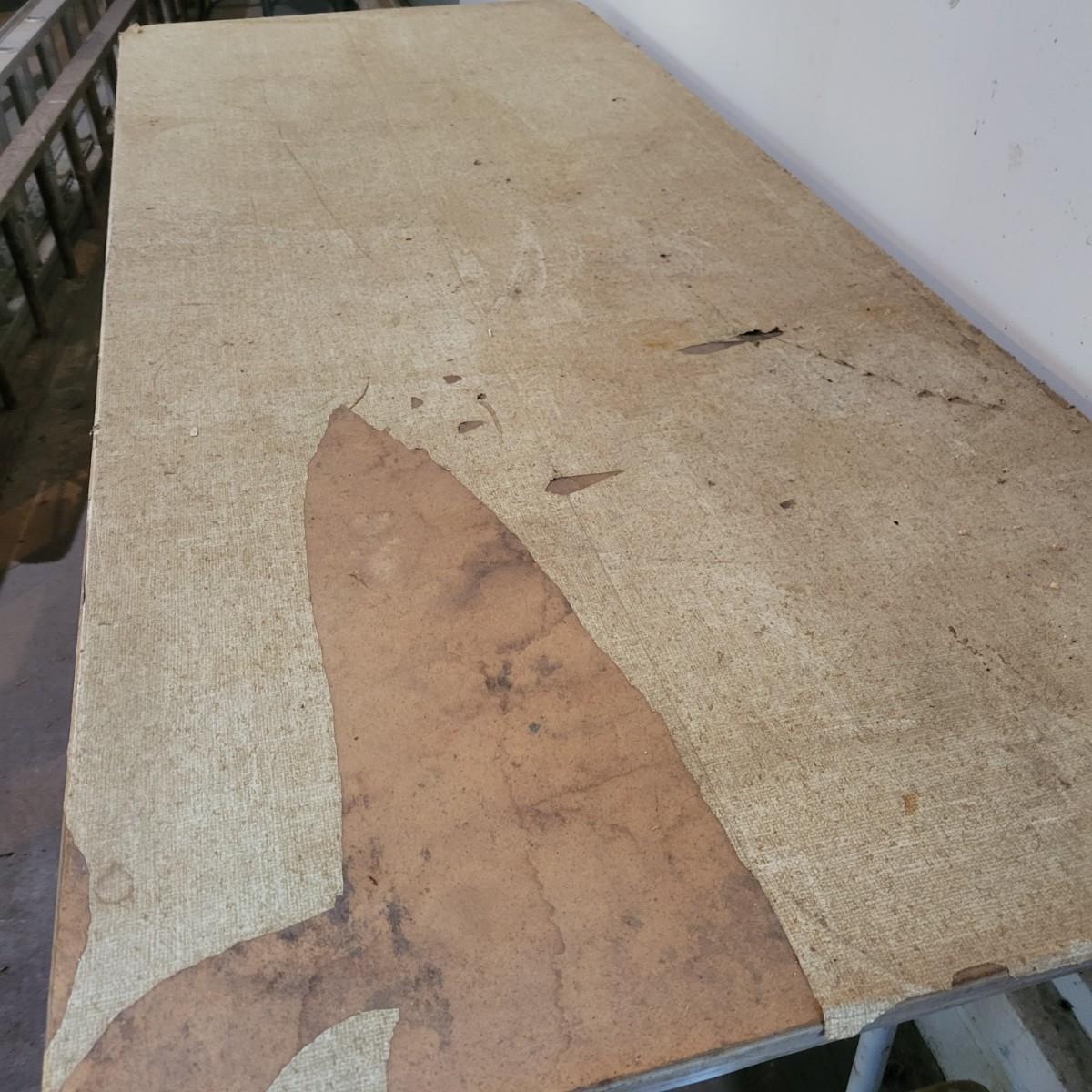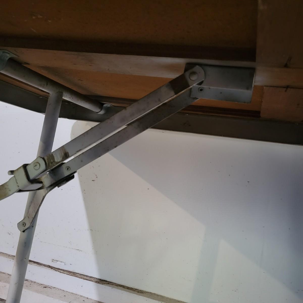 A metal shelving unit and folding table in good condition. Shelving unit is made of coated metal and has four shelves that can be adjusted. Measures approximately 36" x 30" x 75". Folding table does have some damage to its surface and features a metal base. Measures approximately 72" x 30" x 29" Local pickup only