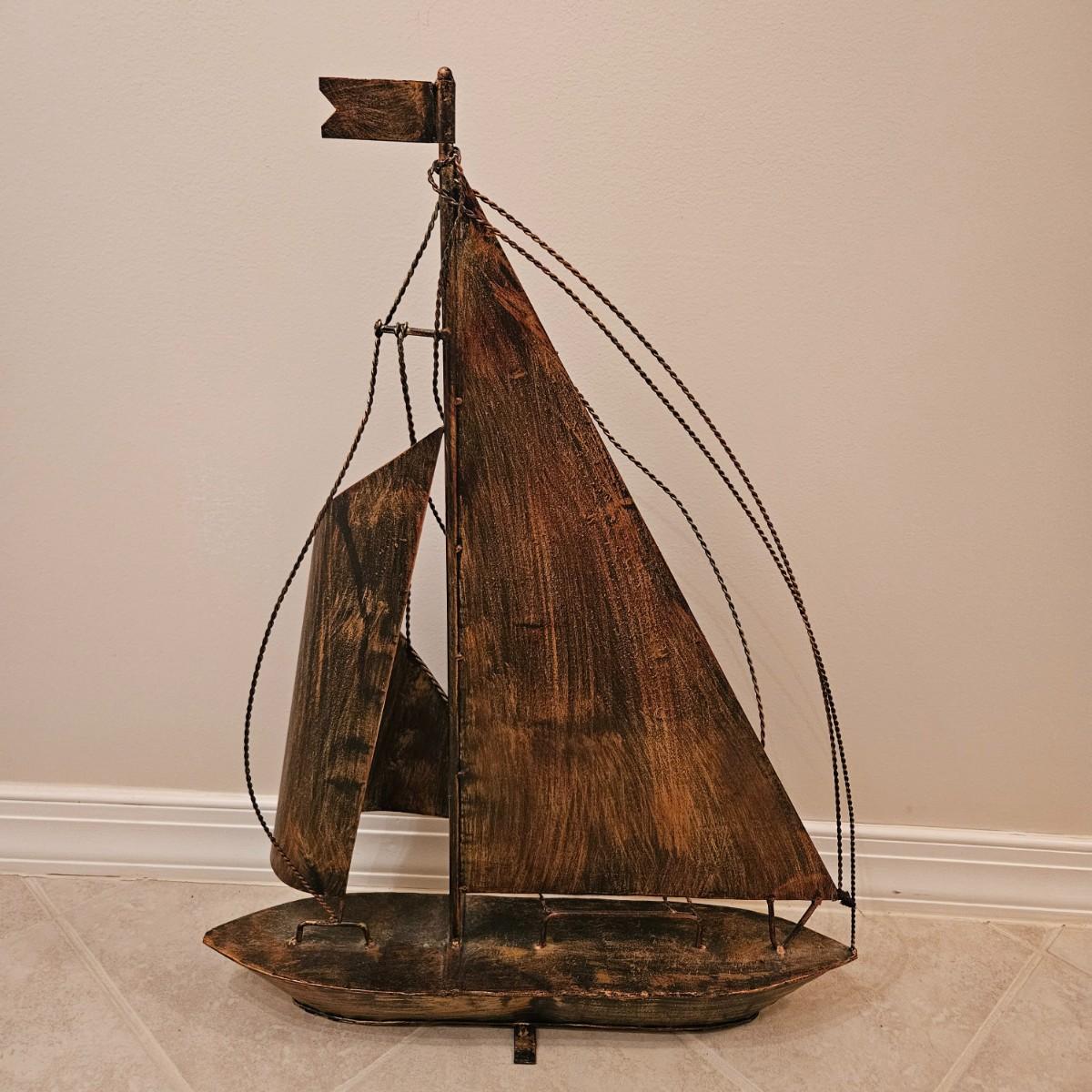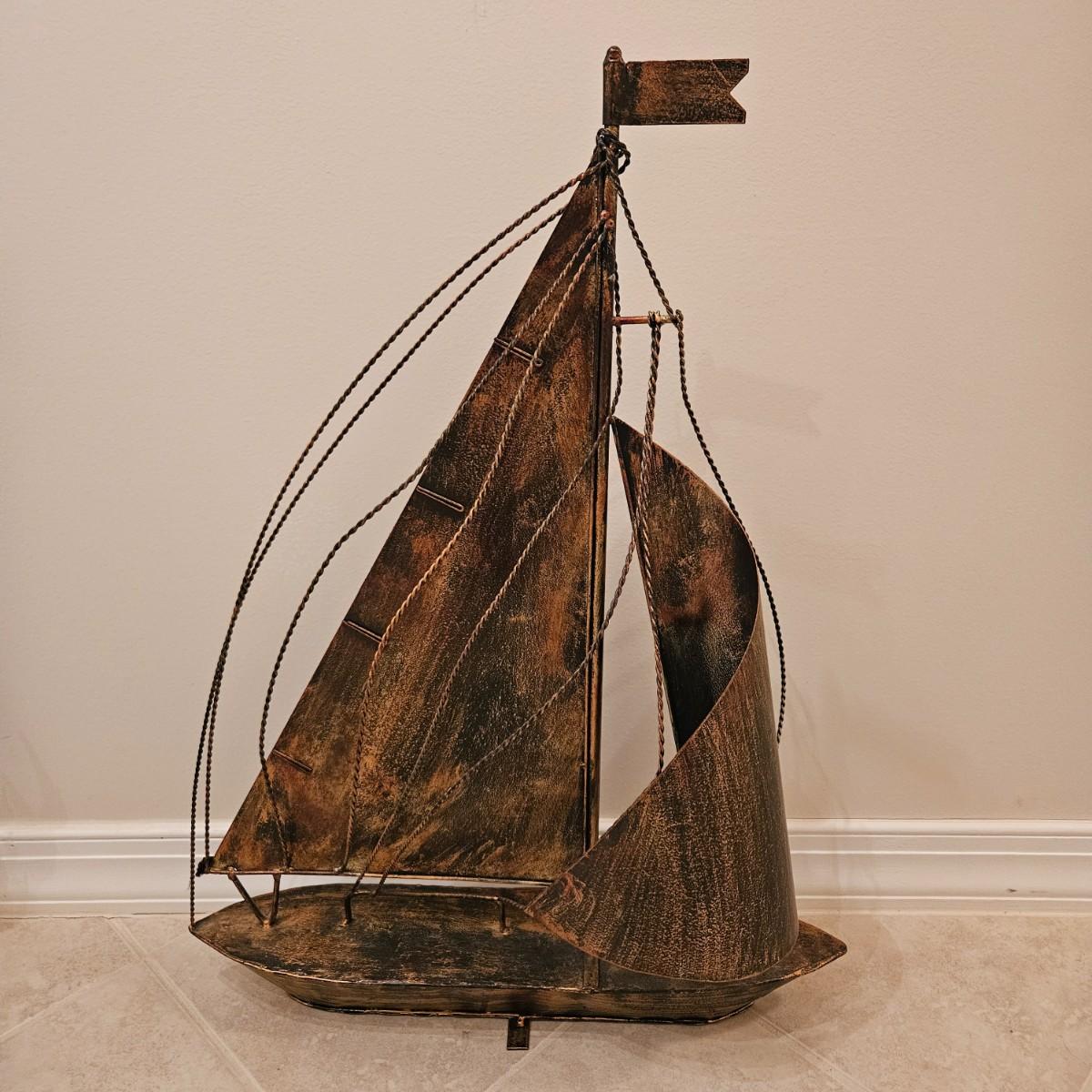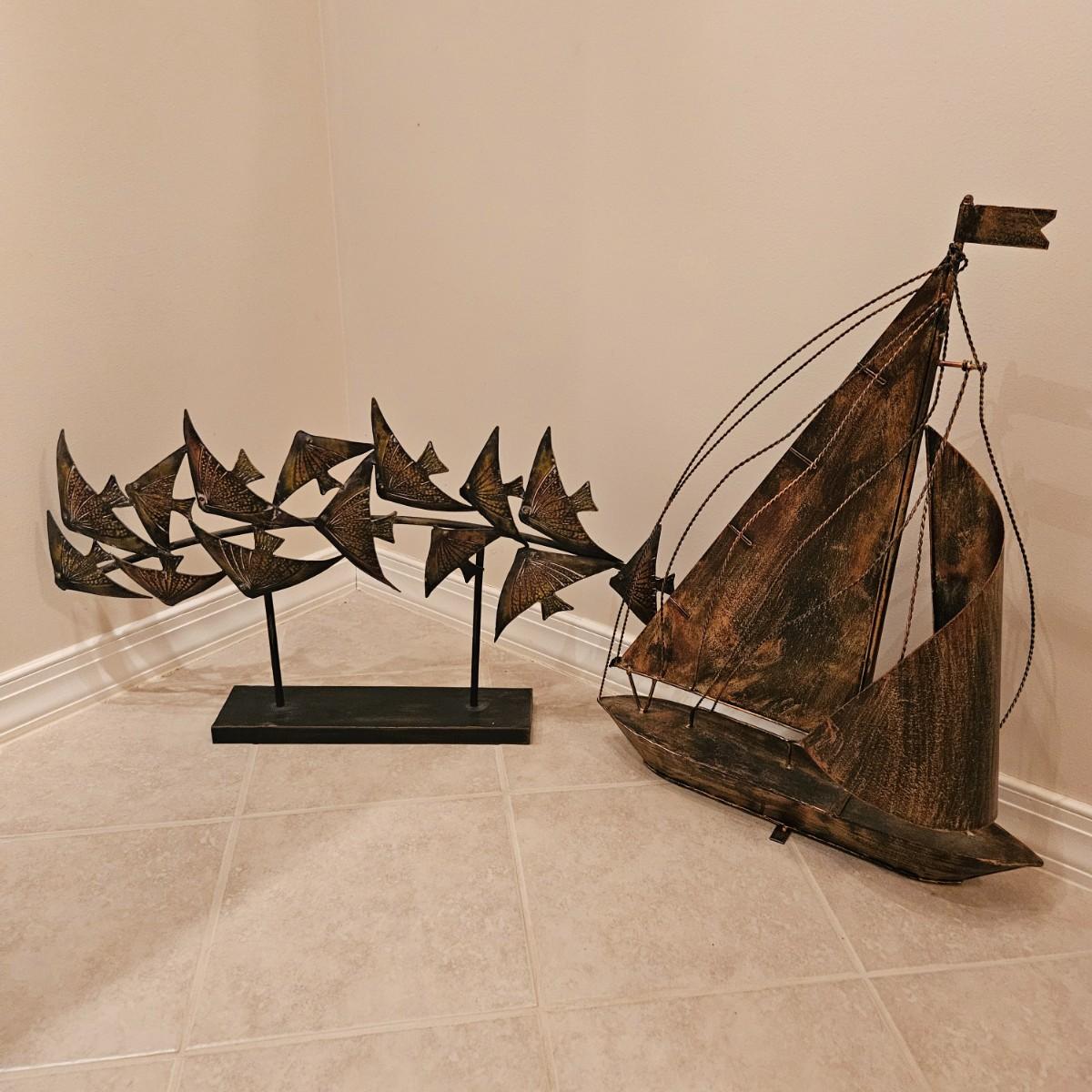 A pair metal art pieces that have a copper like finish. The ship measures approximately 20" x 4" x 27"H. Local pickup only