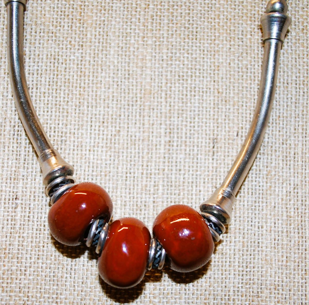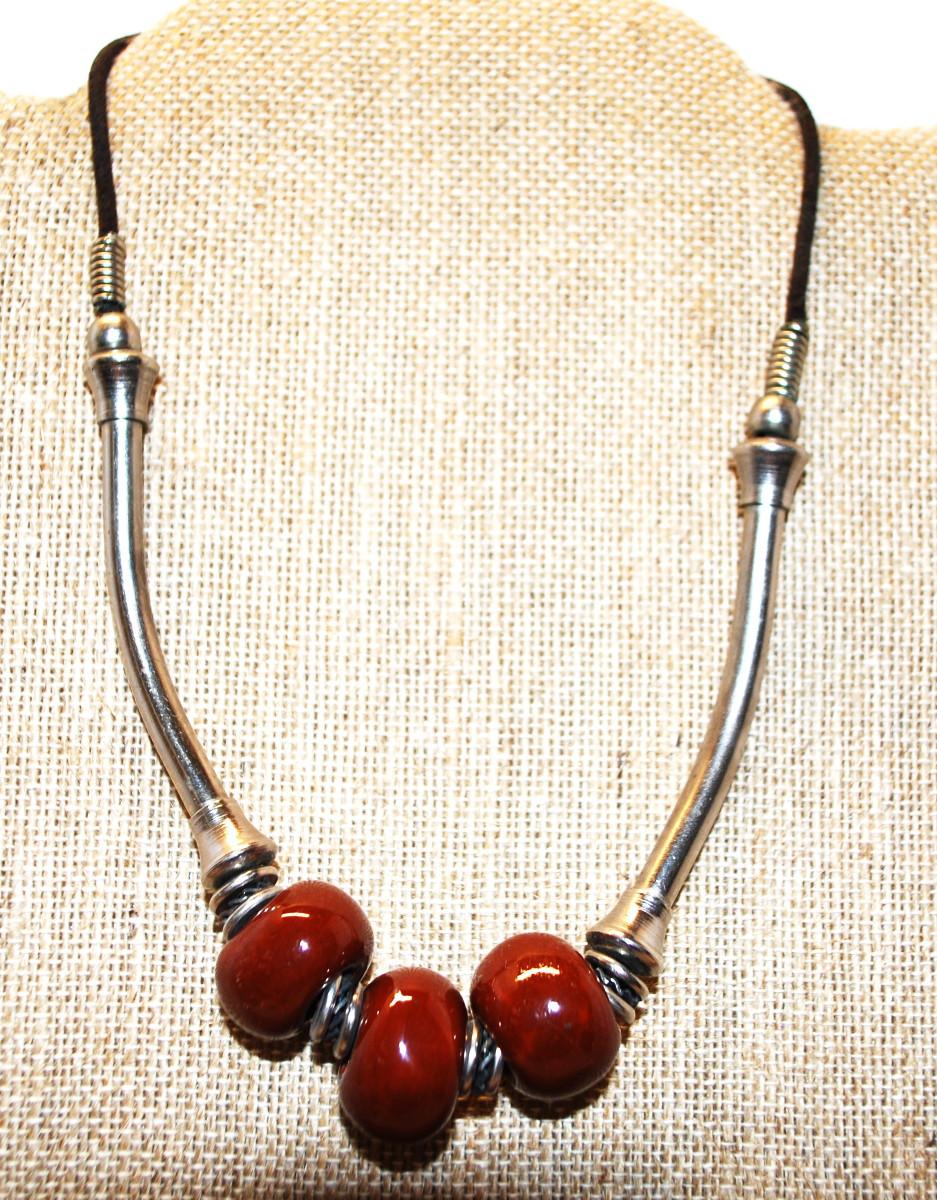Metal Side-Braced Necklace with Ceramic Brown Spheres Size 13"