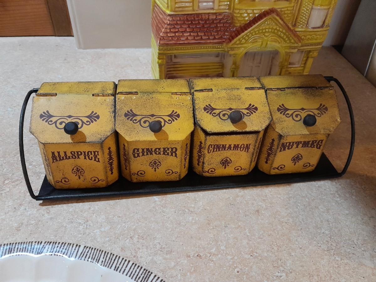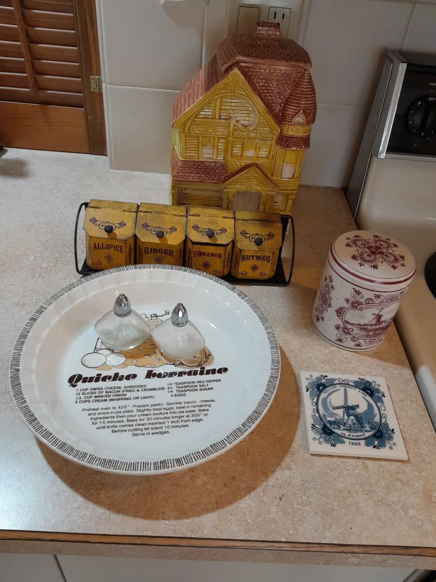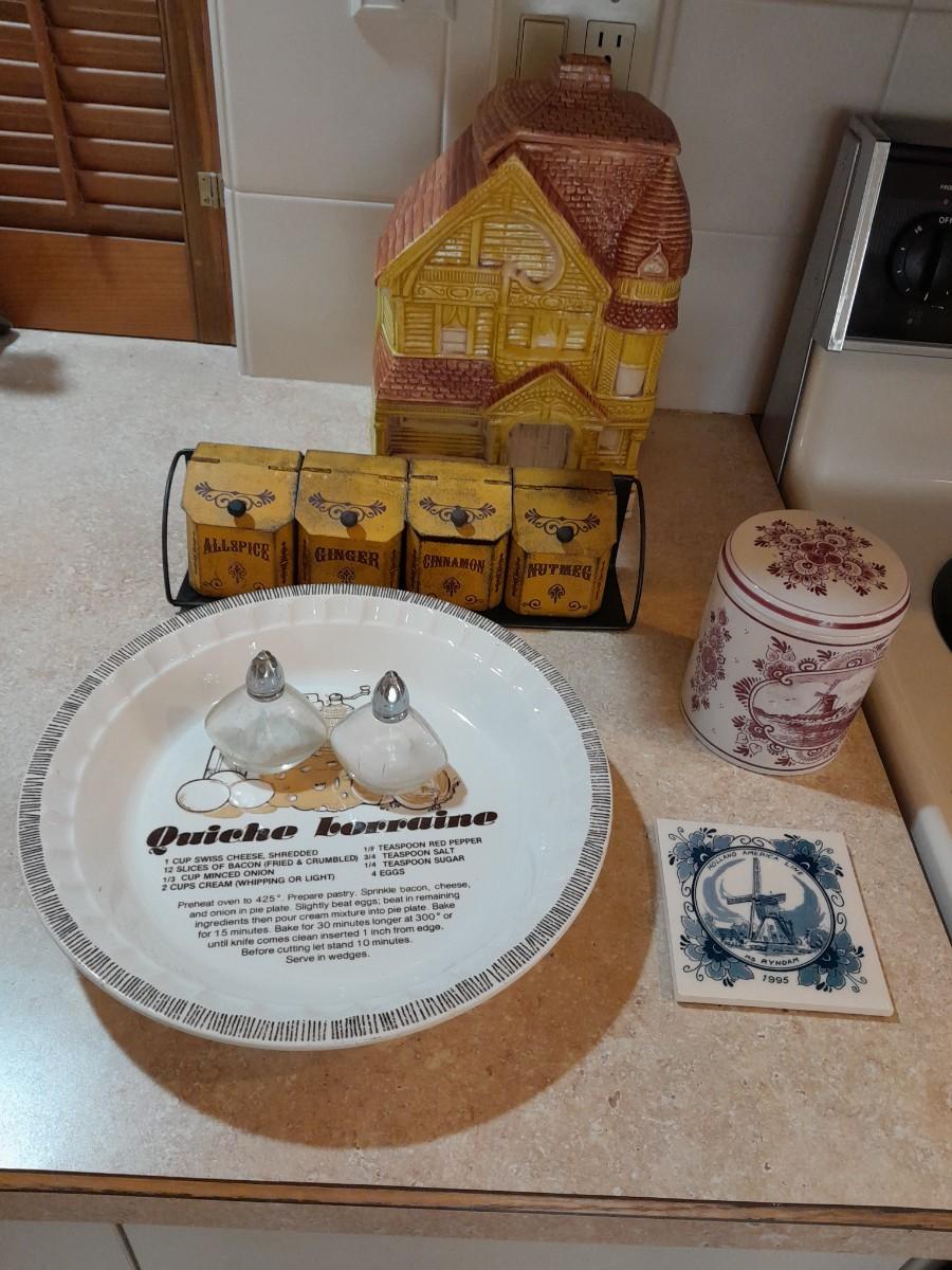 CUTE METAL SPICE CONTAINERS IN HOLDER, VINTAGE HOUSE SHAPED COOKIE JAR, QUICHE RECIPE PLATE AND MORE