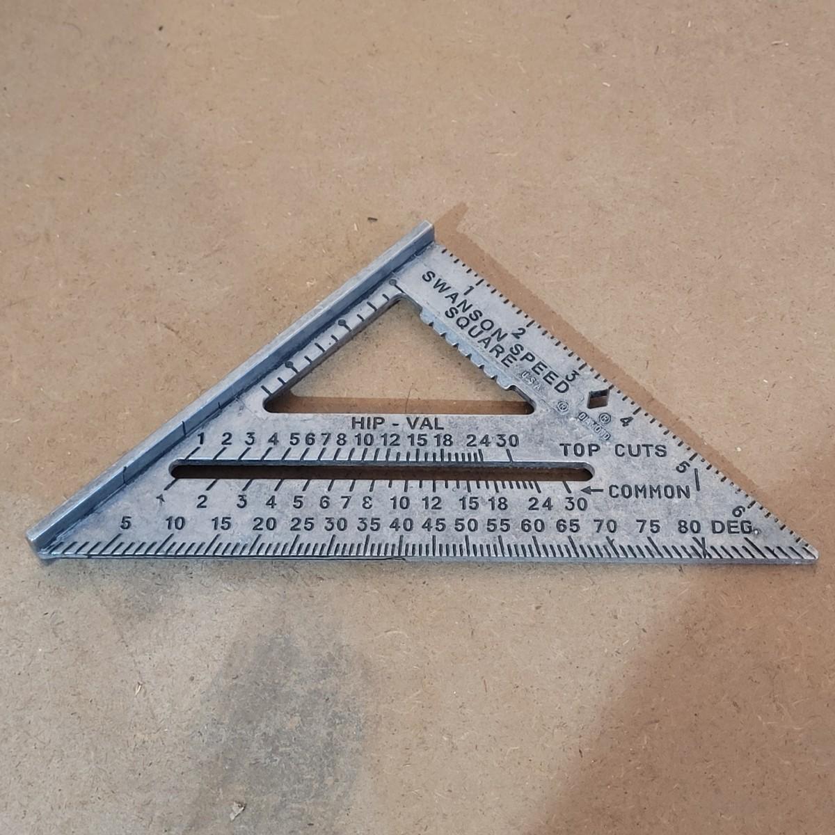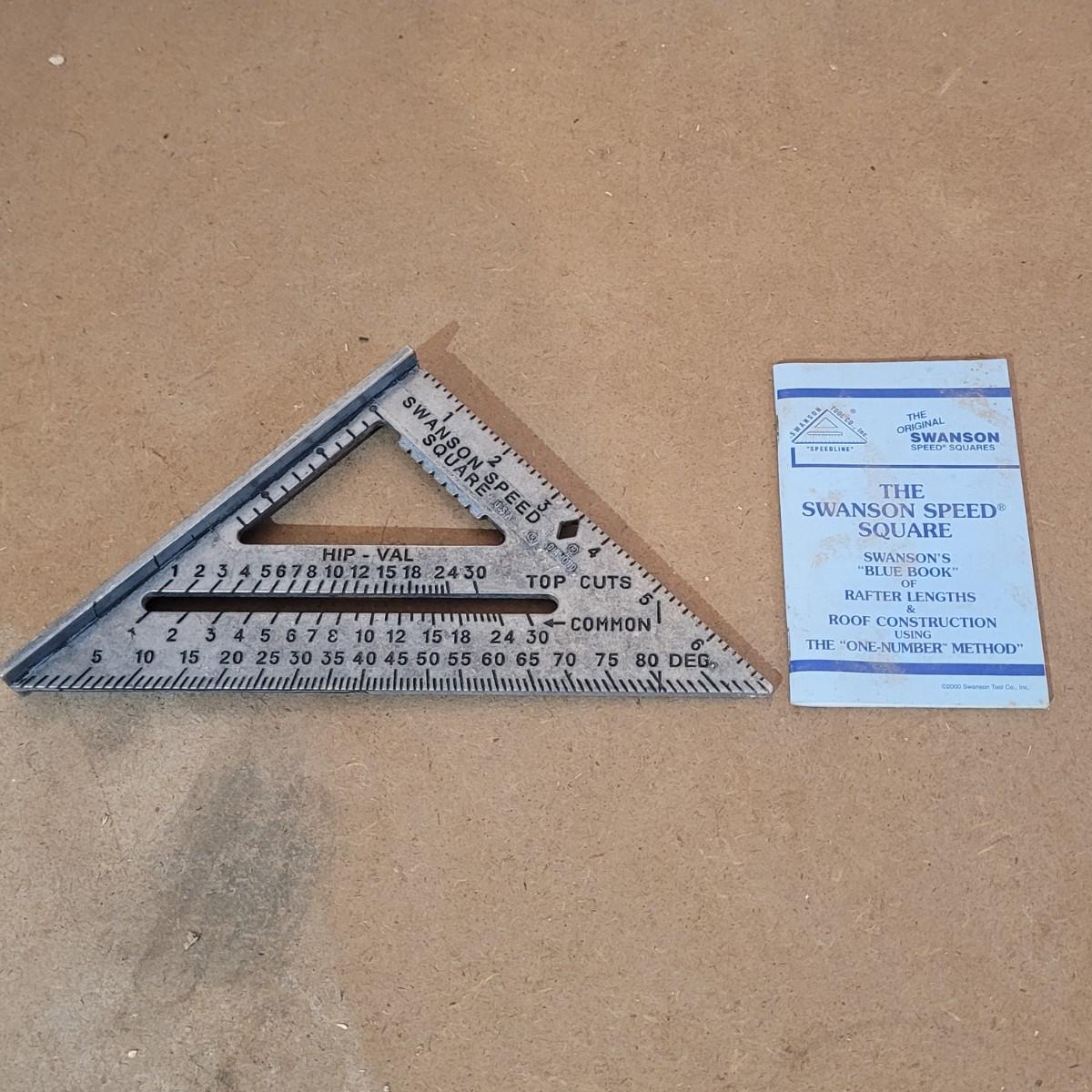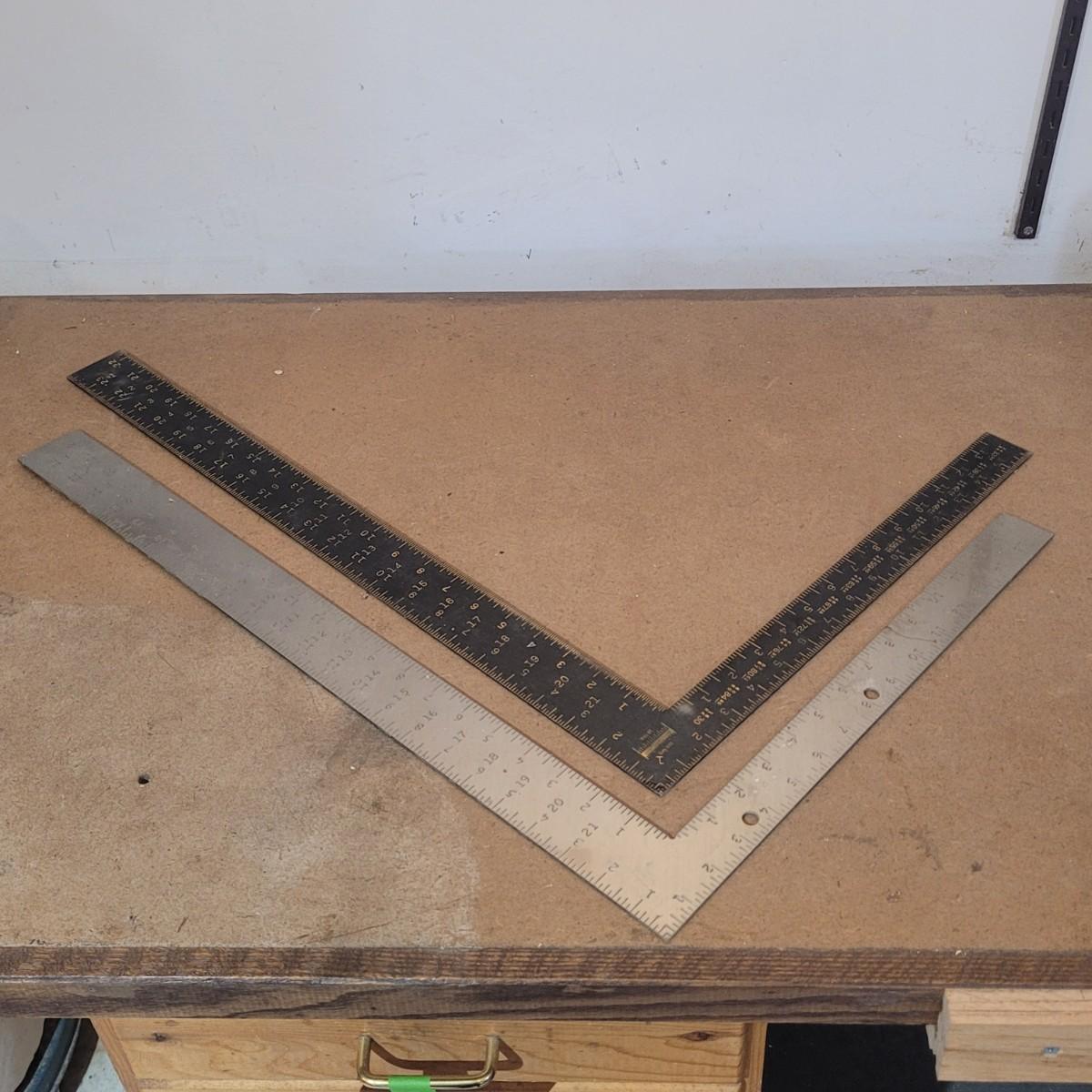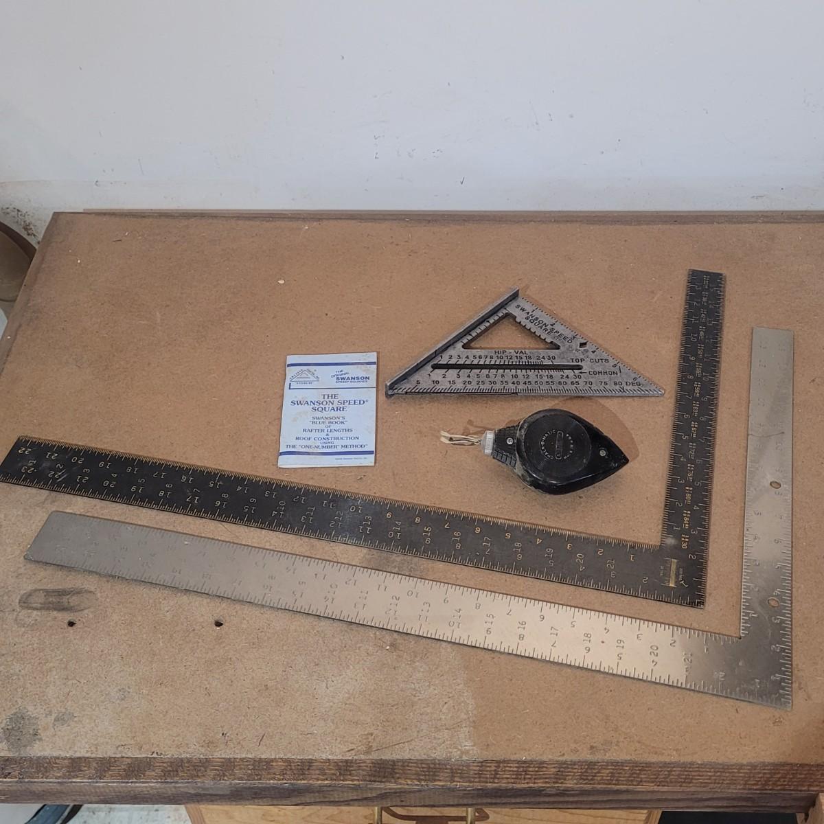 Two large traditional metal squares. Includes a Swanson speed square with original instructions. Also includes Stanley brand chalk line.