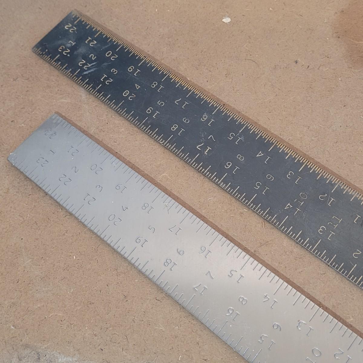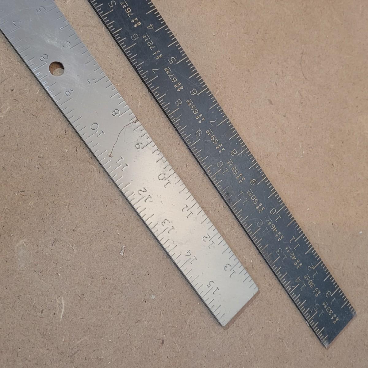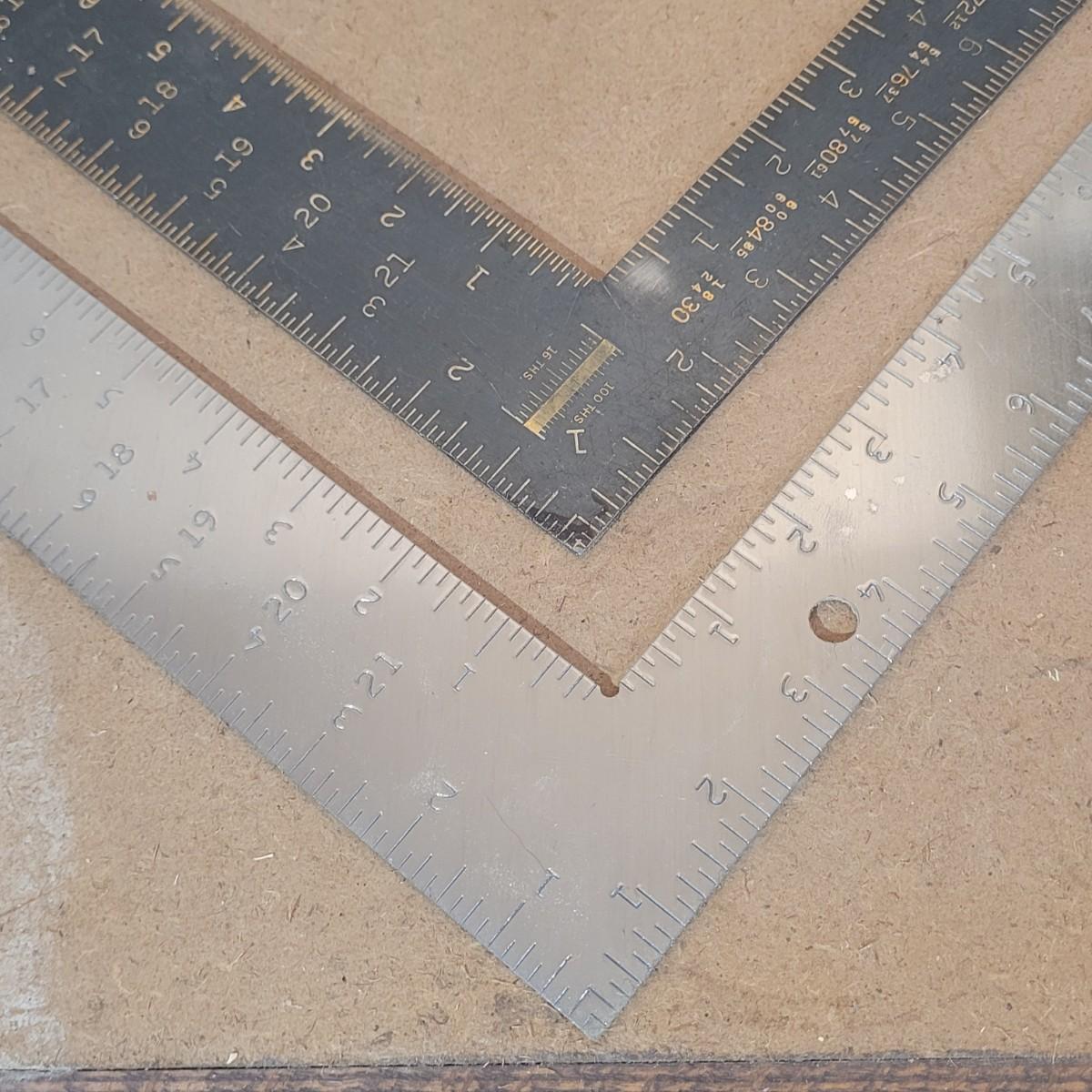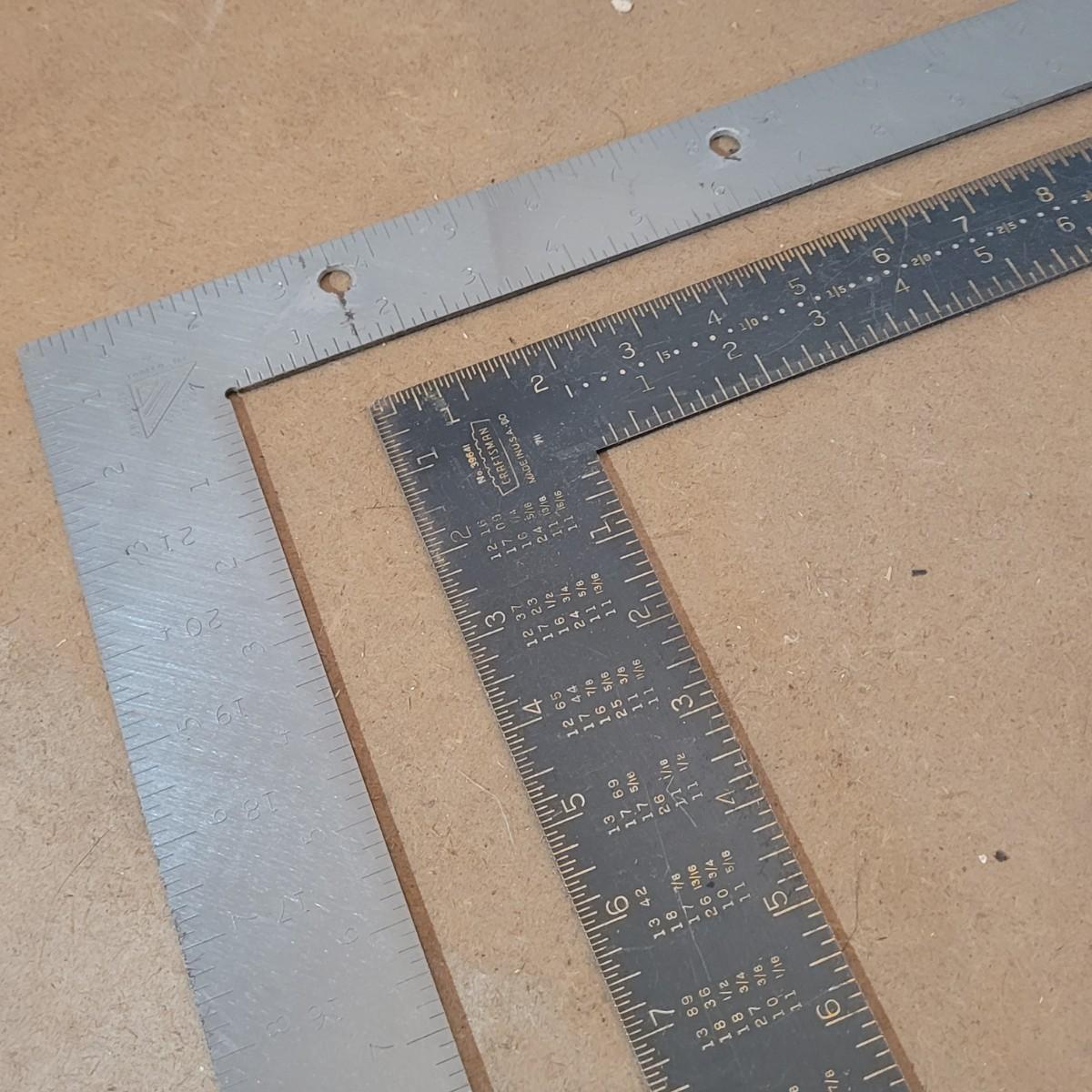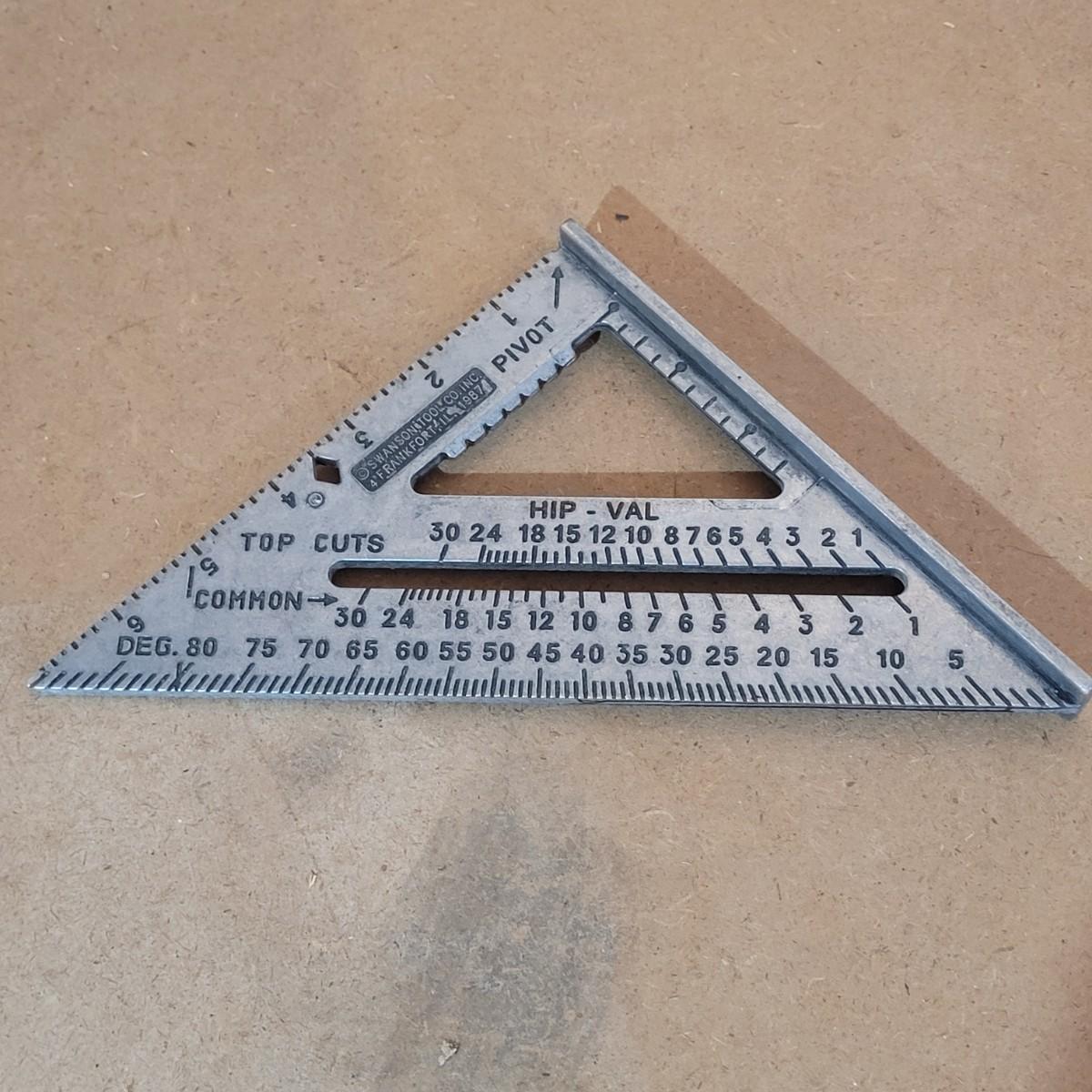 Two large traditional metal squares. Includes a Swanson speed square with original instructions. Also includes Stanley brand chalk line.