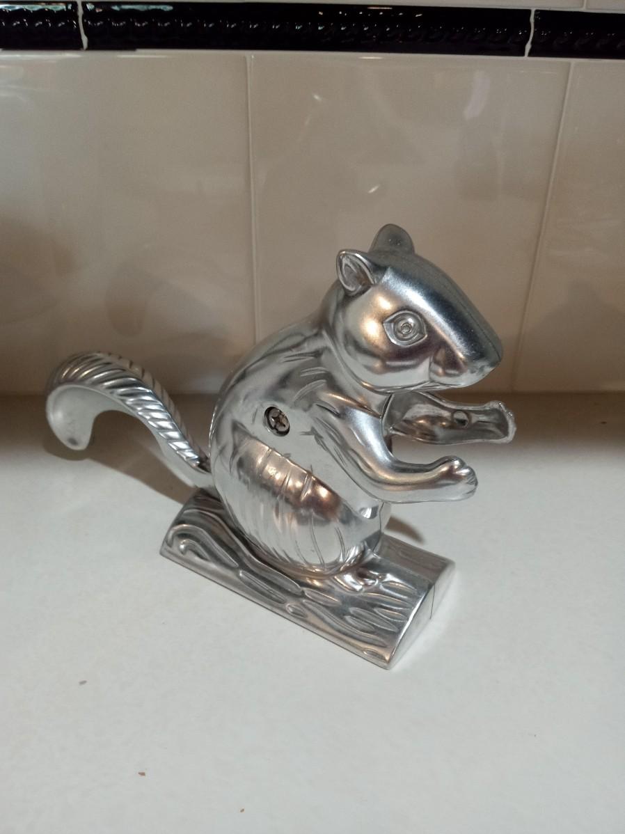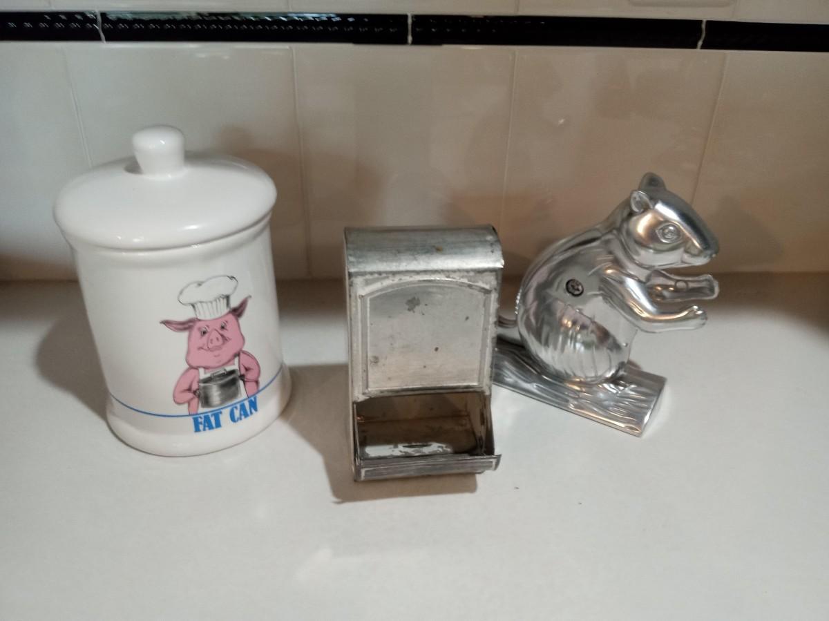 METAL SQUIRREL NUT CRACKER, MATCH HOLDER AND FAT CAN