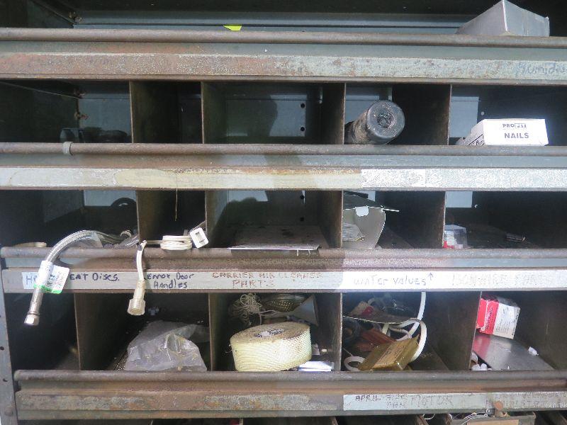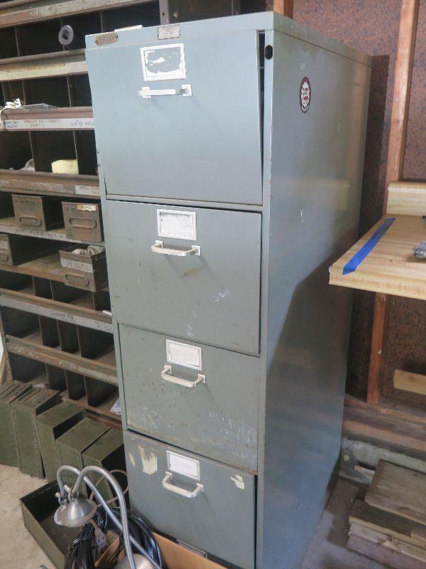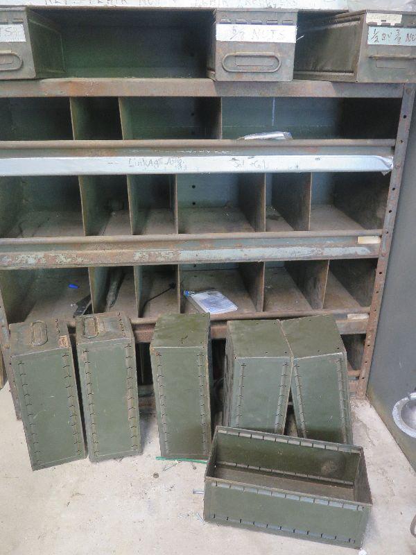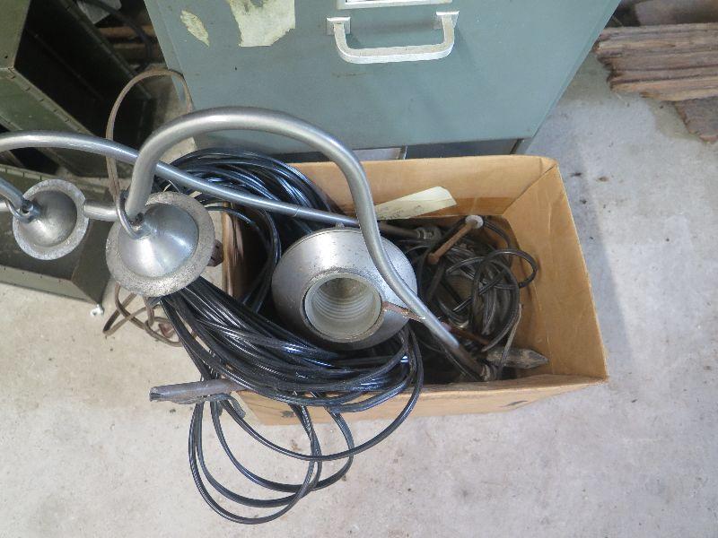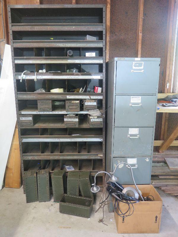 Metal tool cabinet with removable metal bins. All contents included. Metal file cabinet, and outside lighting system, untested.
