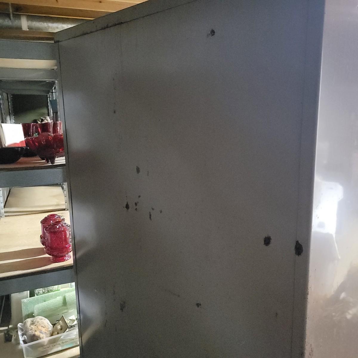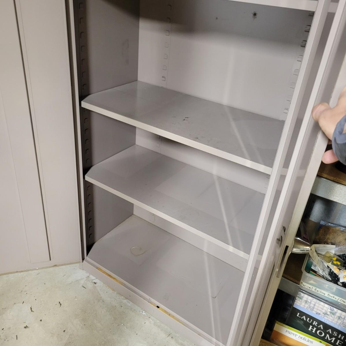 A two door metal storage cabinet with five adjustable shelves. It measures approximately 36" x 18" x 72"H. Local pickup only. Winning bidder must bring assistance to help move and load this item due to its weight and/or size.