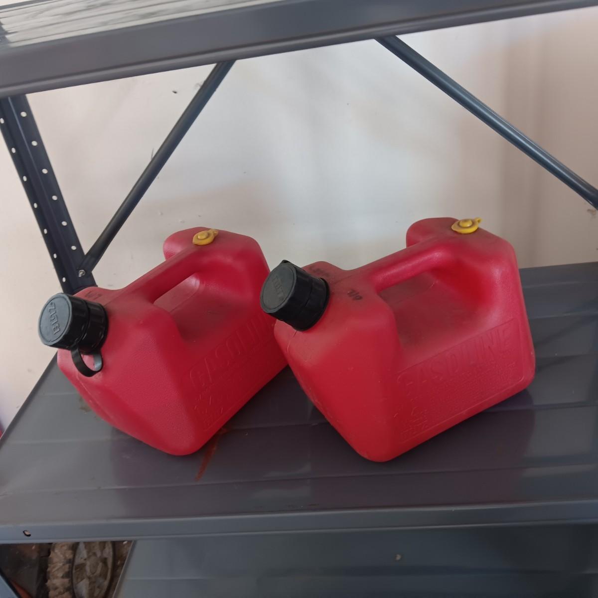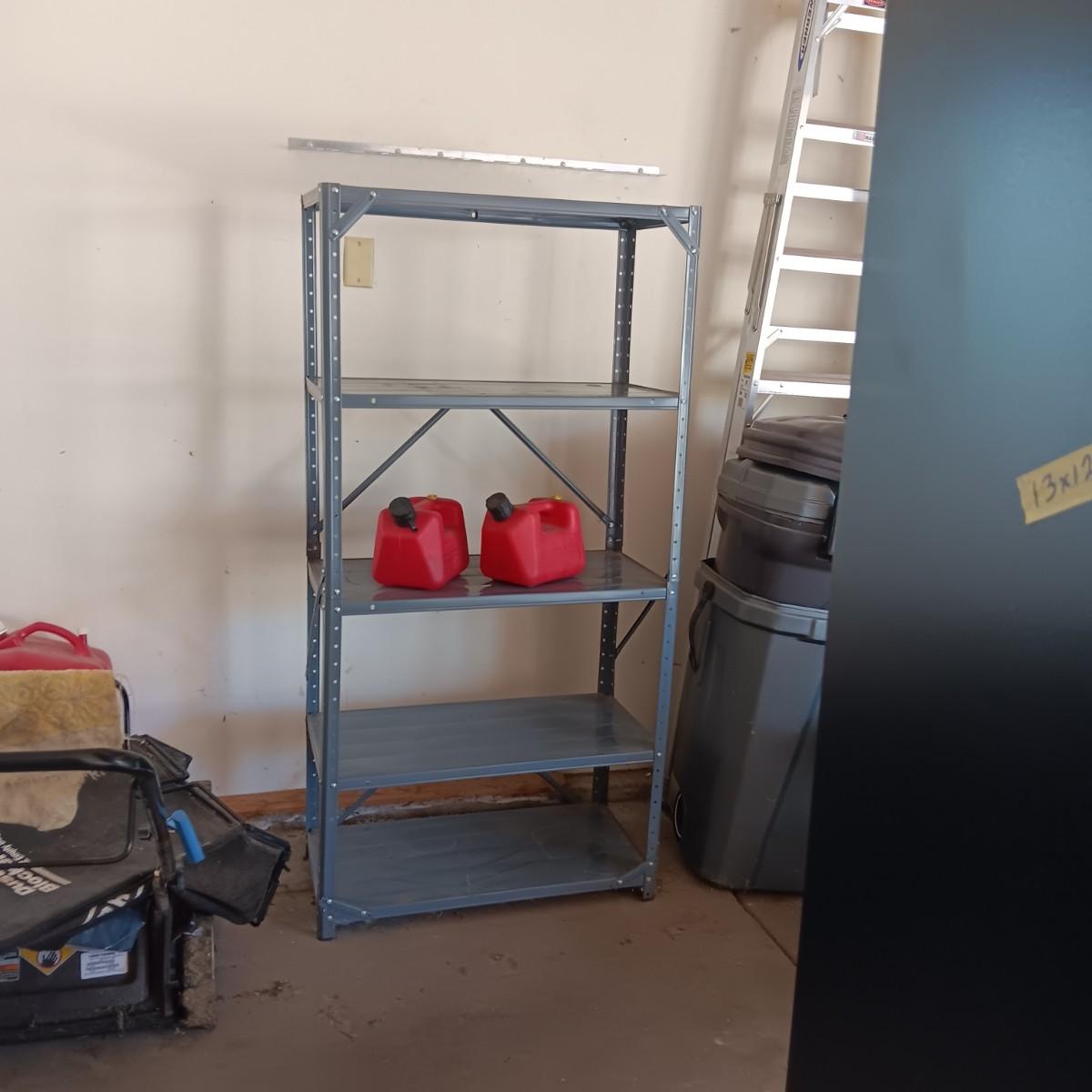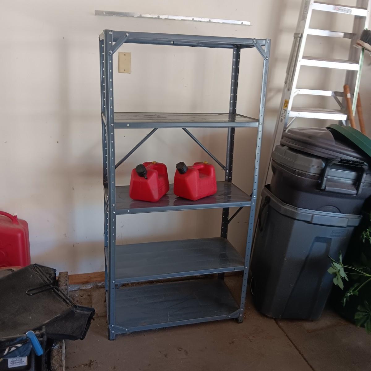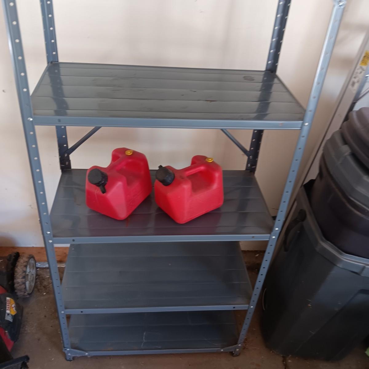 METAL STORAGE SHELF AND 2 PLASTIC GAS CANS