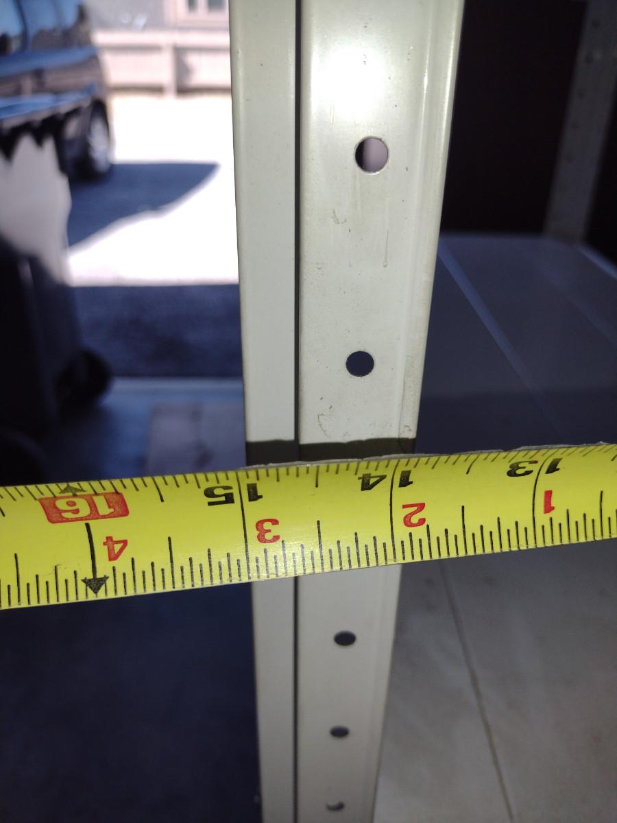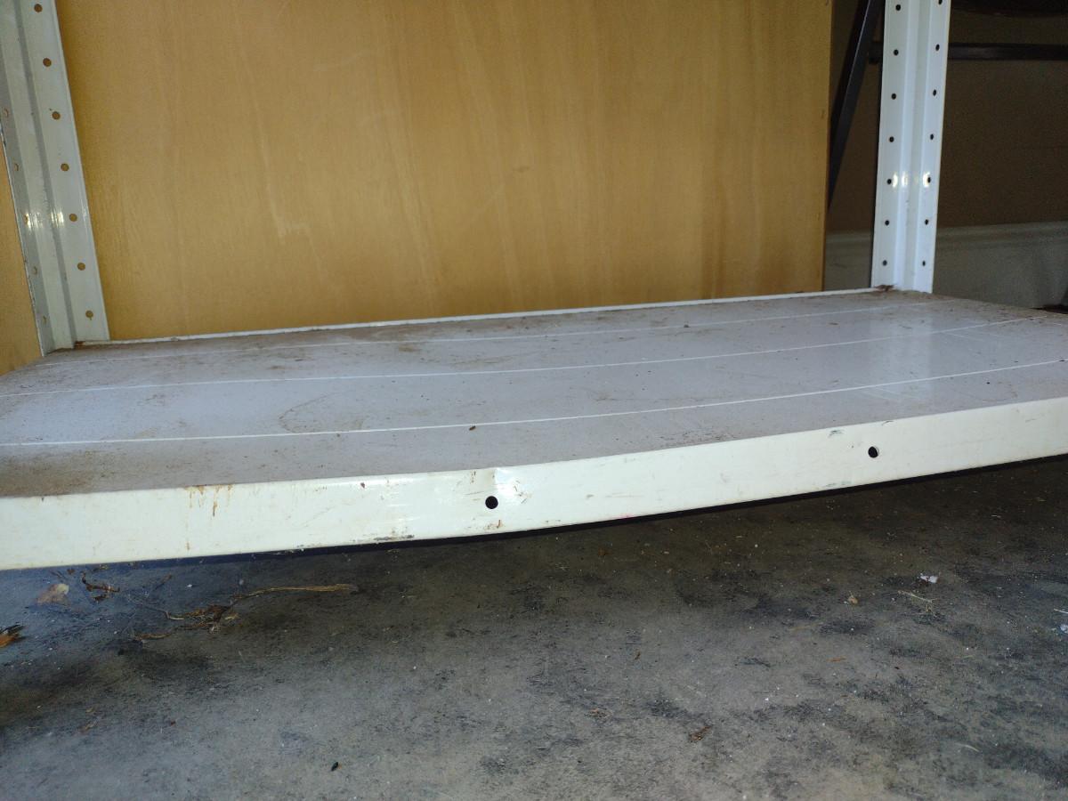 Metal Storage Shelf- Approx 30" x 15" x 58" Tall. Bottom shelf has been bent- please see all pictures.