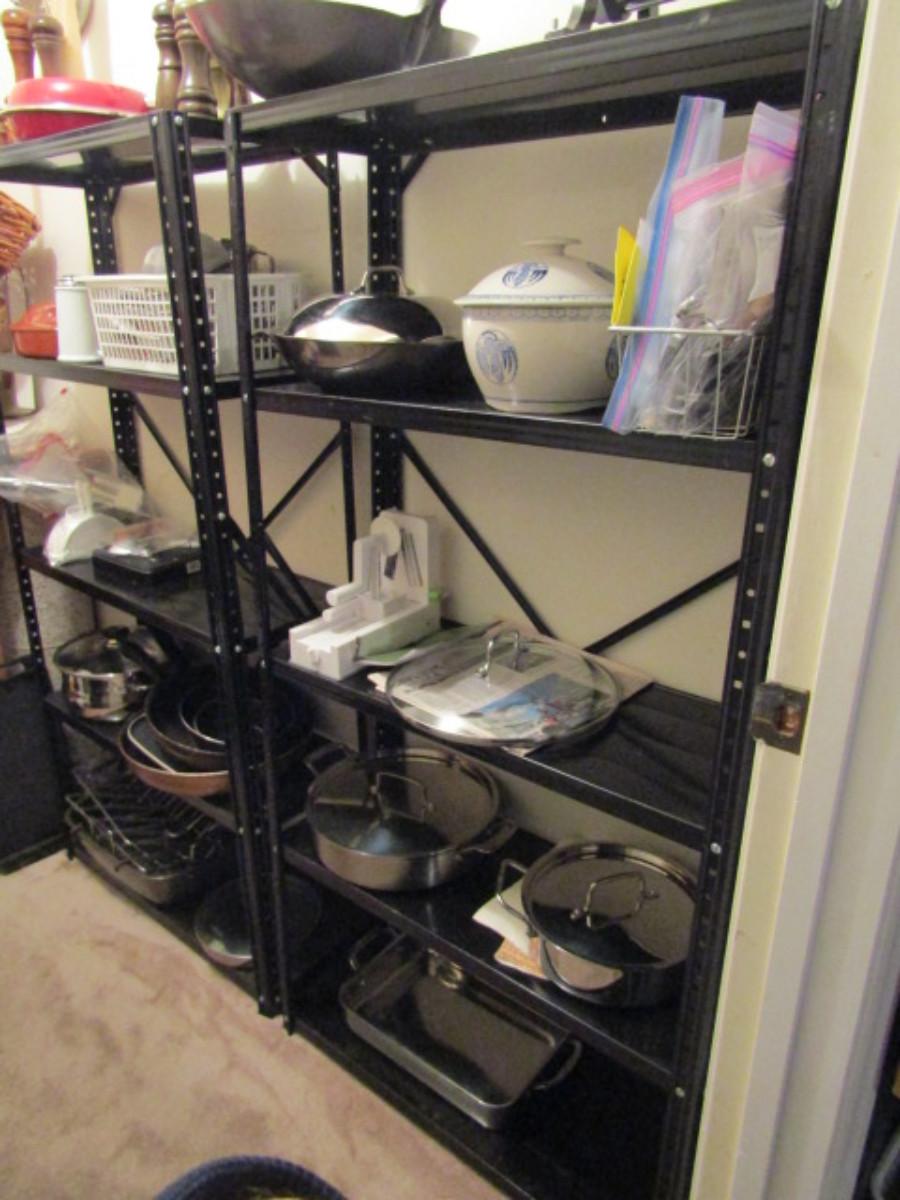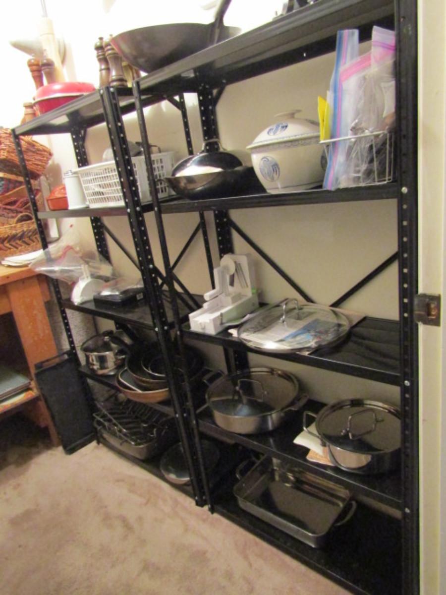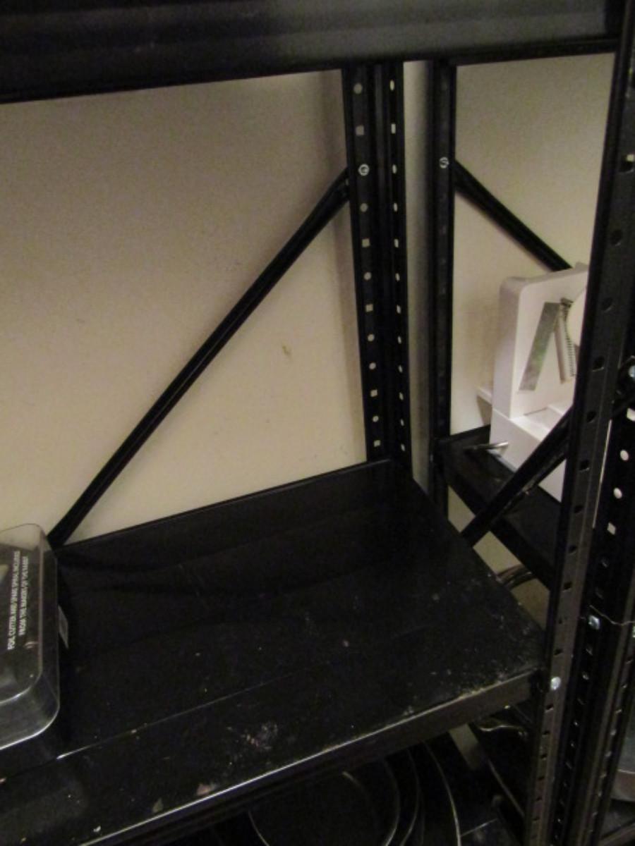 Metal Storage Shelf (No Contents). The top shelf has a dent- please see pictures.
