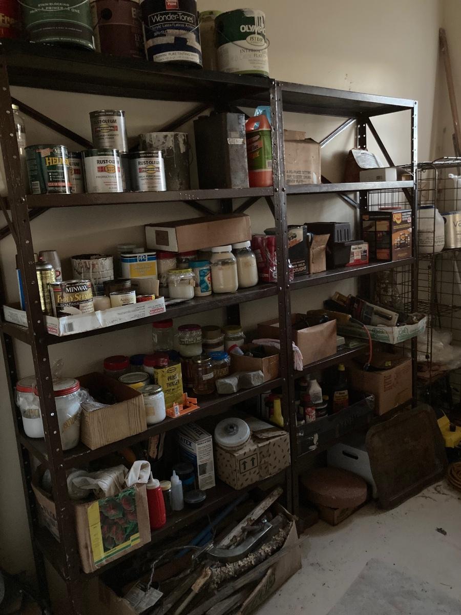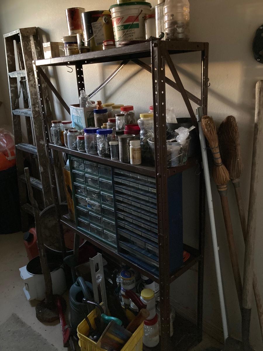Lot of 3 metal storage shelves: 1 shelf is approx 3’w x 1’d x 5’h, with 4 shelves;