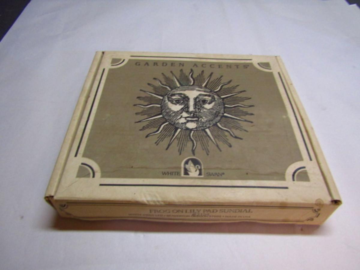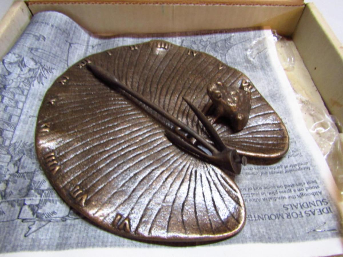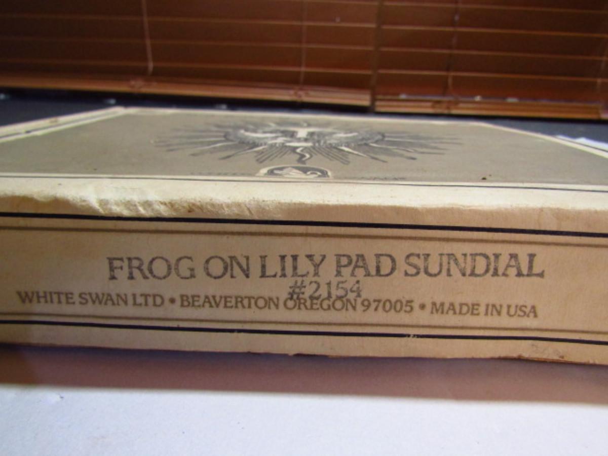 Metal Sundial- Frog on Lilly Pad (G). New in box. Measures approx 7" x 7".