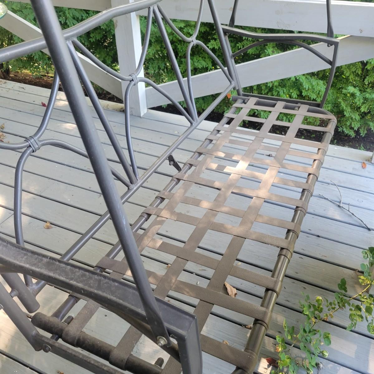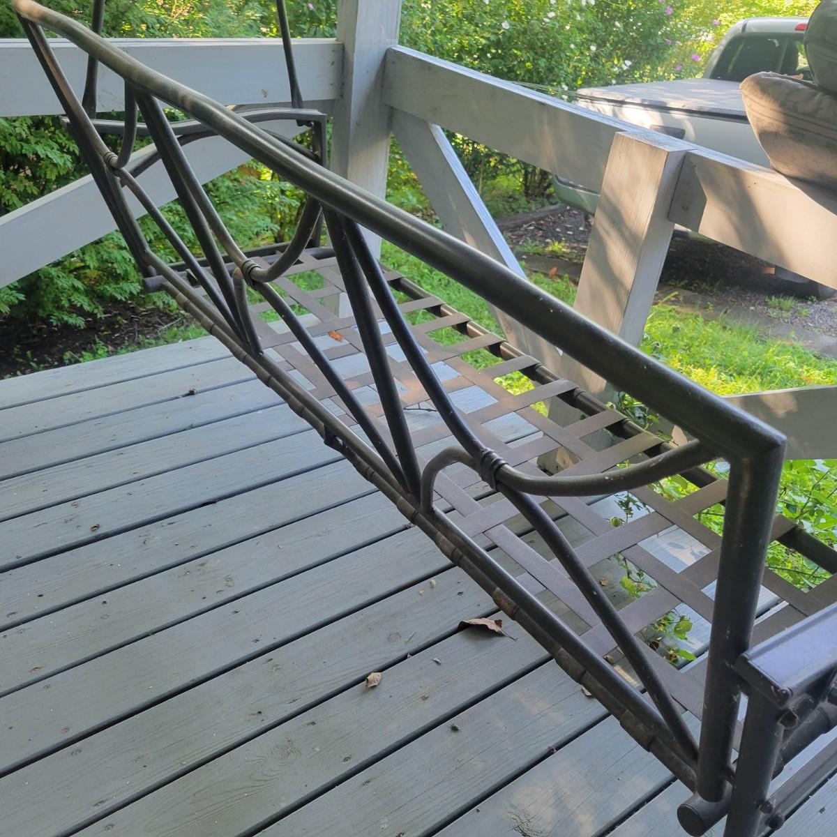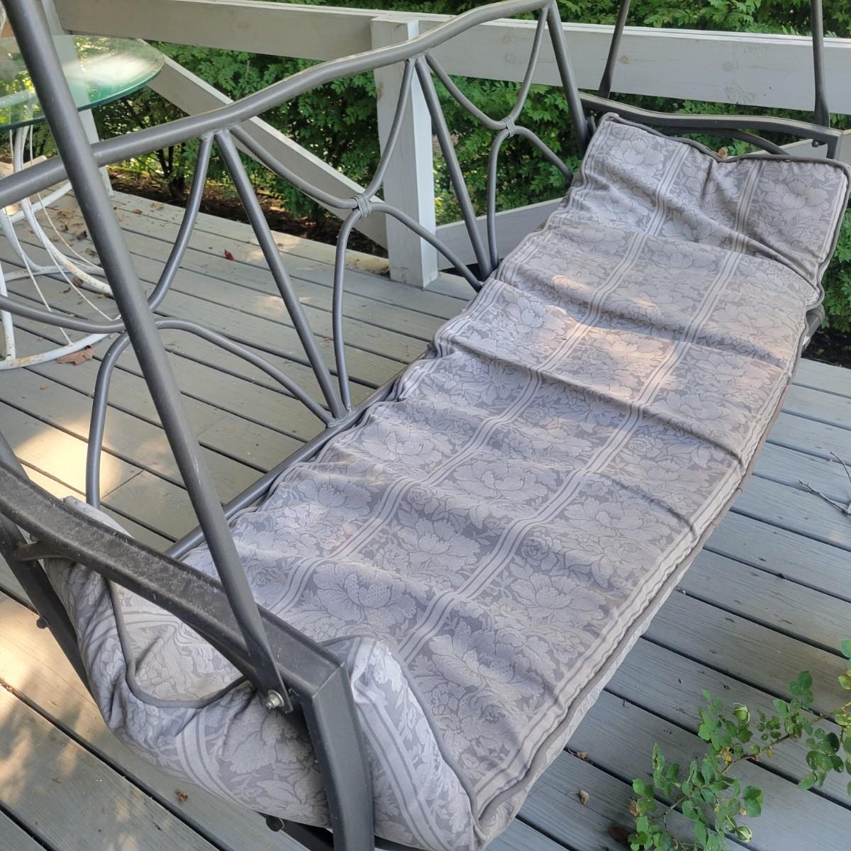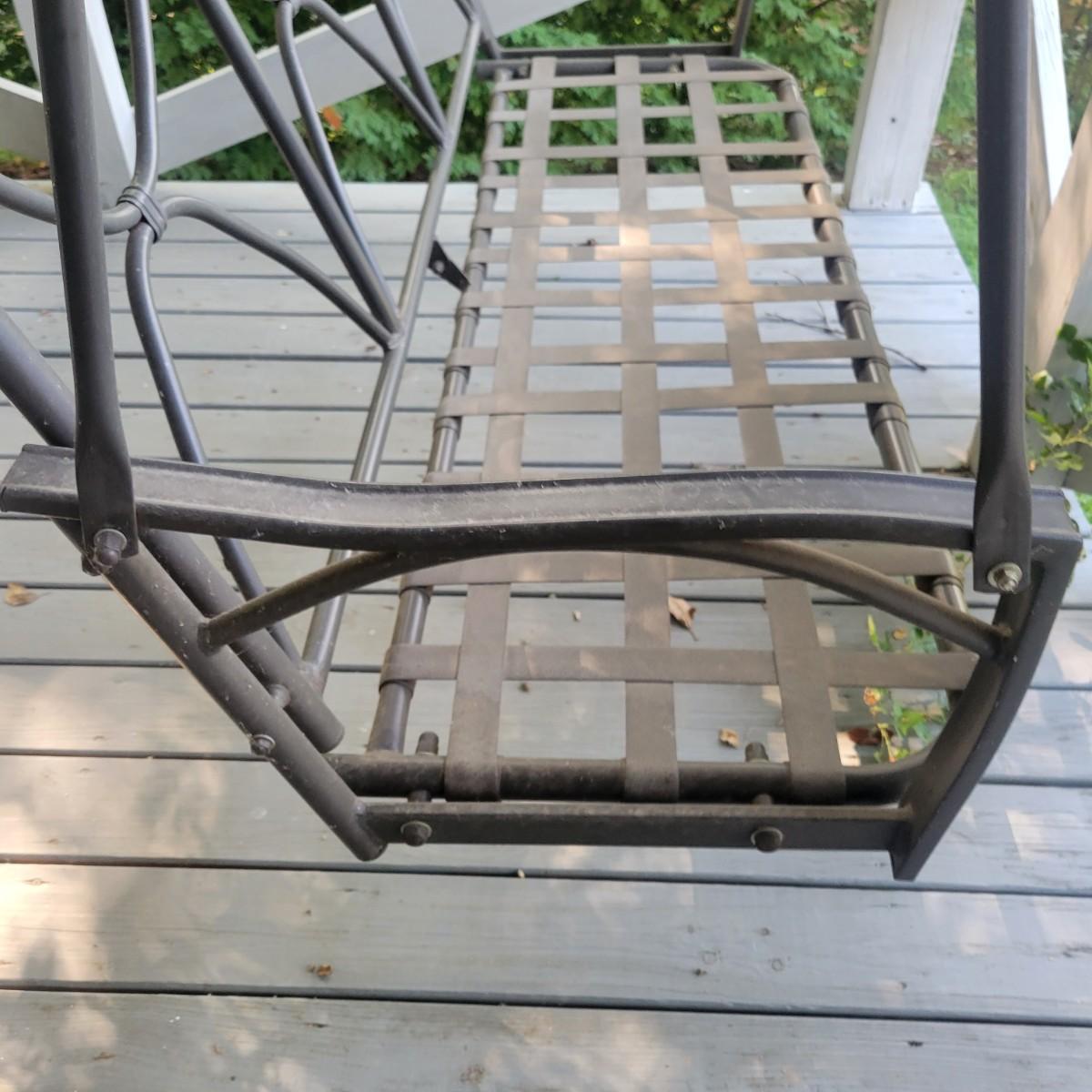 A couch sized metal swing that includes a cushion. Swing is is good condition with some minor rust and a few scratches. The frame of the swing is metal and the seat support is plastic straps. Swing measures approximately 61" x 24" with a seat height based on hanging . Chains and hooks are included, but winning bidder will need tools to remove the chains and/or the hooks. Local pickup only