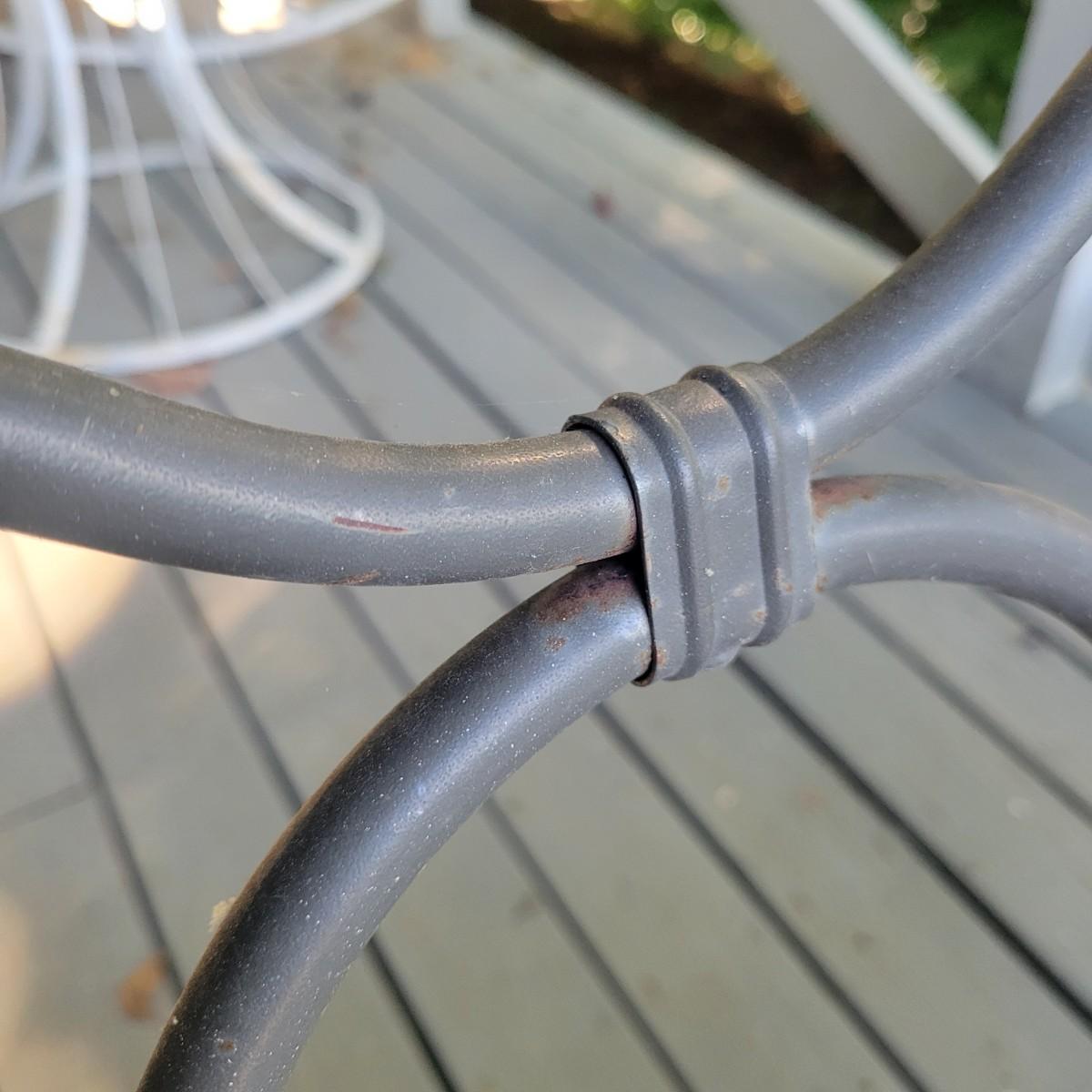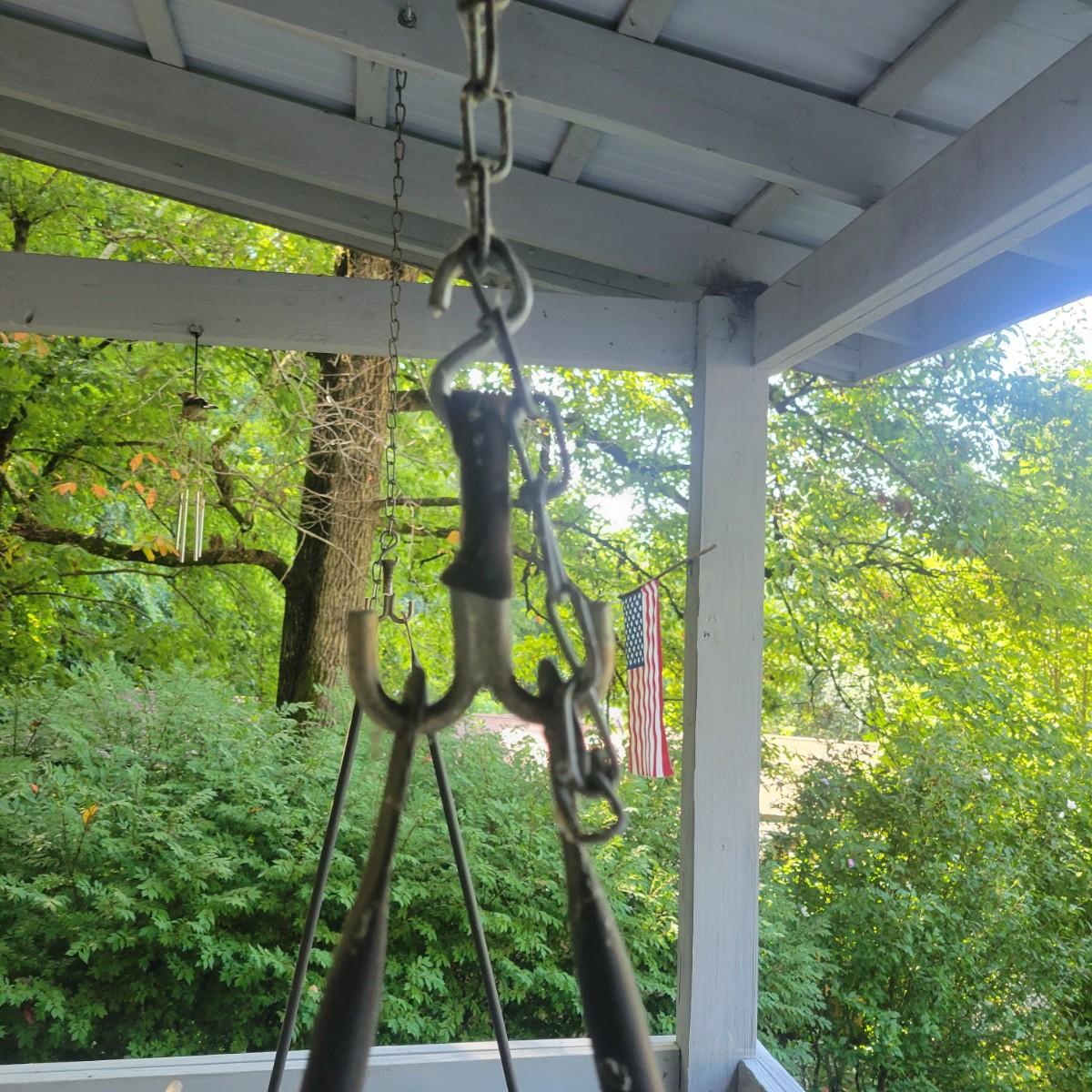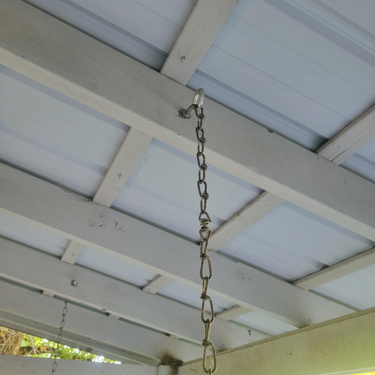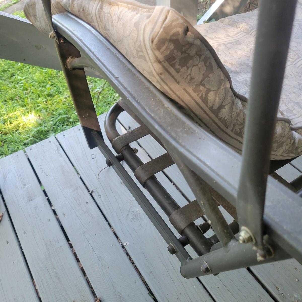 A couch sized metal swing that includes a cushion. Swing is is good condition with some minor rust and a few scratches. The frame of the swing is metal and the seat support is plastic straps. Swing measures approximately 61" x 24" with a seat height based on hanging . Chains and hooks are included, but winning bidder will need tools to remove the chains and/or the hooks. Local pickup only