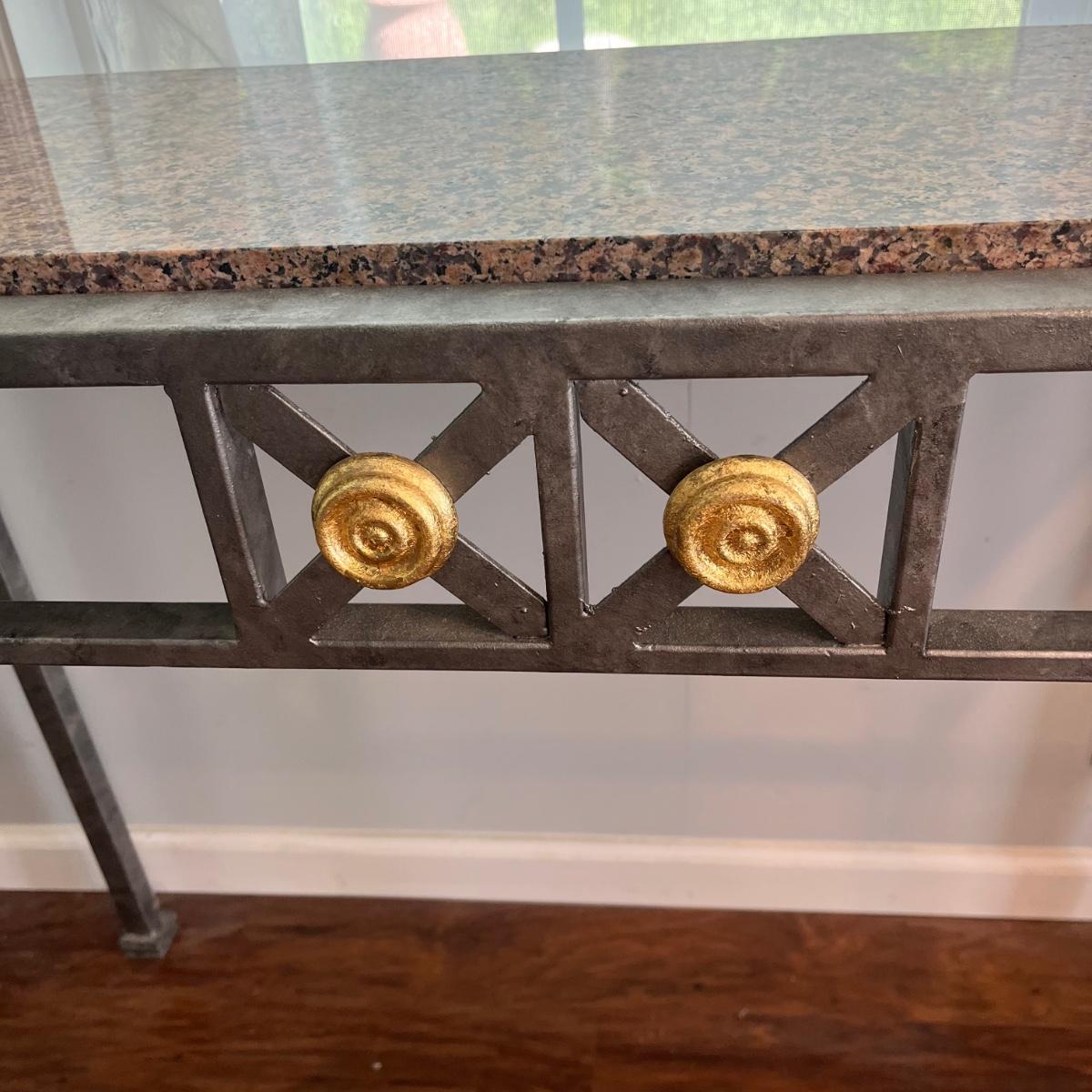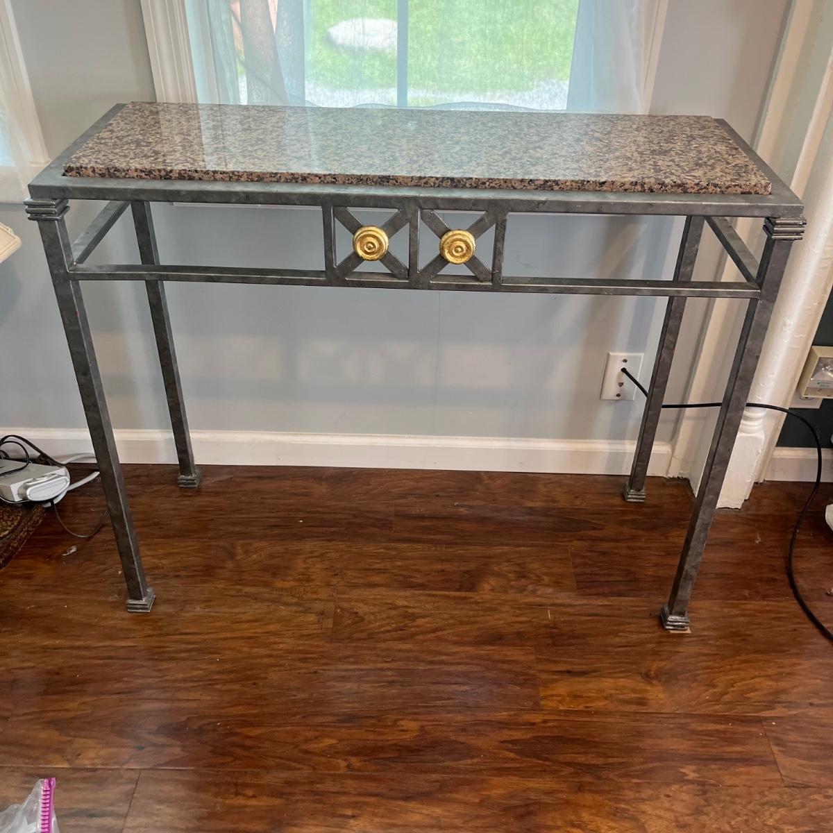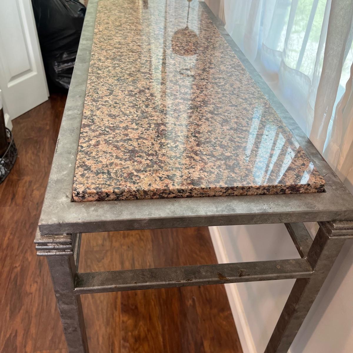 Lot includes a narrow metal table with a stone piece set on top. Table measures 15” x 39” x 32”H.